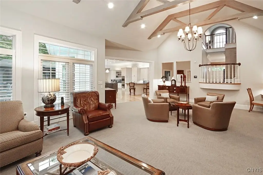 Tucked at the end of a quiet cul-de-sac in prestigious Waterford Woods, this bespoke estate blends masterful craftsmanship with refined living. Reimagined for today's luxury buyer, every detail from intricate millwork to soaring ceilings and curated finishes exudes timeless sophistication. Manicured landscaping, stone accents and a brick walkway leading to a stately portico with arched brickwork lend the home distinguished curb appeal. Inside, the grand two-story foyer impresses with a sweeping staircase, elegant wainscoting and crystal chandelier. Rich hardwood floors, coffered ceilings and distinctive architectural details reflect a home crafted for enduring quality. A private study opens to a cherry-paneled library with a wet bar, fireplace and French doors leading to a spacious screened-in room ideal for indoor/outdoor living. Formal living and dining rooms exude classic elegance, while the gourmet kitchen is a chef's dream, boasting a center island/breakfast bar, high-end appliances, double ovens, walk-in pantry and casual dining area. Seamlessly flow into a vaulted family room with a fireplace flanked by custom cabinetry and exposed beams. Two powder rooms, a gracious entry hall and rear staircase complete the main level. Upstairs offers 4 bedrooms and 3 baths, including a luxurious primary suite with fireplace, sitting area, spa-inspired bath, expansive walk-in closet and serene views. Two bedrooms share a Jack-and-Jill bath, while the fourth has its own ensuite. A sitting area, laundry and bonus space round out the upper floor. The walkout lower level adds 2400 sq ft (incl in total) and is a true showstopper, channeling Adirondack charm with open woodwork, cobblestone fireplace, full bar, wine cellar, gym, recreation and billiard rooms and a private guest suite. Outside, a private, tree-lined lot encloses an outdoor oasis featuring a built-in grill station, firepit, hot tub and sprawling courtyard patio. This exceptional home offers a floor plan designed for both grand entertaining and serene everyday living. This is more than a home it's a lifestyle defined by privacy, quality and quiet luxury. Award winning Fayetteville-Manlius Schools!