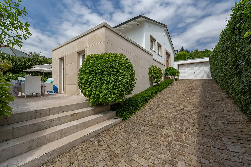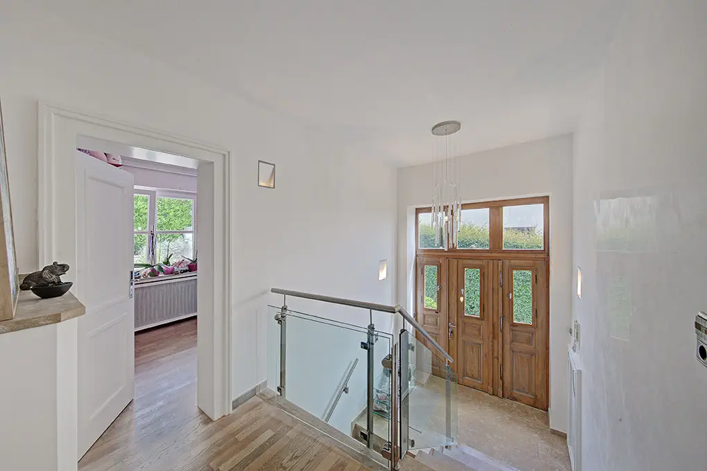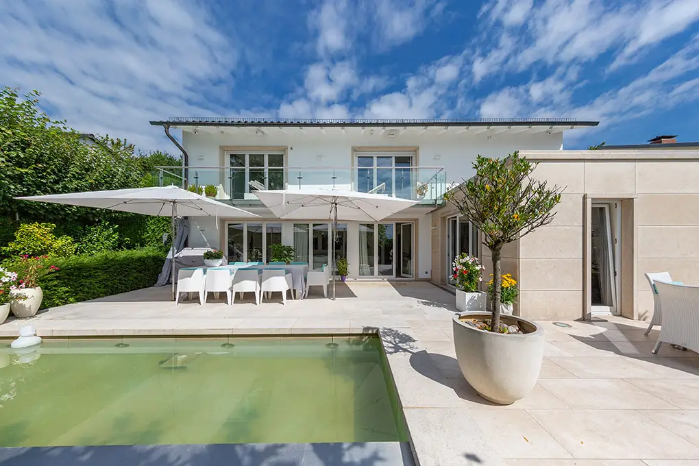 This top-class detached family home awaits you in the middle of a quiet cul-de-sac in Dortmund's sought-after Sommerberg district. With a high degree of privacy, the property presents itself as a true hideaway for discerning families or couples with an appreciation for quality, design and comfort. Even the driveway through the private access gate conveys a feeling of exclusivity and security. The open-plan living and dining area impresses with its spaciousness, high-quality materials and seamless transition to the designer kitchen with state-of-the-art appliances. Large glass surfaces let in plenty of light and provide a view of the spacious terrace with a natural stone infinity water overflow pool - stylishly illuminated for special evening hours. At the rear of the house is another lovingly designed outdoor area with a heated pool - ideal for relaxing and enjoying warm days in absolute tranquillity. The space on offer comprises three comfortable bedrooms, including an elegant master bedroom with stunning views, two tastefully appointed bathrooms and additional usable areas that can be used flexibly. A spacious double garage also offers ample space for two vehicles and additional storage space.