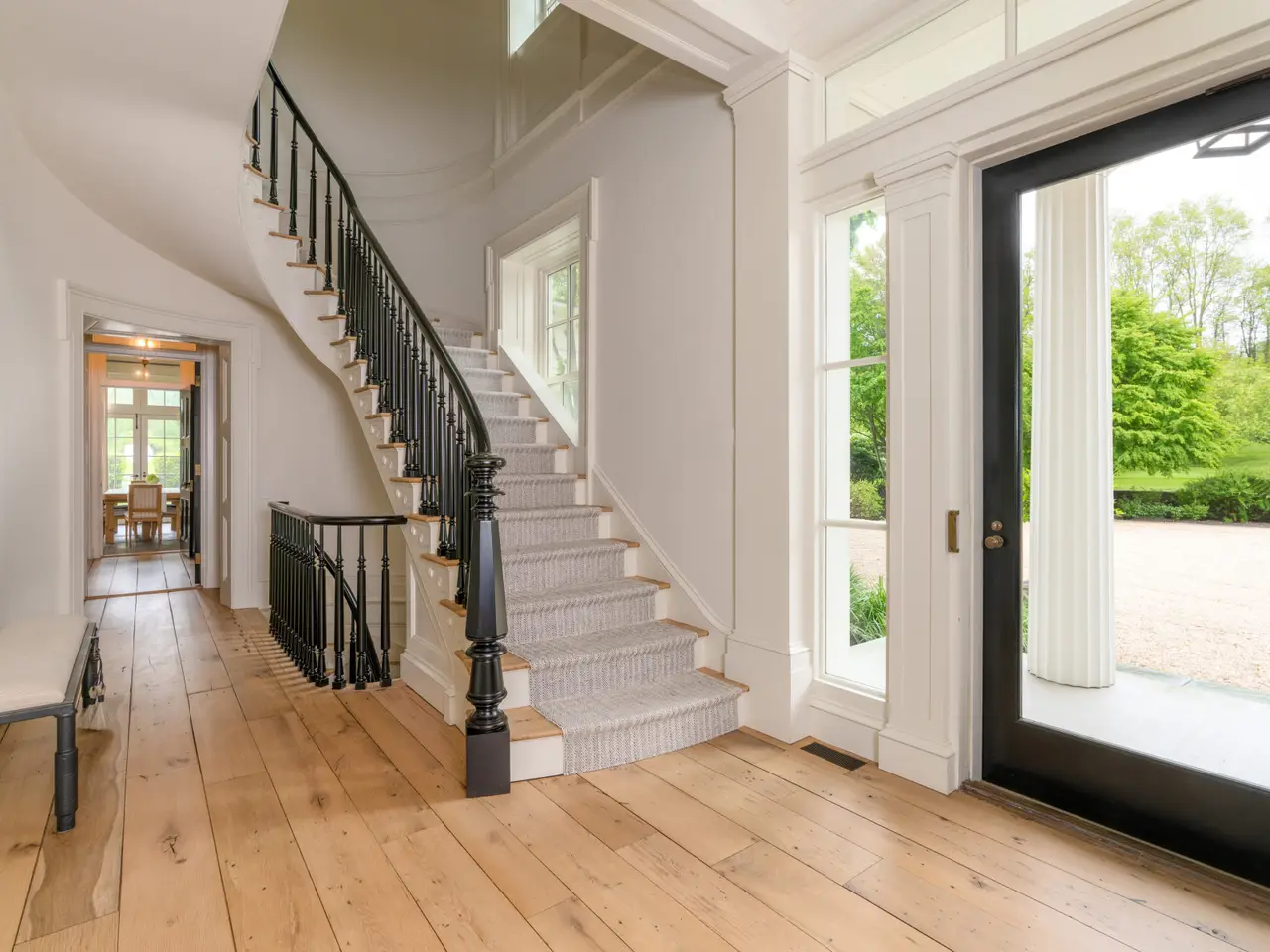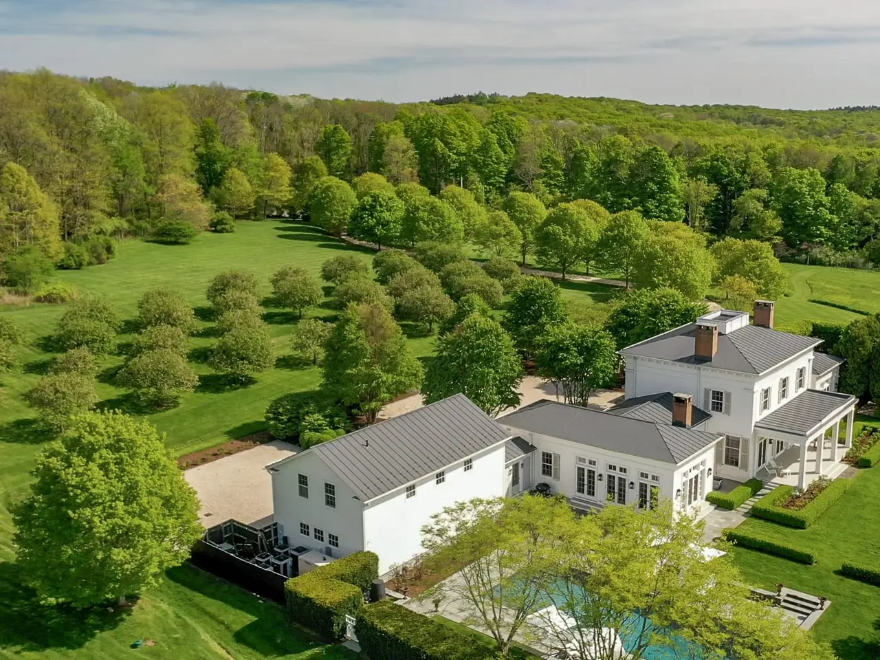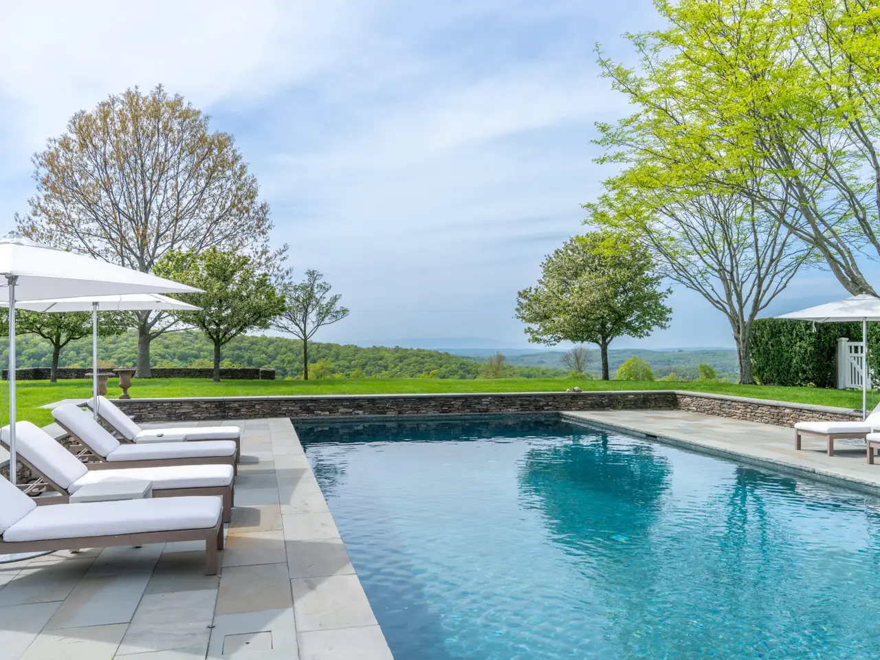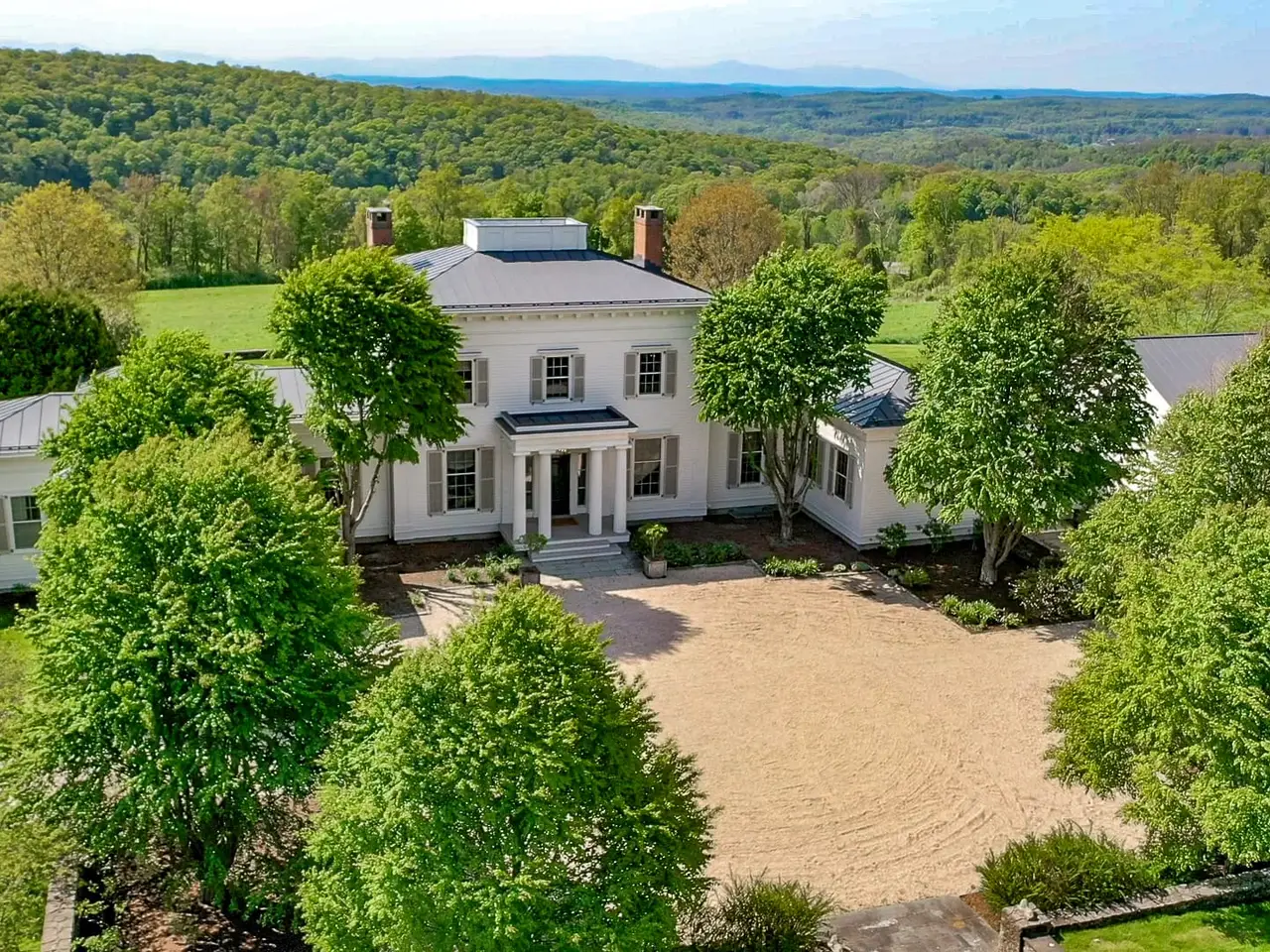 Privately sited at the end of a tree-lined drive, this architectural estate enjoys panoramic views over the Hudson Valley and Catskill Mountains. Designed by AD100 architect Gil Schafer, with landscape architecture by Warren Byrd, the home is a Greek Revival masterpiece that blends timeless elegance with modern sophistication. As featured in Elle Decor, the interiors showcase meticulous craftsmanship and richly layered detail. A dramatic double-height entry gallery centers around a sculptural spiral staircase, offering a striking introduction to the home. From there, a 36 x 24-foot great room unfolds with 11-foot-plus ceilings, two wood-burning fireplaces, and French doors leading to an expansive covered porch that captures stunning sunset views. The kitchen is outfitted with top-of-the-line appliances, hand-hewn beams, dual pantries, and an inviting lounge area, perfect for gathering and entertaining. A large-scale wet bar connects the kitchen and great room, while the adjacent dining area opens to a beautifully landscaped pool terrace. A heated breezeway leads to private guest quarters, offering two en-suite bedrooms and a comfortable sitting room. In the west wing, a richly paneled library with fireplace sits beside the serene primary suite, which includes dual dressing rooms, luxurious bathrooms, and views of an English garden and the rolling landscape beyond. Upstairs, two additional bedroom suites each feature private sitting areas and discreet breakfast bars, creating refined and restful retreats. An extraordinary offering where architectural pedigree, design excellence and natural beauty converge.
