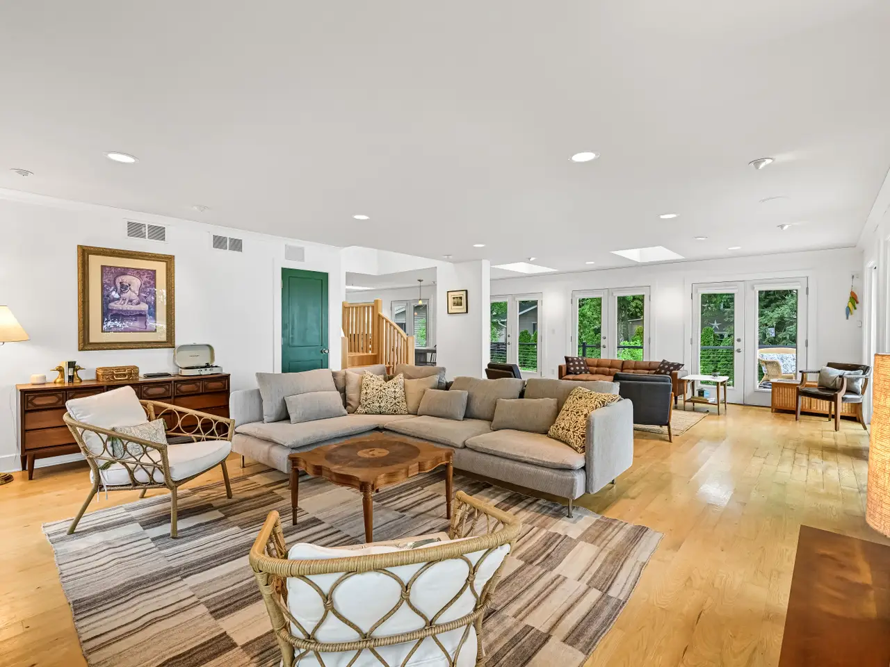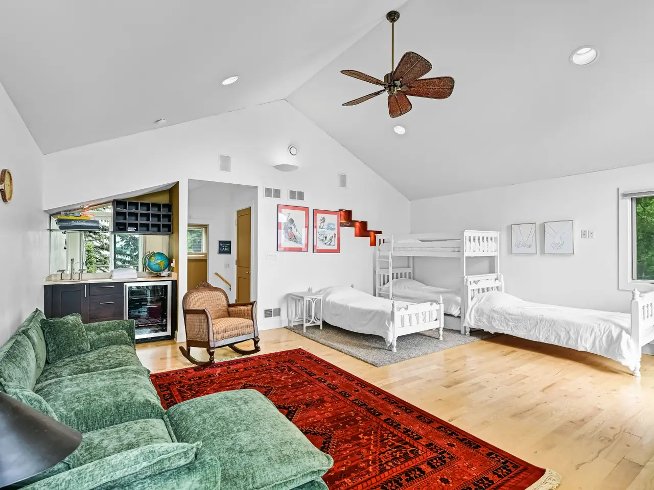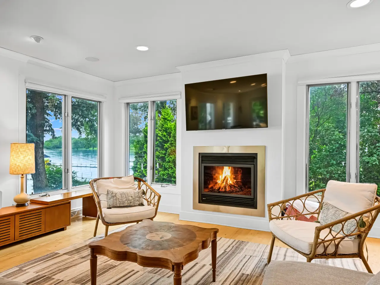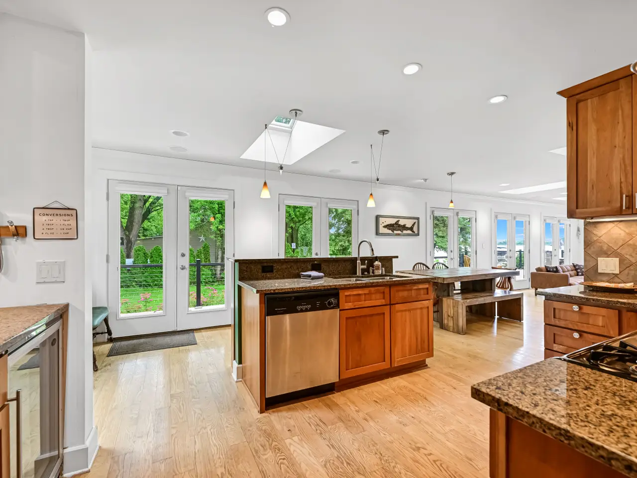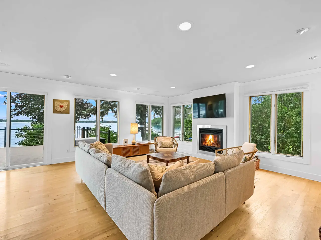 Imagine beginning your day with the breathtaking views of Eagle Lake, presenting a remarkable lakeside living experience. You can enjoy the final days of summer on your 87-foot flat lot, which offers stunning water views from a spacious, modern deck and a newly constructed pier with an expanded platform. Inside, you will find an inviting layout with a kitchen that features a large island, granite countertops, a tiled backsplash, stainless steel appliances, and attractive hardwood flooring. Enjoy the abundance of natural light from the numerous windows and new patio doors that showcase the beautiful lake perspectives from every angle. Two primary bedroom suites, situated on different levels, provide a wonderful sense of privacy for residents. The upstairs suite boasts a private balcony, a gas fireplace, and vaulted ceilings that enhance your appreciation of the peaceful lake views.