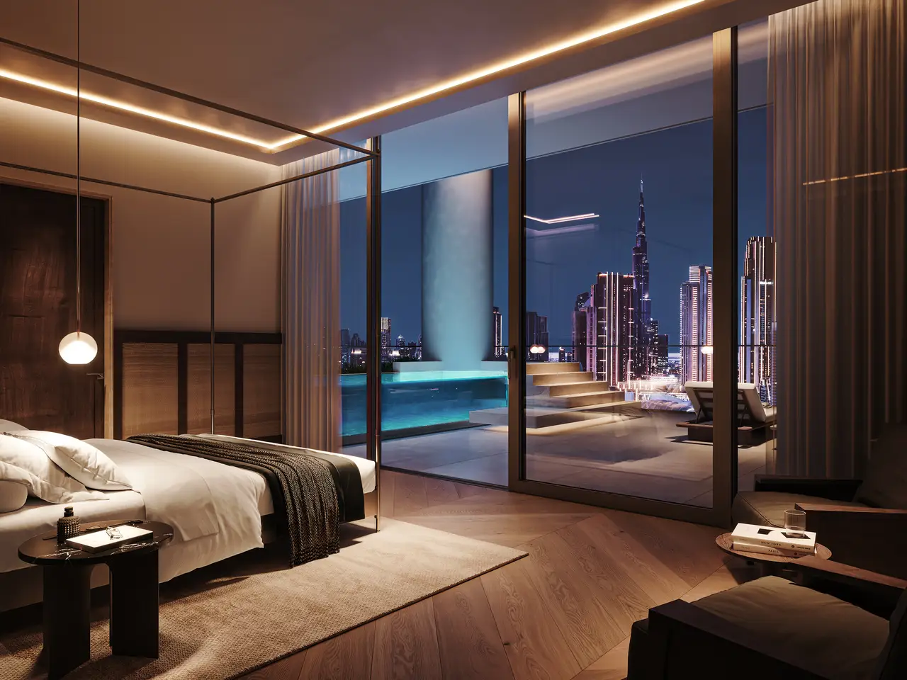 - Floor-to-ceiling windows with cityscape panoramas