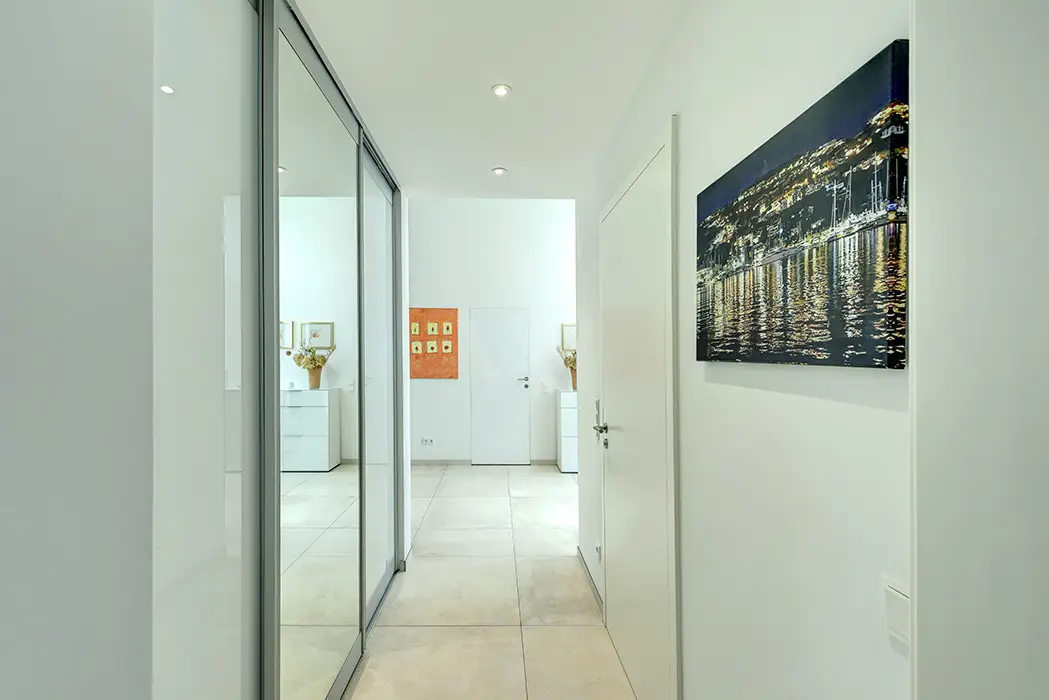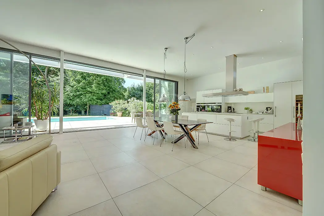Welcome to a unique opportunity that combines the highest standards of modern living with exceptional architecture. This as-new Bauhaus-style villa was completed in 2021 and is located in a quiet cul-de-sac right on the edge of the forest. With a living space of approx. 212 m² on a generous plot of approx. 1,586 m², this property combines solid construction - including partial concrete and KS masonry with a thickness of 36.5 - 54.5 cm in a thermal insulation system - with innovative technology and exclusive furnishings. The house thus achieves the Kfw 40 standard as an A-plus house with excellent energy values!!! The prestigious driveway and the impressive entrance lead into the heart of the property: cooking, dining and living are harmoniously combined in a spacious loft-like room concept. The Thelen design kitchen, equipped with high-quality branded electrical appliances, offers a cooking island with induction wok tepanyiaki hob, oven, steam cooker, wine fridge, refrigerator, dishwasher, two sinks and a powerful extractor fan. The floor coverings made of high-quality porcelain stoneware in 80x80 format were laid uniformly inside and out and underline the homogeneous appearance. Large, 3.20-metre-high aluminum windows with the highest insulation level and safety glass, electric external blinds or aluminum roller shutters (insulated and controllable via Bluetooth), as well as skylights flood the entire house with light. Over-height, flush-fitting interior doors (invasive flat closing) and impressive ceiling heights create a special sense of space. The master bedroom boasts custom-made built-in closets and direct access to the garden. The adjoining master bathroom is equipped with Keuco furniture and sanitary ware and features exquisite marble-look surfaces, an experience shower, WC and bidet as well as a free-standing bathtub. A total of 5.5 rooms are spread over the living space. Two further rooms are connected by a sliding door and can also be accessed separately from the hallway and living area. A guest bathroom with a walk-in shower is conveniently located next to an additional bedroom. A custom-made built-in wardrobe in the hallway provides storage space. The property includes an oversized terrace across the entire width of the house. The floating concrete elements along the living room are a special feature. Three electrically operated awnings can be controlled individually and, if desired, fill the open interior spaces to provide you with sun and rain protection on the terrace. Here you will find space to create your lounge seating set and your outdoor dining area. Another highlight is the 8.00 x 4.00 m pool with pool heating, automatic water quality control, pool robot and cover), outdoor shower and another terrace at the edge of the forest. The garden is equipped with a fully automatic irrigation and lighting system as well as a lawn robot and offers a variety of uses. A separate forest terrace invites you to linger. A 3-car garage with electric sectional doors and built-in cupboards, four outdoor parking spaces and a gate access to the garden are available for your vehicle fleet. Particularly suitable for driving into the garden with a trailer or for parking additional cars. The utility room and laundry room are accessible via the garage and the living area. The highest security standards are guaranteed by a video surveillance system. An energy-efficient Buderus geothermal heat pump with underfloor cooling meets the KfW 40 standard and guarantees sustainable heating and cooling technology by means of underfloor heating throughout the house. This property represents luxury of the highest living standards at all levels - come and see for yourself during a personal viewing.