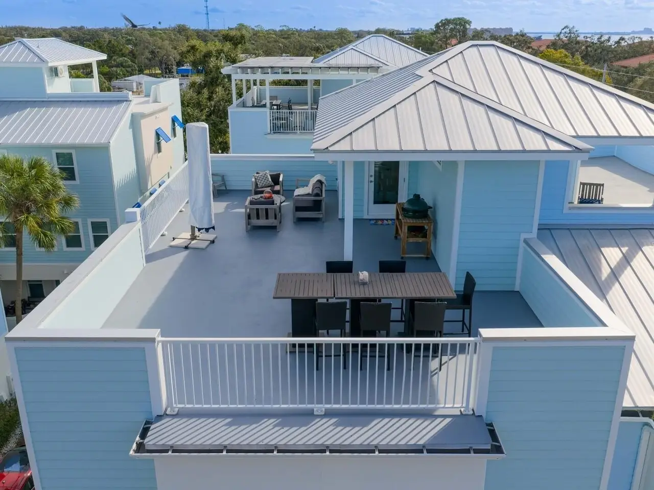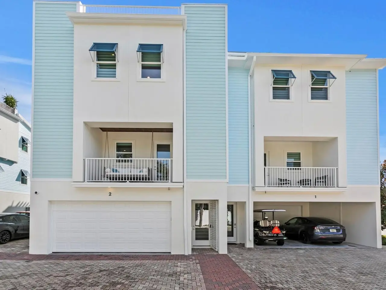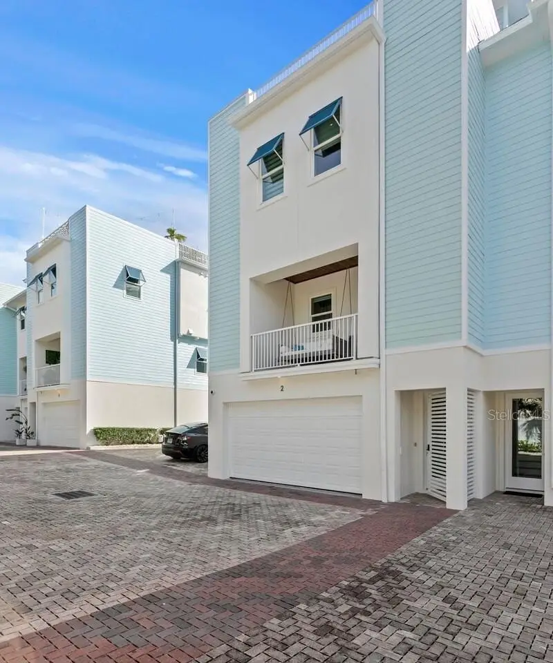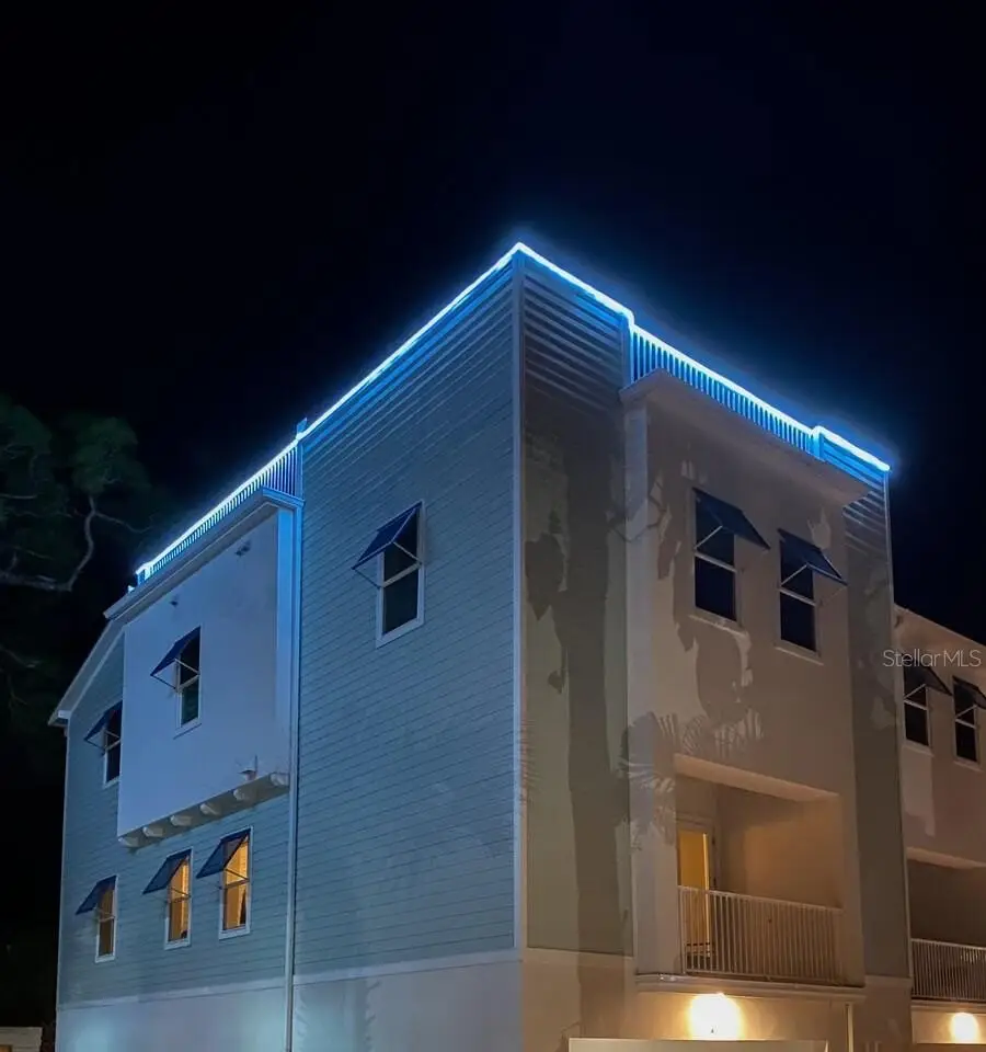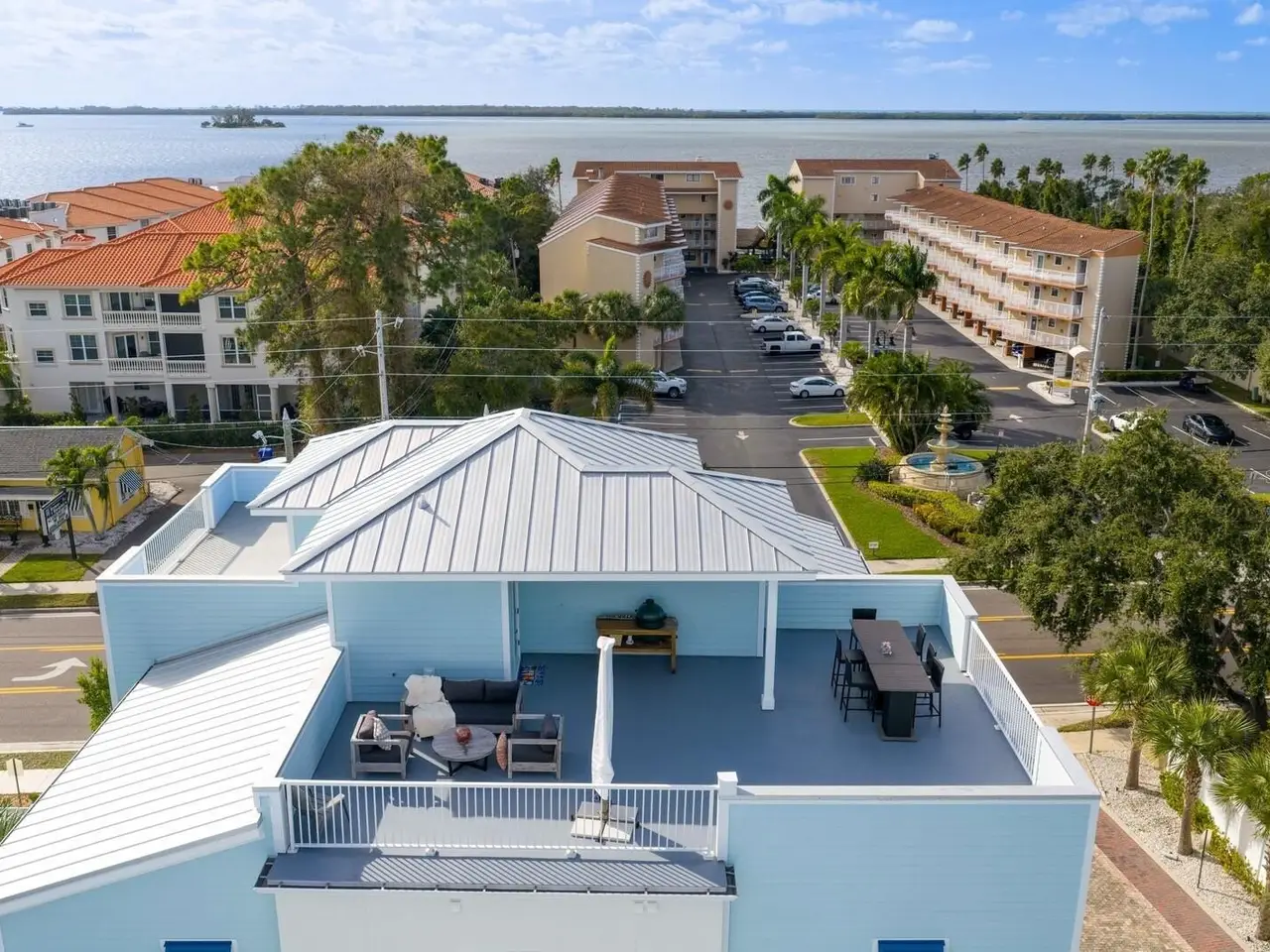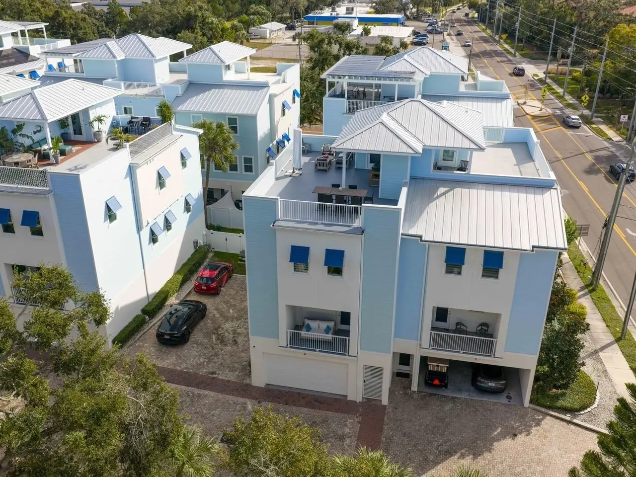 Exquisite Coastal Townhome with Rooftop Terrace and Gulf Views in Dunedin! Discover refined coastal living in this architecturally stunning four-story townhome, boasting 3 bedrooms + office, 2.5 bathrooms and a Private 4-stop Elevator, perfectly positioned across from the Gulf in coveted Dunedin. Constructed with Insulated Concrete Forms (ICF) for superior strength, energy efficiency, and soundproofing, as well as Miami Dade Impact windows and doors, this residence blends modern craftsmanship and security with timeless elegance. The exterior showcases Hardy siding to ensure lasting beauty and durability as well as 2 balconies (front and back) – 1 featuring a wood-paneled ceiling and a charming porch swing that conveys with the home. 4-car garage with pebble epoxy floor has two separate bays with dual garage doors — the rear section thoughtfully outfitted as a home gym. Behind the private gated entry with rich wood ceiling, the interior features 10-foot ceilings, 8-foot solid-core interior doors, and designer finishes creating an ambiance of upscale sophistication throughout the home. The second floor reveals a bright and expansive great room ideal for entertaining, with defined living and dining spaces that flow seamlessly to the gourmet kitchen. This chef’s space features premium shaker-style cabinetry with crown molding, granite countertops, stainless steel appliances (including a 5-burner gas range), spacious pantry, and a generous center island with seating. Wide-plank engineered wood flooring and ample natural light throughout, enhance the home’s modern coastal style. Dedicated home office provides a quiet and functional space ideal for remote work or creative pursuits. Upstairs, the huge primary suite offers a serene retreat complete with sitting area, spacious walk-in closet and spa-inspired en suite bath boasting dual vanities, tile floor, large soaking tub, and a separate shower. Two additional bedrooms (1 featuring a Murphy bed and built-in desk), a well-appointed full bath with tub/shower combo and a convenient laundry closet, complete this level. The fenced backyard offers a private outdoor retreat with a paver patio, low-maintenance turf lawn, and beautifully designed landscaping that enhances both style and relaxation. The crown jewel of this exceptional home is the fourth-level Rooftop Terrace — an entertainer’s dream showcasing panoramic 360-degree views of the Gulf, Caladesi Island and Dunedin. Enjoy unparalleled sunsets and gentle sea breezes from your substantial rooftop sanctuary, easily accessible via private elevator and stairs. Located just steps from the scenic Pinellas Trail and moments from Downtown Dunedin’s acclaimed restaurants, boutiques, and waterfront attractions, this home delivers the perfect fusion of luxury, location, and lifestyle.