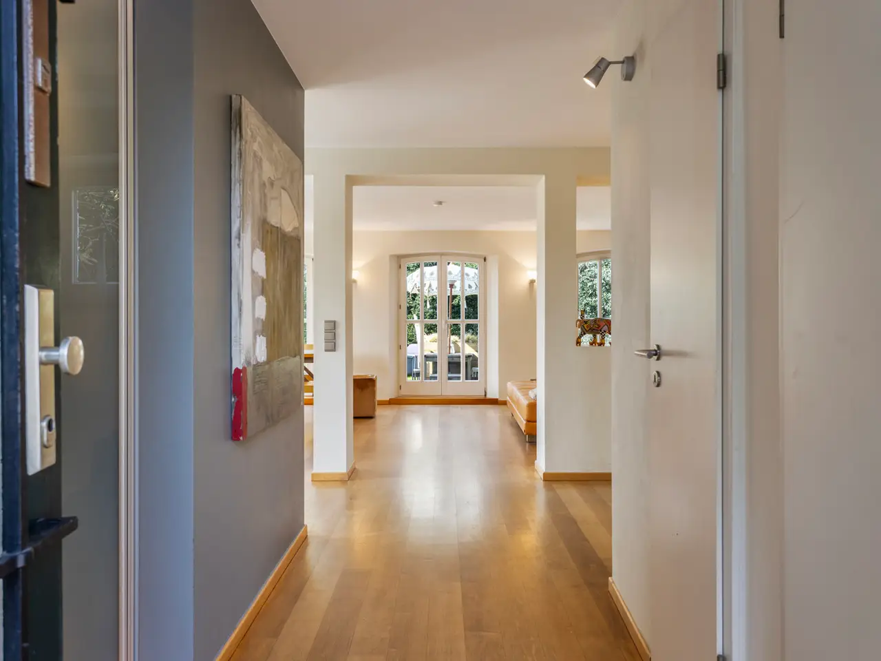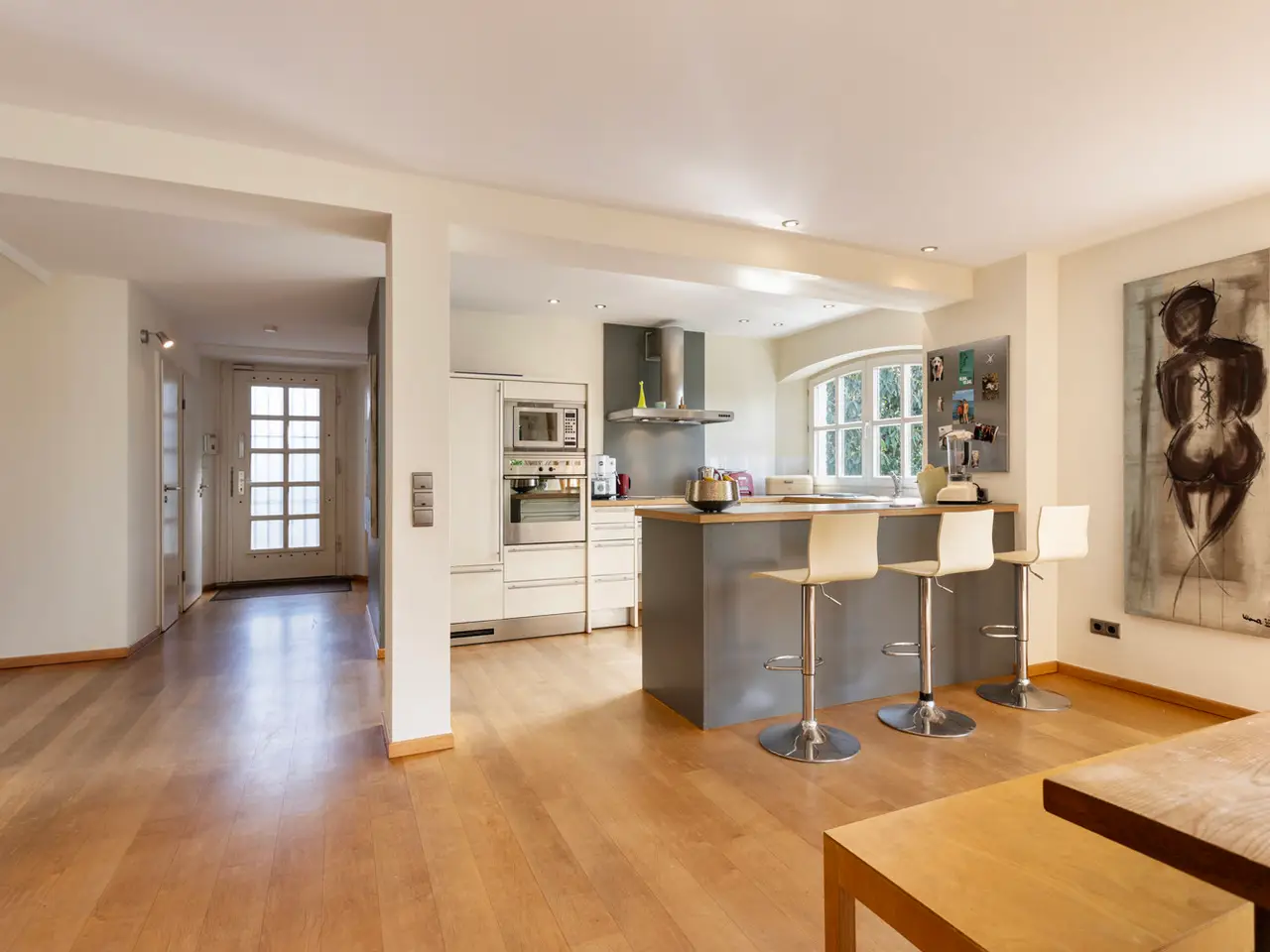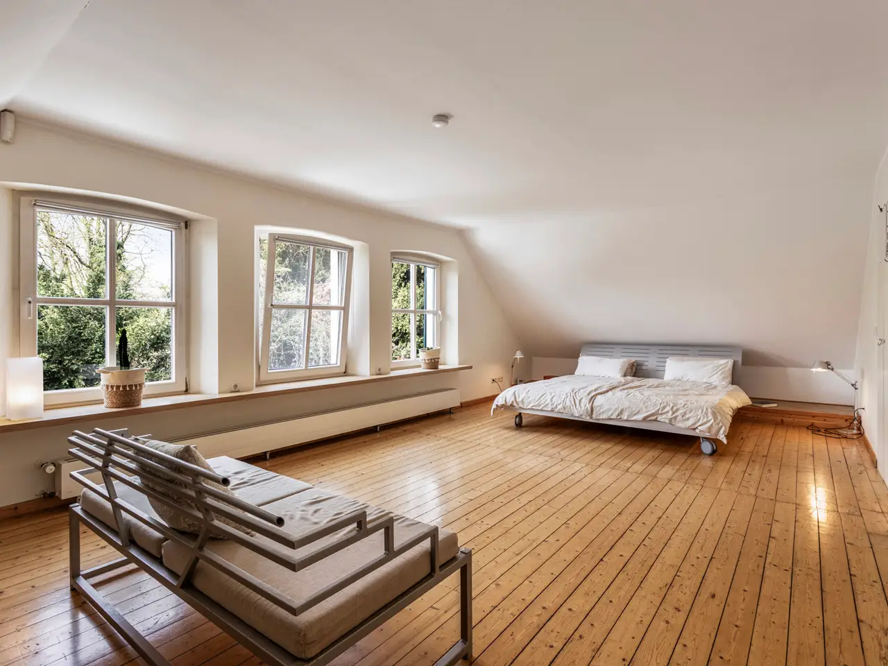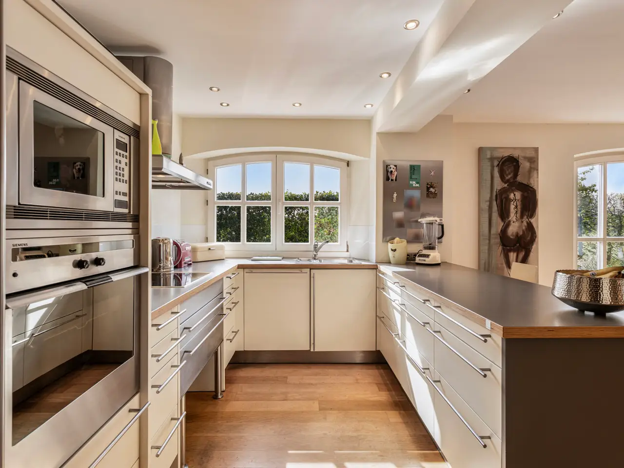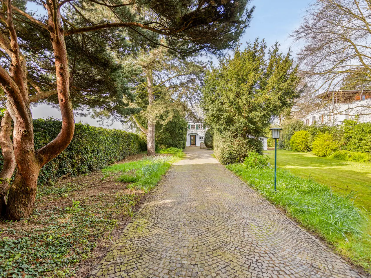 This charming country villa with a view of the Rhine is a truly unique property that is normally difficult to find in Düsseldorf, and not just because of its proximity to the Rhine. This enchanting property on a plot of around 1,730 m² and secluded from view consists of a main house and an extension and is a real gem that offers you peace, comfort and individuality on approx. 215 m² of living space. Built in 1949/50 as a director's villa and extended by an annexe in 1960, the property has combined stylish ambience and individual living quality since its extensive core renovation in 1997. The owners have preserved classic elements from the construction period with great sensitivity, optimized the floor plans and thus preserved the property's incomparable charm. The wooden lattice windows with round arches, the refurbished wooden floorboards and the window blinds are just a few examples. The view of the Rhine and the adjacent fields are constant companions and offer a feeling of space and freedom. Incidentally, the development plan provides for a buildable area of approx. 690 m² with two full storeys, which offers many options ranging from an extension of the house to a completely new development of the property. As soon as you walk through the entrance gate, the spacious and well-kept garden immediately catches the eye, at the end of which, accessible via the cobblestone driveway, lies your new home. Parallel to the extension and in front of the entrance to the house, the quaint courtyard terrace awaits you, which you also use to enter the entrance to the house. From here, you have a smooth transition via the hallway into the living/dining area with its open kitchen, which offers a view of the rear garden and the second terrace area through the floor-to-ceiling windows. Another little oasis surrounded by greenery. In addition to the staircase to the upper floor, you can access the extension from here. A large storage room, a hallway with practical built-in units and another beautiful living area with a fireplace follow next. A bedroom with a small dressing room and a bathroom complete this area of the house, which can also be used as a granny apartment. Back in the entrance area, the guest WC and utility room complete the floor plan on this level. On the upper floor of the main house are the two bedrooms and a bathroom en suite off the master bedroom. The exclusive location not far from the Rhine is particularly noticeable here, as you can enjoy a fantastic view of the fields and the Rhine. The paved area in front of the extension offers space for several cars and a further room accessible from the outside also provides useful storage space. The development plan here offers the possibility of building on a plot of approx. 690 m² with two full storeys plus a staggered storey, thus creating around 1,210 m² of floor space in a direct Rhine location with corresponding views. A corresponding extension to the existing building is also easily possible here. You are welcome to make an appointment to see this rare opportunity for yourself. We look forward to seeing you!