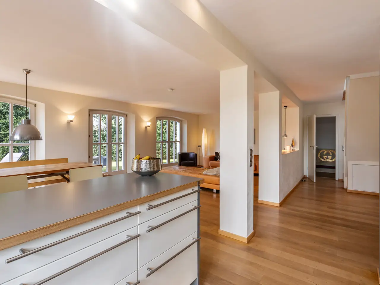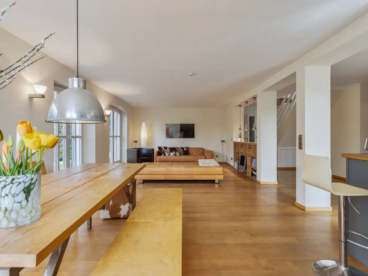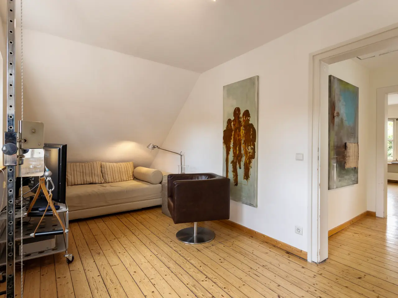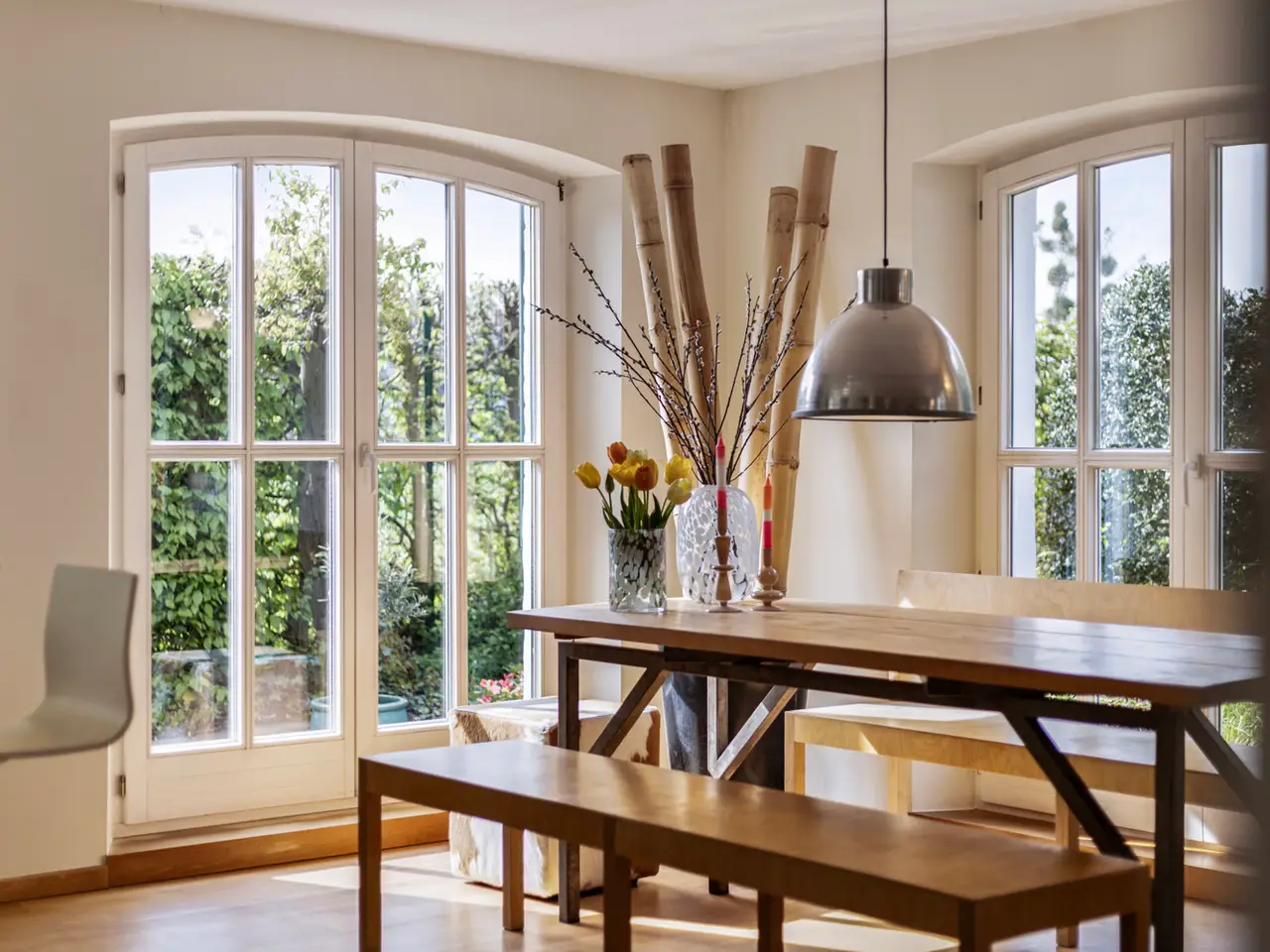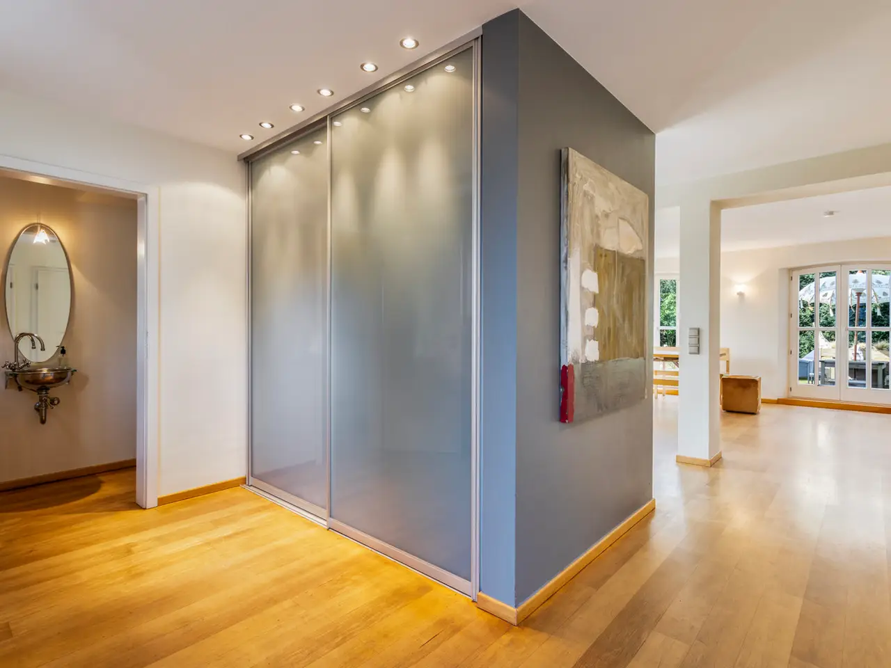 This charming country villa with a view of the Rhine is a truly unique property that is normally difficult to find in Düsseldorf, and not just because of its proximity to the Rhine. This enchanting property on a plot of around 1,730 m² and secluded from view consists of a main house and an extension and is a real gem that offers you peace, comfort and individuality on approx. 215 m² of living space. Built in 1949/50 as a director's villa and extended by an annexe in 1960, the property has combined stylish ambience and individual living quality since its extensive core renovation in 1997. The owners have preserved classic elements from the construction period with great sensitivity, optimized the floor plans and thus preserved the property's incomparable charm. The wooden lattice windows with round arches, the refurbished wooden floorboards and the window blinds are just a few examples. The view of the Rhine and the adjacent fields are constant companions and offer a feeling of space and freedom. Incidentally, the development plan provides for a buildable area of approx. 690 m² with two full storeys, which offers many options ranging from an extension of the house to a completely new development of the property. As soon as you walk through the entrance gate, the spacious and well-kept garden immediately catches the eye, at the end of which, accessible via the cobblestone driveway, lies your new home. Parallel to the extension and in front of the entrance to the house, the quaint courtyard terrace awaits you, which you also use to enter the entrance to the house. From here, you have a smooth transition via the hallway into the living/dining area with its open kitchen, which offers a view of the rear garden and the second terrace area through the floor-to-ceiling windows. Another little oasis surrounded by greenery. In addition to the staircase to the upper floor, you can access the extension from here. A large storage room, a hallway with practical built-in units and another beautiful living area with a fireplace follow next. A bedroom with a small dressing room and a bathroom complete this area of the house, which can also be used as a granny apartment. Back in the entrance area, the guest WC and utility room complete the floor plan on this level. On the upper floor of the main house are the two bedrooms and a bathroom en suite off the master bedroom. The exclusive location not far from the Rhine is particularly noticeable here, as you can enjoy a fantastic view of the fields and the Rhine. The paved area in front of the extension offers space for several cars and a further room accessible from the outside also provides useful storage space. The development plan here offers the possibility of building on a plot of approx. 690 m² with two full storeys plus a staggered storey, thus creating around 1,210 m² of floor space in a direct Rhine location with corresponding views. A corresponding extension to the existing building is also easily possible here. You are welcome to make an appointment to see this rare opportunity for yourself. We look forward to seeing you!