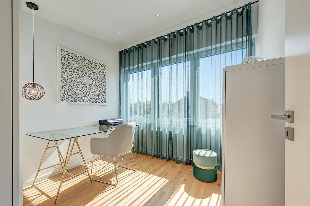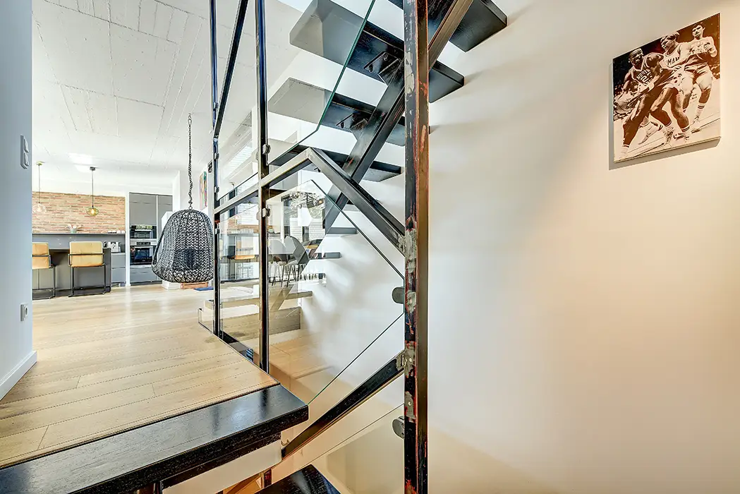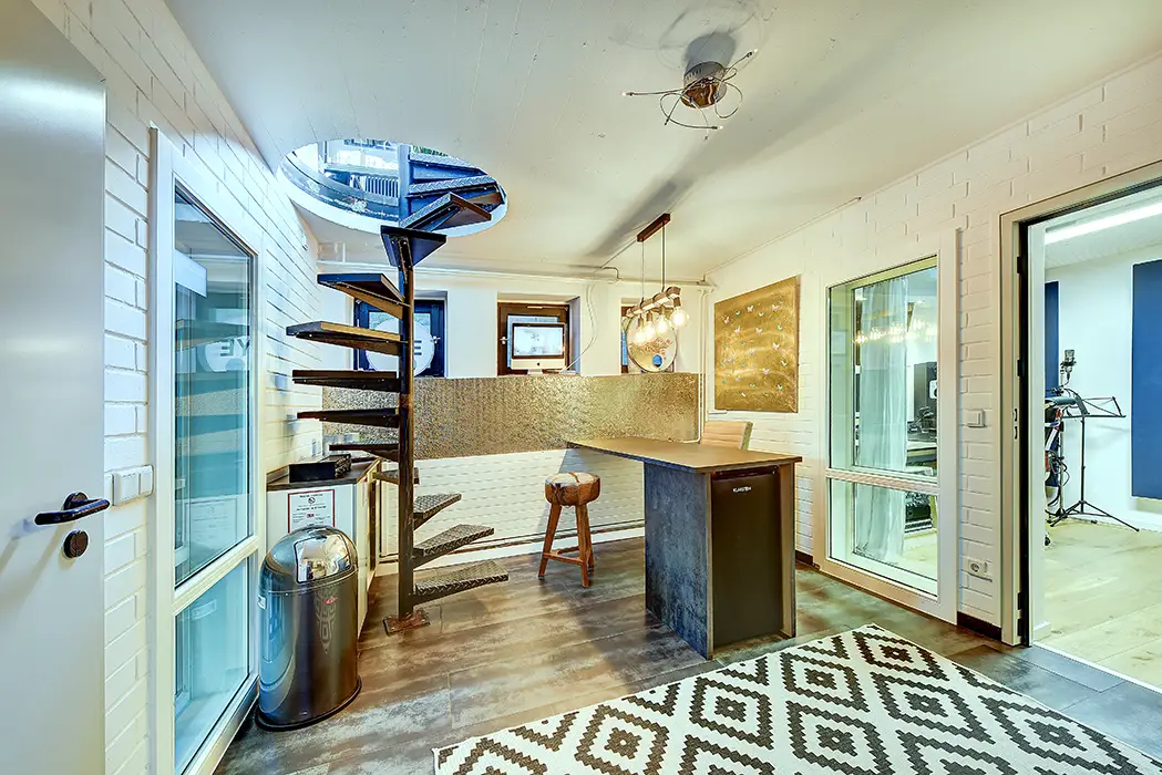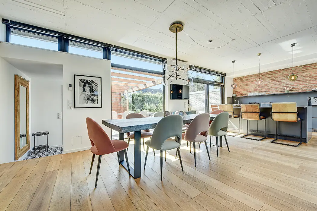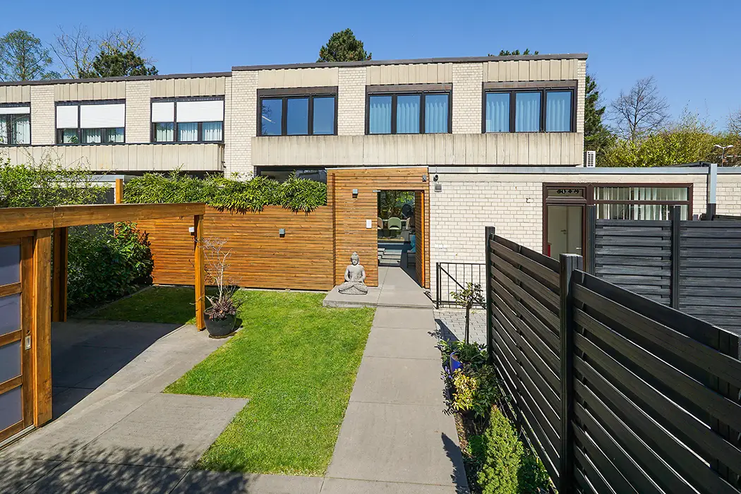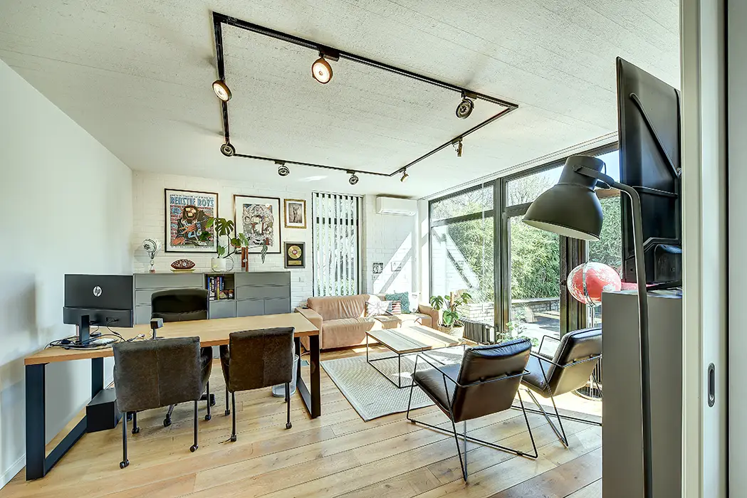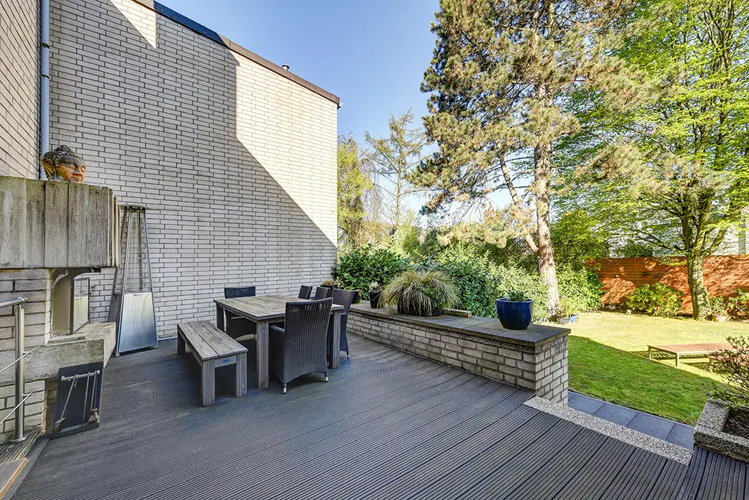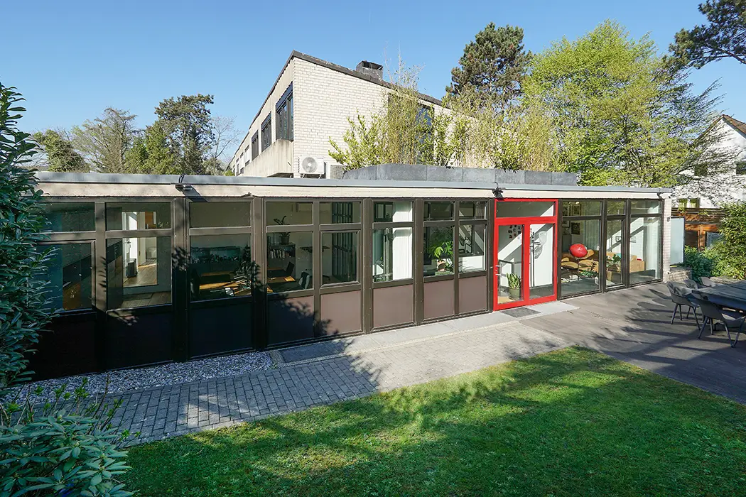 An individual and modern architect's house awaits you here, which was renovated to a very high standard and in style in 2016 and is still in excellent condition today. The property offers future residents a variety of possible uses, as there is an office area of around 137 m² directly adjacent to the main house with its approx. 225 m² of living space, both on the garden level and on the first floor. This is accessed separately via its own entrance and can continue to be used commercially in this form or serve as a granny apartment in the future, or can be connected to the main house to create a total of around 360 m² of living space without much effort, as it has already been converted into a living space. A door already connects these areas on the garden level. The split-level architecture, fantastically bright rooms, a timeless and exclusive interior design and a total of three terrace areas as well as a large garden make this property from 1972 a very special offer. The 897 m² plot is a leasehold property with an attractive and fair ground rent (currently only €3,051 p.a.). Thanks to the special layout, this property is ideal for multi-generational living, living and working next door to each other, or for merging or renting out the commercial unit. You enter the main house via the sheltered entrance area, where you will also find the front of the two terraces. A small entrance hall with guest WC and walk-in wardrobe leads to the loft-like living/dining area with open kitchen and fireplace. The modern fitted kitchen has a cooking island, which gives the room a special flair. Floor-to-ceiling window elements provide a great view and plenty of light both to the garden terrace with outdoor fireplace behind and to the front. Adjacent to this central room on the first floor is another living room, which is ideal as a cozy TV room or library. An open staircase leads from the living/dining area to the upper floor and garden level. Two bedrooms, each with an en suite bathroom, and a small study await you on the upper floor. The spacious bathroom in the master bedroom in particular leaves nothing to be desired in terms of design and function. The second bedroom also has a balcony on the garden side. On the garden level, there are two further bedrooms, a shower room, the boiler room, two cellar rooms and a hallway. One of the bedrooms also has access to the house's garden from this level. A door leads to the lower office area, where there is a room facing the garden with access to it, a staff kitchen and an interior room. A spiral staircase takes you from here to the first floor, which is bright thanks to its large windows and has three further rooms, some of which are separated by modern glass and steel structures, giving the floor a great sense of space. Another small kitchen, a shower room and a WC complete the floor plan here. The third terrace is located in front of the extension and you enter this area from the street via a separate entrance on the side of the house, so that there is a clear spatial separation of the two areas from the outside. You can reach the garden of the house via the terrace of the living area with a few steps as well as via two rooms on the garden floor or the terrace of the office area. Here, a large lawn invites you to play, as does a small outdoor sports field covered with mats. A modern garden shed and a large shipping container provide additional storage space. On the street side, the garden is protected from view thanks to a wall and dense hedge and offers plenty of space, especially for the younger residents of the house, while the large garden terrace with outdoor fireplace invites the older ones to enjoy cozy barbecue evenings. There are a total of 4 parking spaces in front of the house and a small wooden shed offers space for bicycles or motorcycles.
