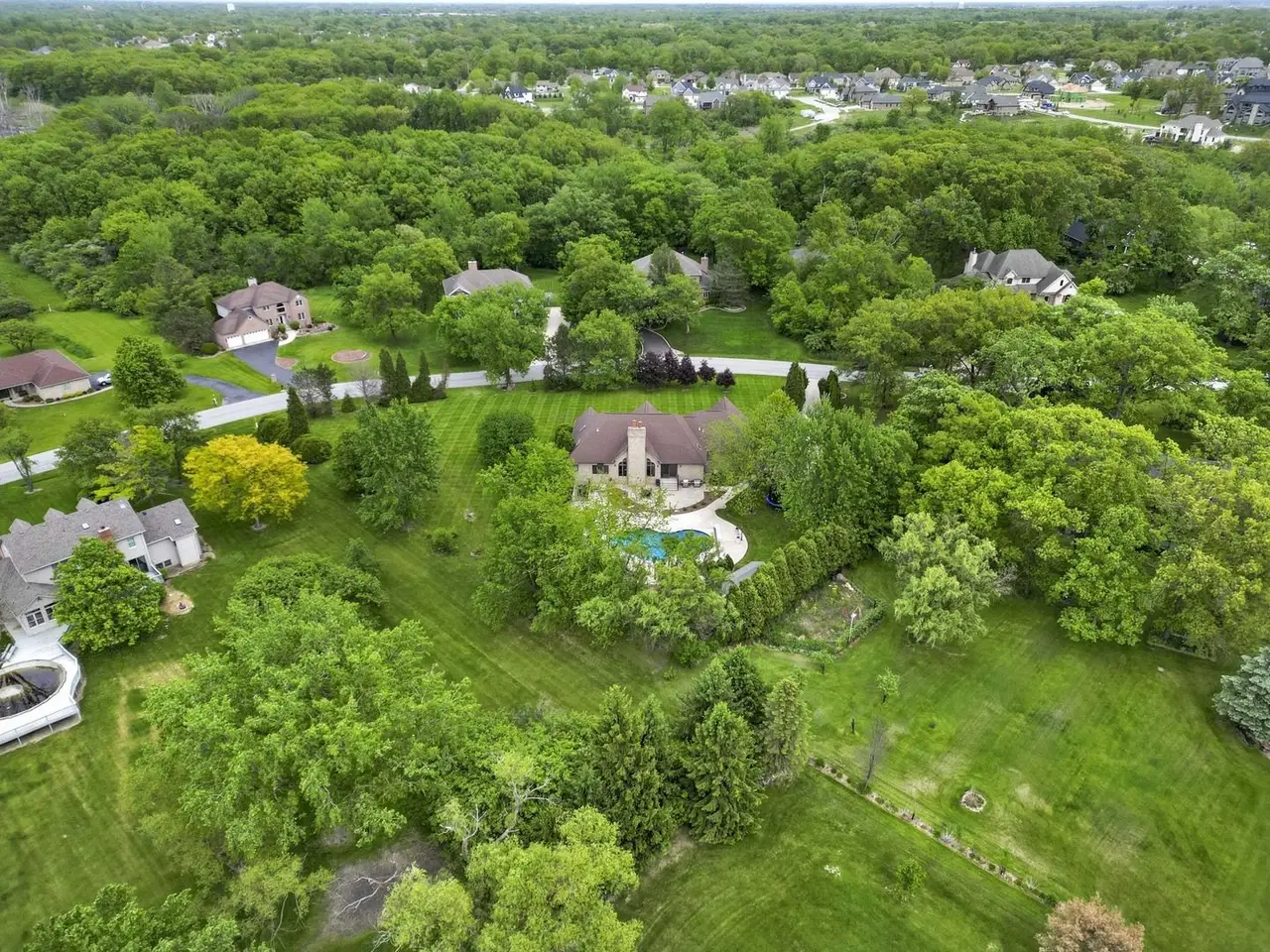 An entertainer's dream comes to life at this Whispering Woods retreat! Set on 1.38 wooded acres, this 4 bed, 4 bath walk-out ranch offers a resort-style lifestyle just minutes from the Illinois border for an easy Chicago commute. The backyard is your private oasis, featuring a heated in-ground pool, professional landscaping, Sonos speakers inside and out, a shed, new fence, and new pool cover-perfect for gatherings or quiet relaxation. Inside, the main level boasts 10' ceilings and cherrywood flooring, a vaulted great room with a dramatic floor-to-ceiling brick fireplace, and a built-in wet bar. The chef's kitchen includes quartz counters, matching backsplash, cherry cabinetry, walk-in pantry, stainless steel appliances, and a Wolf cooktop. A private office with French doors sits just off the entry. The primary suite is a true retreat with heated floors, jetted tub with built-in TV, dual granite vanities, walk-in shower, and oversized walk-in closet. The finished walk-out basement elevates entertaining with a home theater (all media stays), a rec room with tray ceilings and second fireplace, full wet bar with dishwasher and beverage fridge, climate-controlled wine cellar, and a 500-gallon saltwater aquarium. A poker room or potential 4th bedroom with hidden passage and a steam shower bath complete this luxurious space. Additional highlights include a heated 3.5-car garage with epoxy floors, battery backup sump pump, whole-house Generac generator with new battery, in-ground sprinklers, and recent updates to roof, HVAC, and water heater. This is a rare opportunity to own a luxury ranch designed for unforgettable entertaining, resort-style outdoor living, and serene acreage privacy.