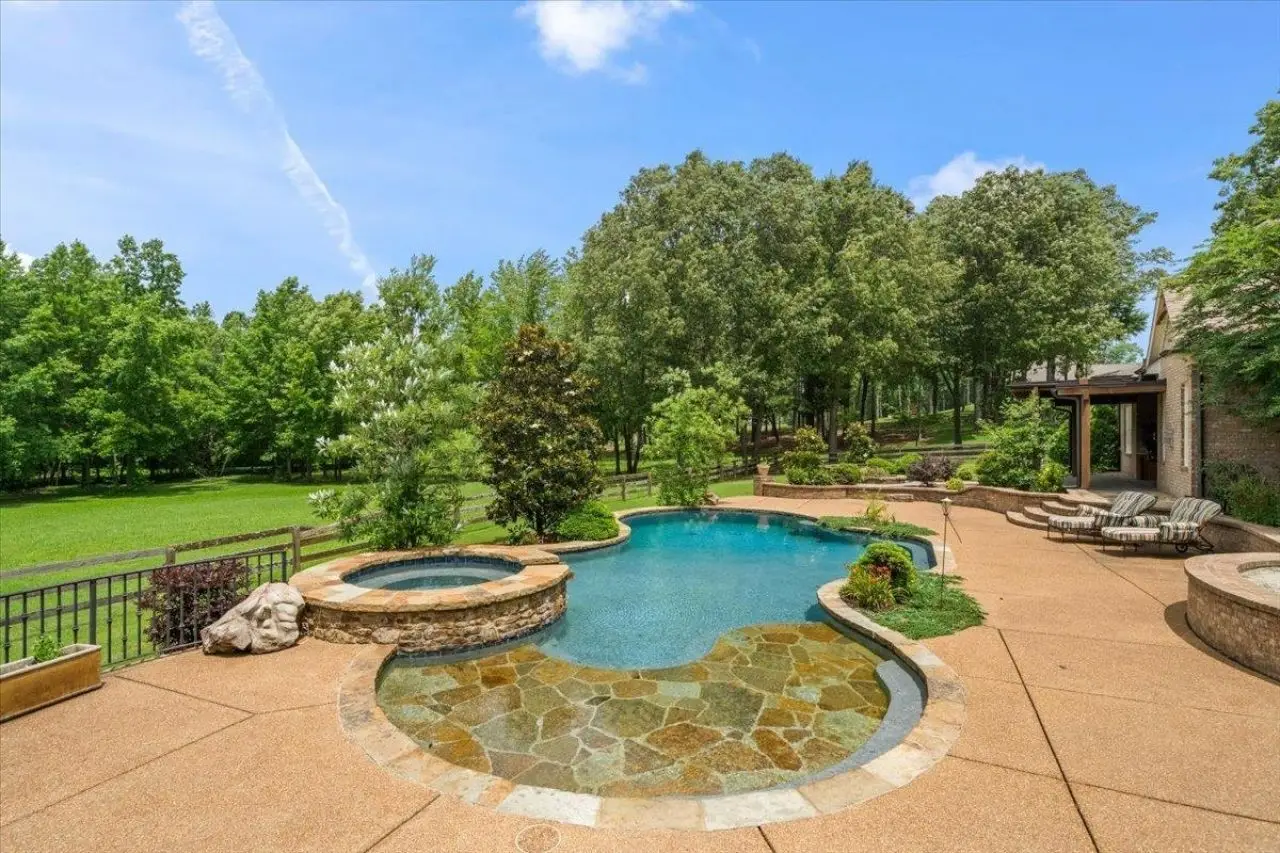 Discover the epitome of luxury living in Aston Park, Eads, TN, where elegance meets resort-style comfort. This stunning custom-built craftsman home offers panoramic walking trail and lake views, specially finished teak floors, and a bright, open-concept design. Designed for both refined living and grand entertaining, the home features a private pool and waterfall hot tub, an outdoor kitchen and fireplaces! Detached guest house has private parking, porch w/fireplace, living room, 2 bedrooms, full bath and kitchenette area. Covered porches provide seamless indoor-outdoor living, while the serene setting in Fayette County ensures privacy and exclusivity. Heated and cooled sqft includes guest house.