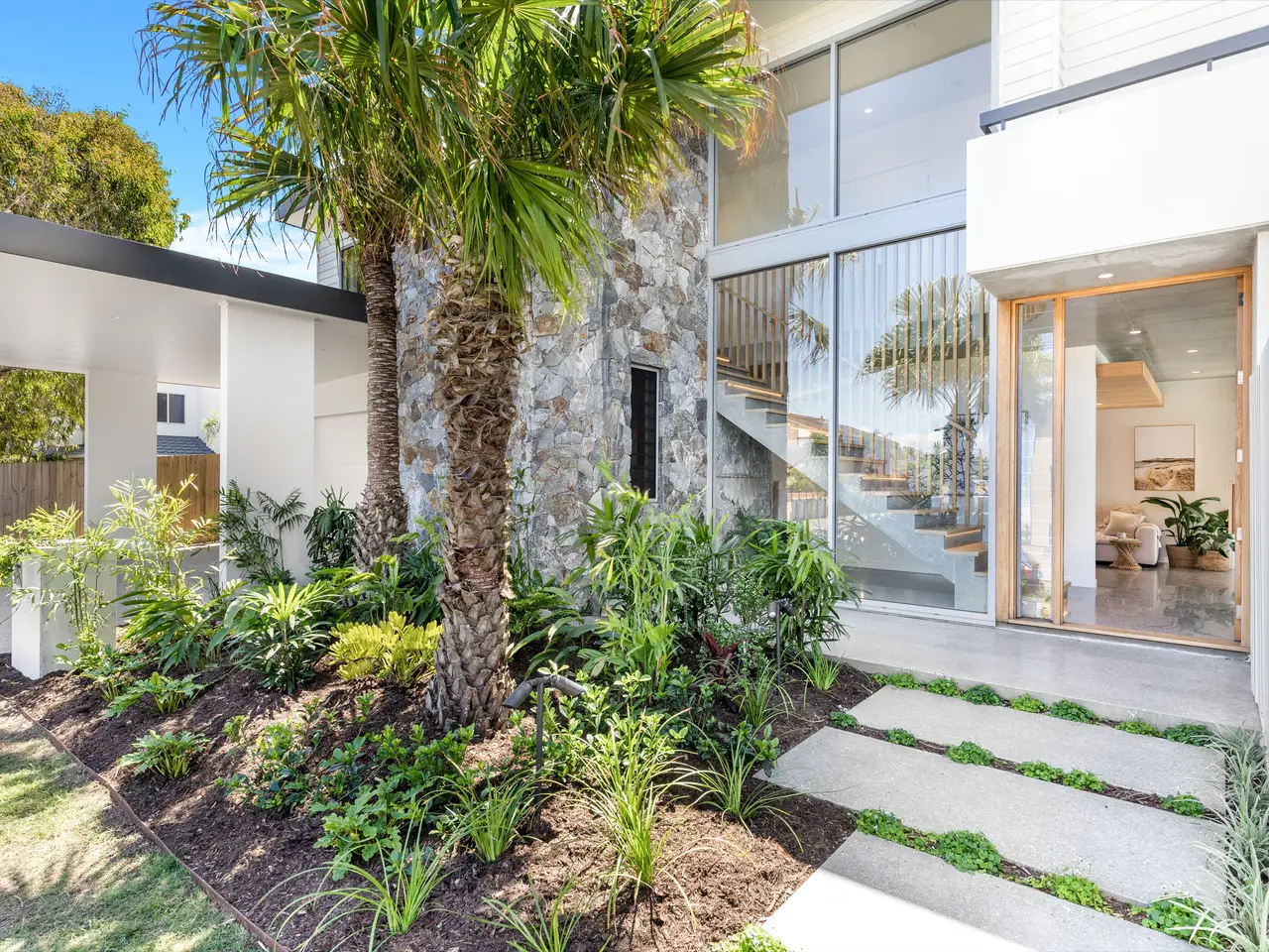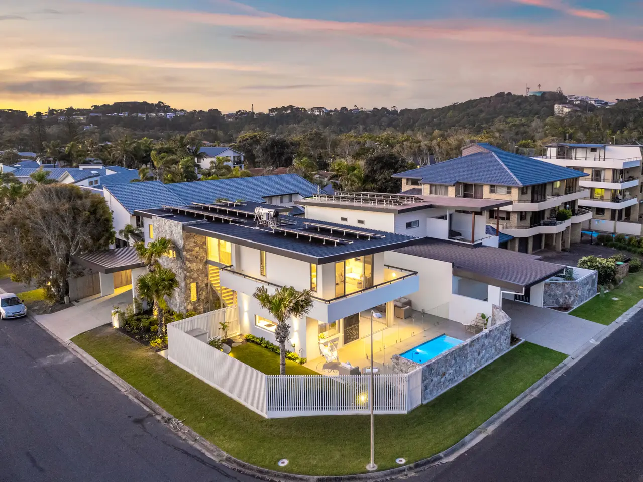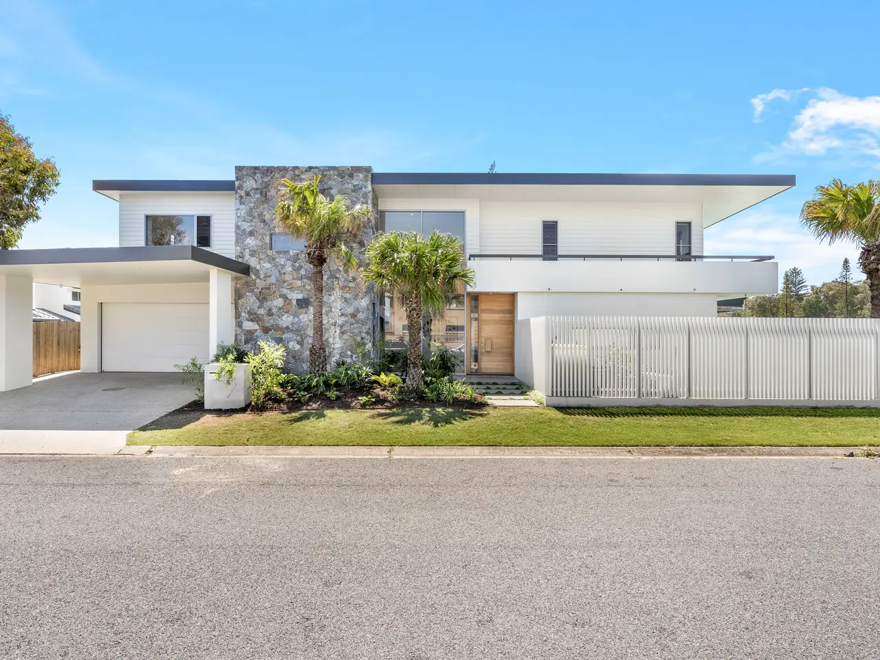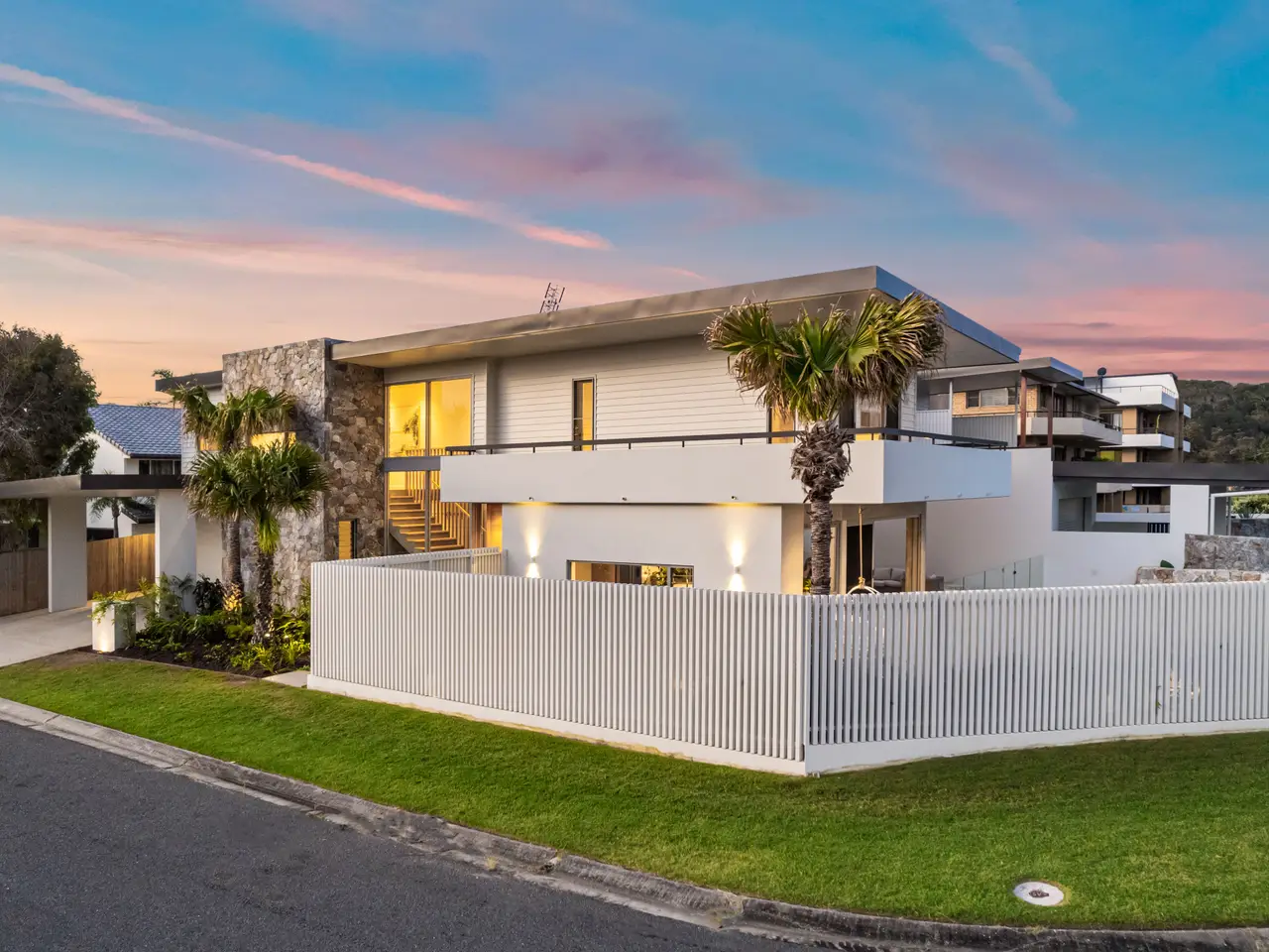 Showcasing a clever and contemporary take on the classic beach house, 'Solana' is a near new family home set within a desirable seaside location, just a stone's throw from the serene backdrop of Shaws Bay. Behind a merged stone feature wall and contemporary vertical batten fence, the refined residence sprawls over two lavish levels. On the ground floor, the entry foyer leads to a spacious open-plan kitchen, dining, and living zone, with stacker sliding doors that spill out to the covered alfresco and pool area, with polished concrete decks, a waterfall blade, and an outdoor shower. Continuing the elegant nature of the home, a total of five bedrooms are strategically placed throughout, each with its own ensuite and all with a walk-in or built-in robe. The grand main bedroom occupies an entire private wing of the first floor, featuring a galley-style walk-in robe, an oversized ensuite, and a wrap-around balcony. Encouraging an idyllic outdoorsy lifestyle, the home's low-maintenance tropical gardens welcome endless ways to unwind for kids and adults alike, from the poolside breakfast bar and hanging chair to the level lawn with an in-ground trampoline. What's more, with beach access straight to middle track via a gate, water-related pursuits are made trouble-free, be it a leisurely level stroll to Lighthouse Beach or a scenic cycle along the Richmond River. - Premiere beachside location, just a short stroll to the water's edge - Stone feature walls, bespoke front entrance door, designer staircase - Exposed aggregate polished concrete floors, honed ceiling and stairs - Entertainer's kitchen with Cesar Stone benchtops and Miele appliances - Underfloor heating, ducted conditioning, laundry chute, water tank - Low-maintenance tropical garden with lighting throughout - Tiled in-ground pool with polished concrete decks and waterfall blade - Covered alfresco zones, level lawn with in-ground trampoline - Double carport with remote access to a double garage with internal access - 10-minute drive to Ballina Byron Gateway Airport, 30 minutes to Byron Bay