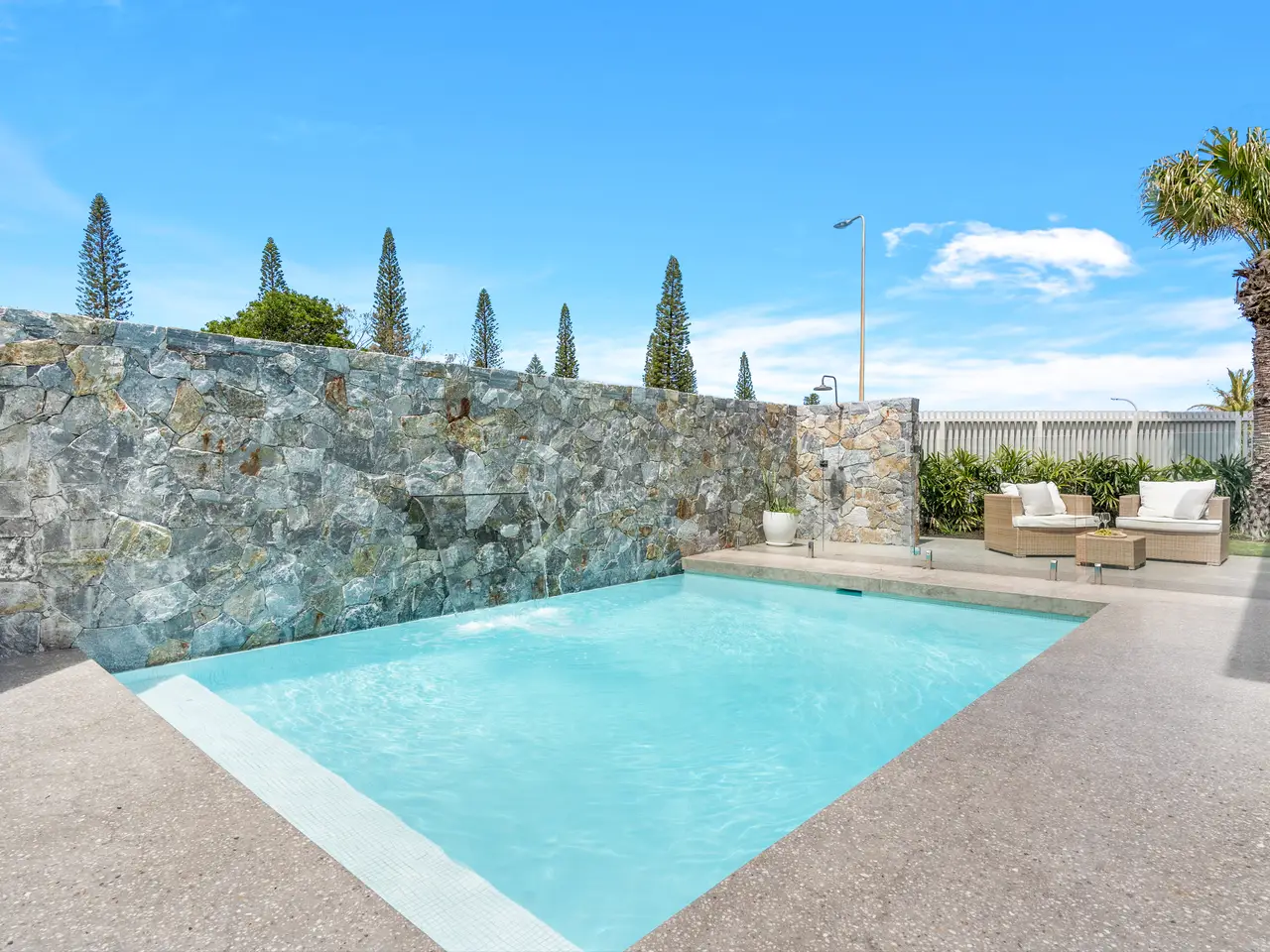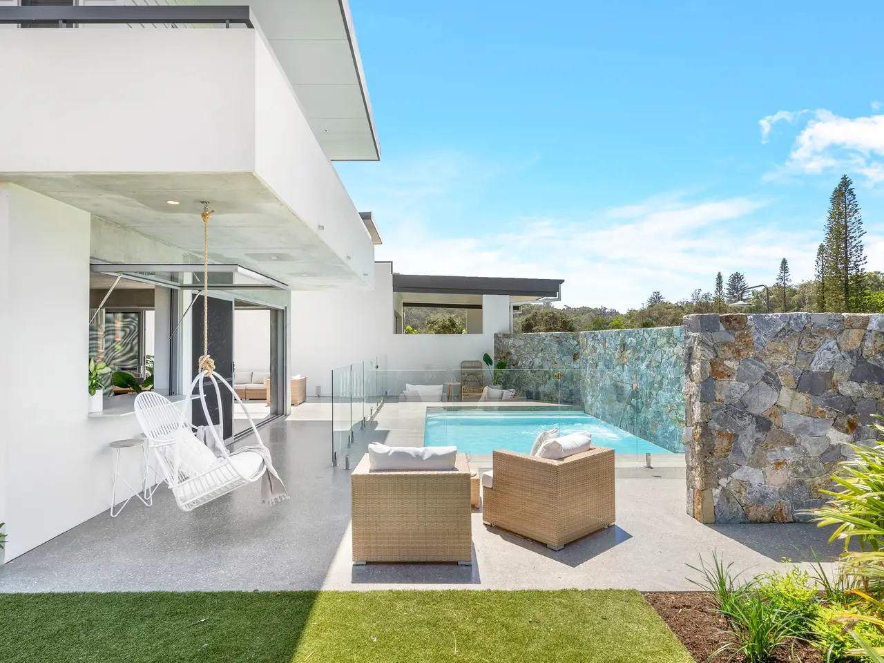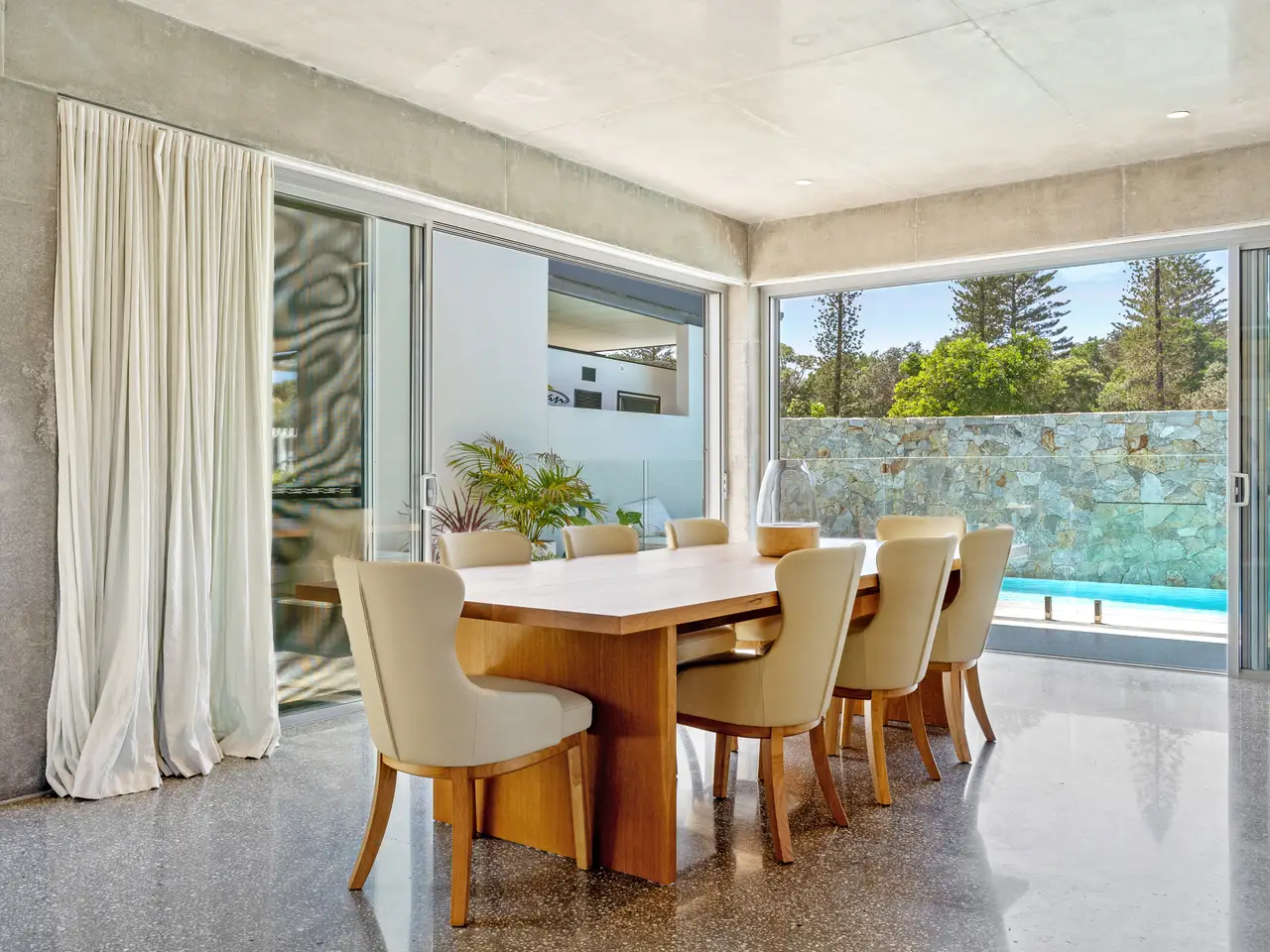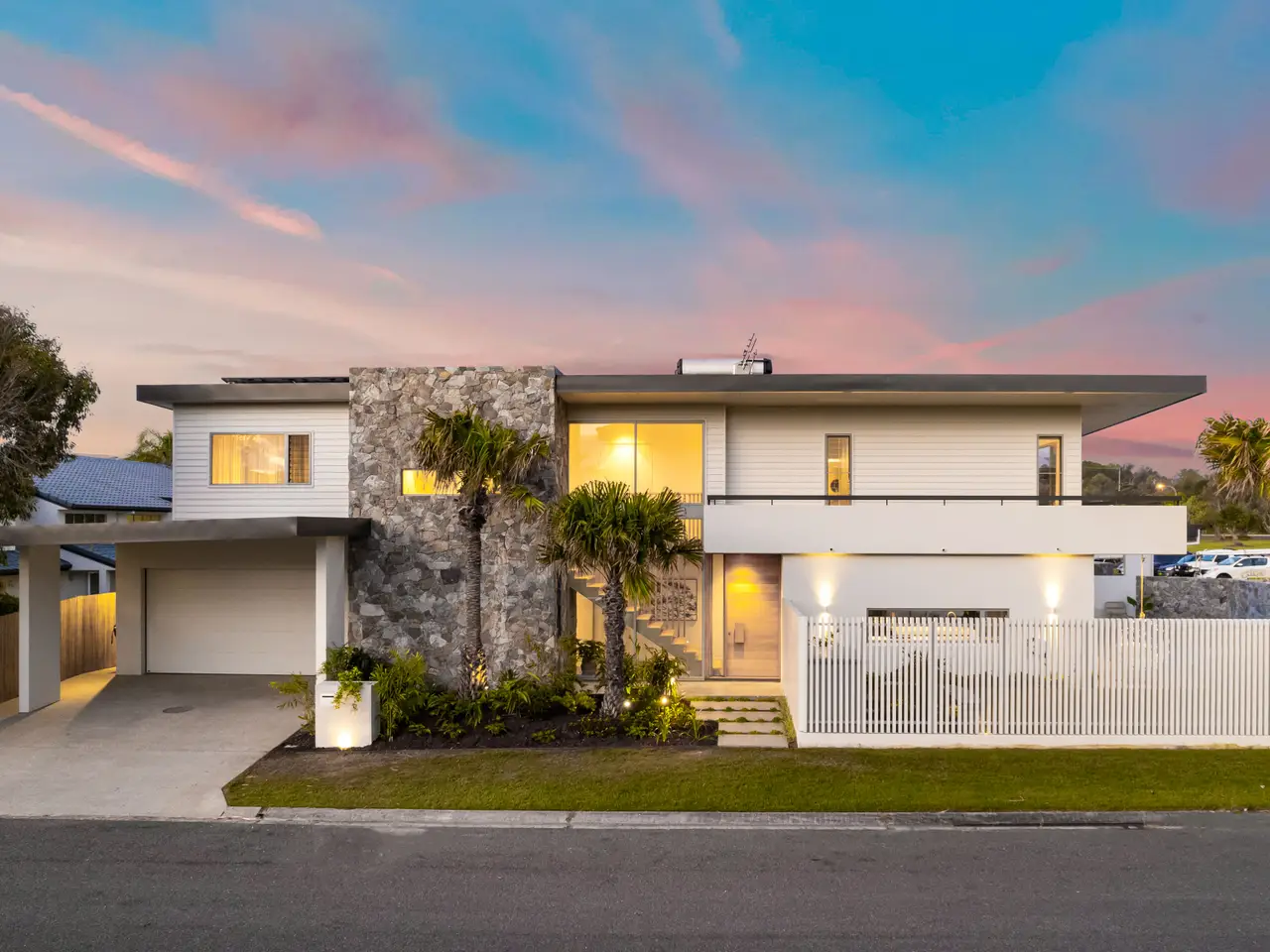 Showcasing a clever and contemporary take on the classic beach house, 'Solana' is a near new family home set within a desirable seaside location, just a stone's throw from the serene backdrop of Shaws Bay. Behind a merged stone feature wall and contemporary vertical batten fence, the refined residence sprawls over two lavish levels. On the ground floor, the entry foyer leads to a spacious open-plan kitchen, dining, and living zone, with stacker sliding doors that spill out to the covered alfresco and pool area, with polished concrete decks, a waterfall blade, and an outdoor shower. Continuing the elegant nature of the home, a total of five bedrooms are strategically placed throughout, each with its own ensuite and all with a walk-in or built-in robe. The grand main bedroom occupies an entire private wing of the first floor, featuring a galley-style walk-in robe, an oversized ensuite, and a wrap-around balcony. Encouraging an idyllic outdoorsy lifestyle, the home's low-maintenance tropical gardens welcome endless ways to unwind for kids and adults alike, from the poolside breakfast bar and hanging chair to the level lawn with an in-ground trampoline. What's more, with beach access straight to middle track via a gate, water-related pursuits are made trouble-free, be it a leisurely level stroll to Lighthouse Beach or a scenic cycle along the Richmond River. - Premiere beachside location, just a short stroll to the water's edge - Stone feature walls, bespoke front entrance door, designer staircase - Exposed aggregate polished concrete floors, honed ceiling and stairs - Entertainer's kitchen with Cesar Stone benchtops and Miele appliances - Underfloor heating, ducted conditioning, laundry chute, water tank - Low-maintenance tropical garden with lighting throughout - Tiled in-ground pool with polished concrete decks and waterfall blade - Covered alfresco zones, level lawn with in-ground trampoline - Double carport with remote access to a double garage with internal access - 10-minute drive to Ballina Byron Gateway Airport, 30 minutes to Byron Bay