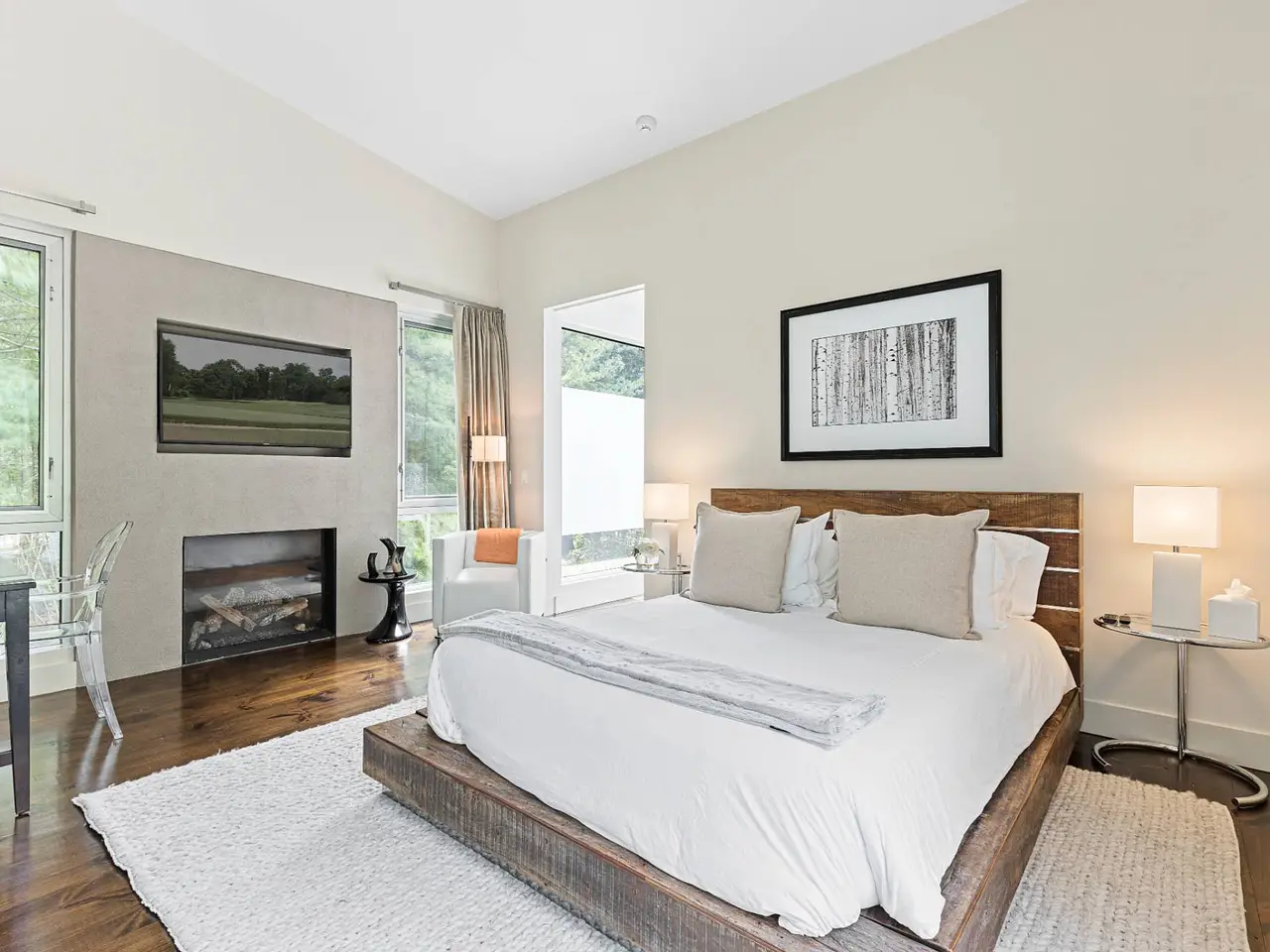 • Walls of glass surround living/dining/kitchen great room with fireplace