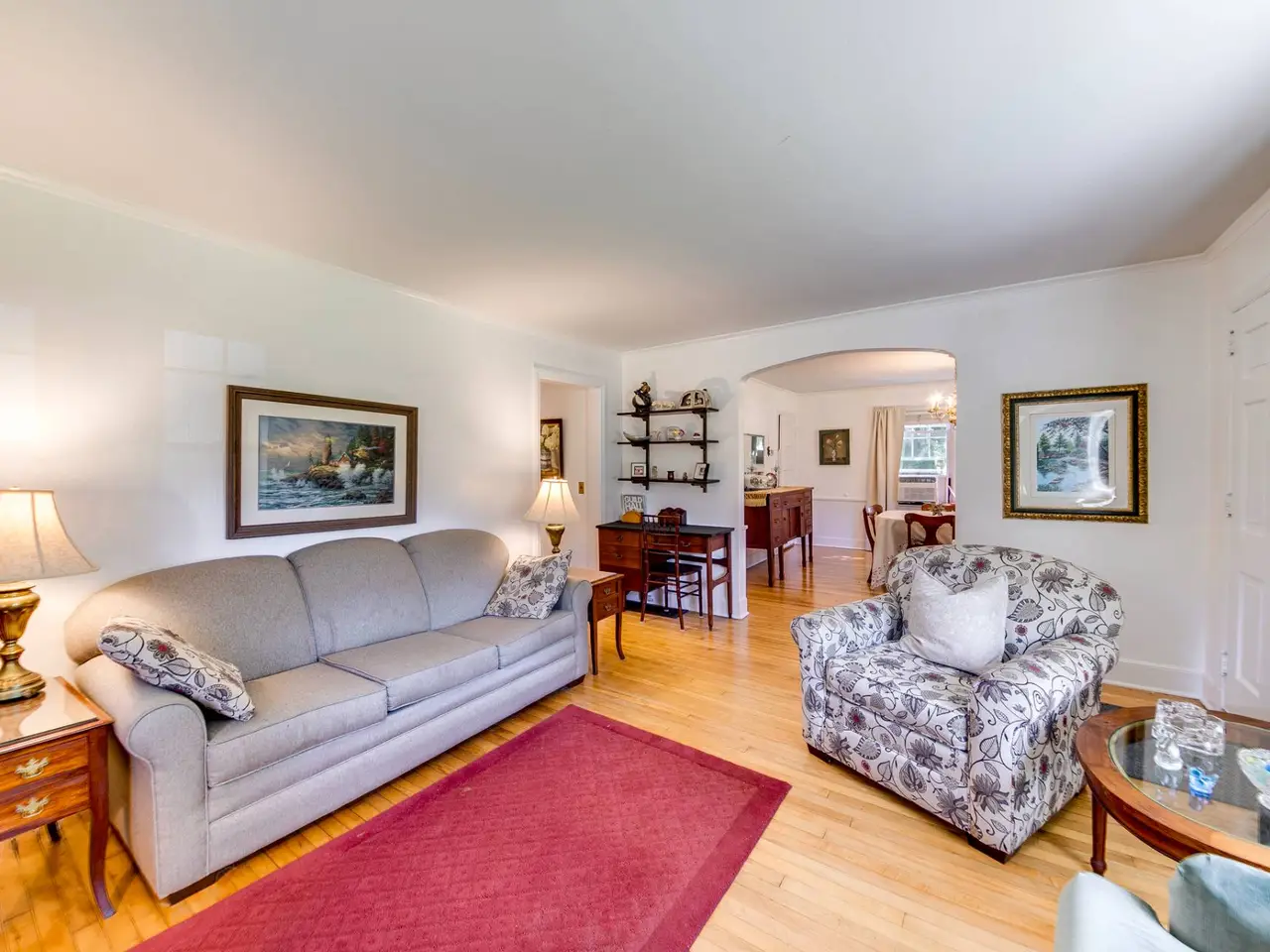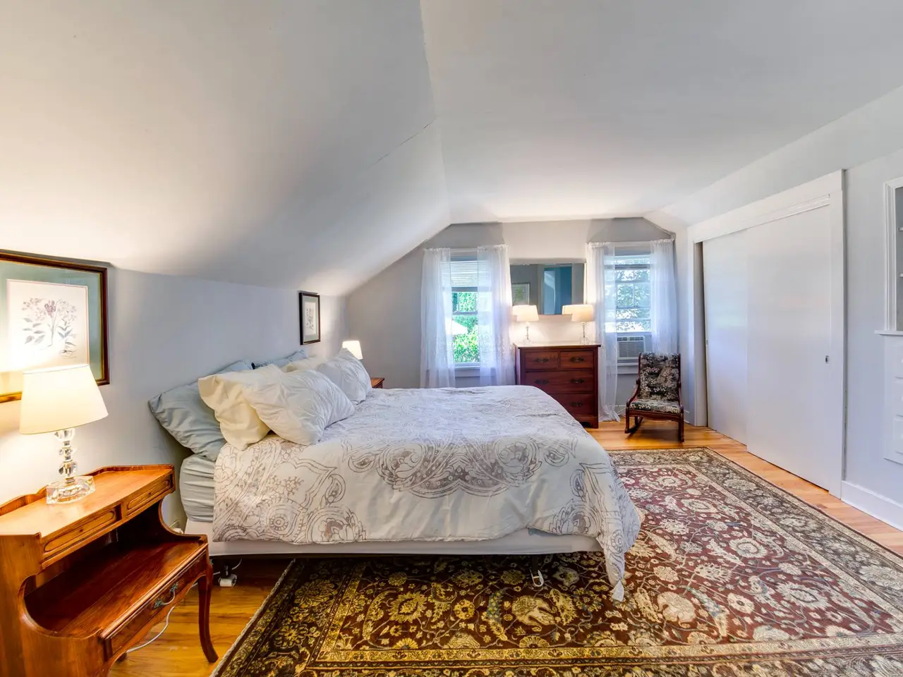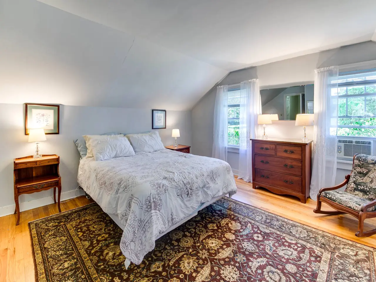 Just a stone's throw away from East Hampton's North Main Street, this charming 3-bedroom, 2-bathroom cottage is cute as a button and offers all the conveniences that come with village life. Enjoy nearby ocean beaches, shopping, restaurants, and museums, as well as the ease of having the Jitney and train station just a mile away. Upon entering the front door, you'll be greeted by a cozy living room with wood floors that flow into the adjoining dining room through a wide graceful arched doorway. Other original architectural features include two glass panned built-in corner cabinets in the dining room and a set of built-in drawers and shelving in the downstairs primary bedroom. An adjacent renovated full bathroom serves the first floor. Just off the dining room is a bright and cheerful eat-in kitchen with access to the laundry room and a full unfinished basement. The second floor offers 2 additional bedrooms and a shared full bathroom. This 1800 square foot home sits on a neatly landscaped .34-acre lot with front and rear stone driveways, a detached one car garage, and a spacious backyard for relaxing and entertaining. Don't miss this perfect summer retreat!
