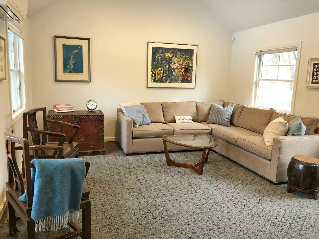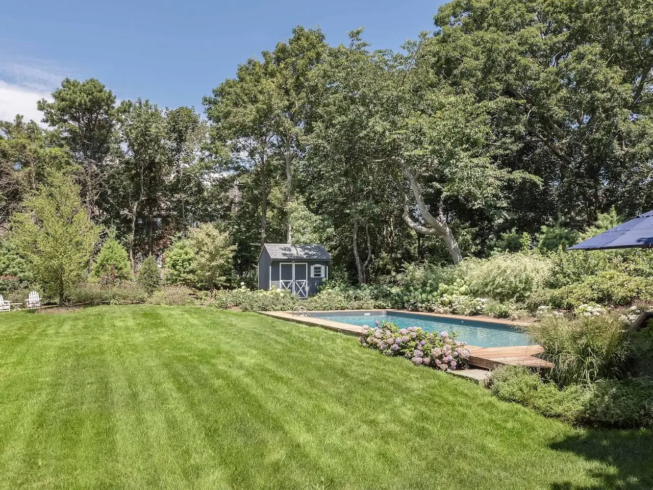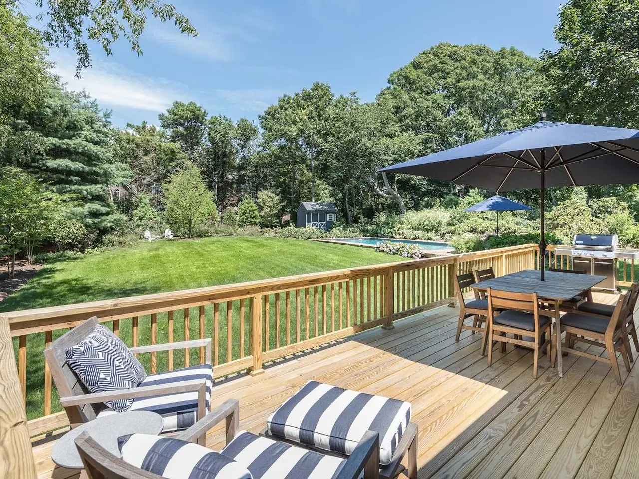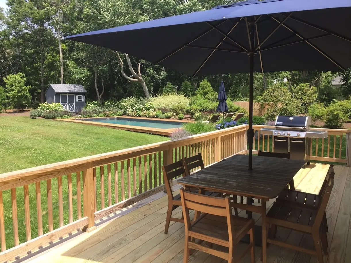 Rental Registration #: 22-1,620. Located just outside East Hampton Village, this charming home on private cul-de-sac on 0.8 acres is a secluded East Hampton retreat. The home is situated with proximity to Main Street, Long Island Railroad train station, East Hampton Grill, Nick & Toni's, Serafina, and the IGA grocery store. It is a classic salt-box house with spacious, sunny great room boasting an open living space that features a traditional wood-burning fireplace. Sliding glass doors open to a large deck with outdoor furniture and gas grill, overlooking the manicured lawn, gardens and the heated salt-water swimming pool (40x20). The additional large den is perfect for afternoon reading or gathering for a movie on the 55-inch television. There are two upstairs bedrooms fitted with queen beds and full, en suite bathrooms. The third bedroom is on the ground floor with a queen bed and full bathroom. Amenities include central-air-conditioning.