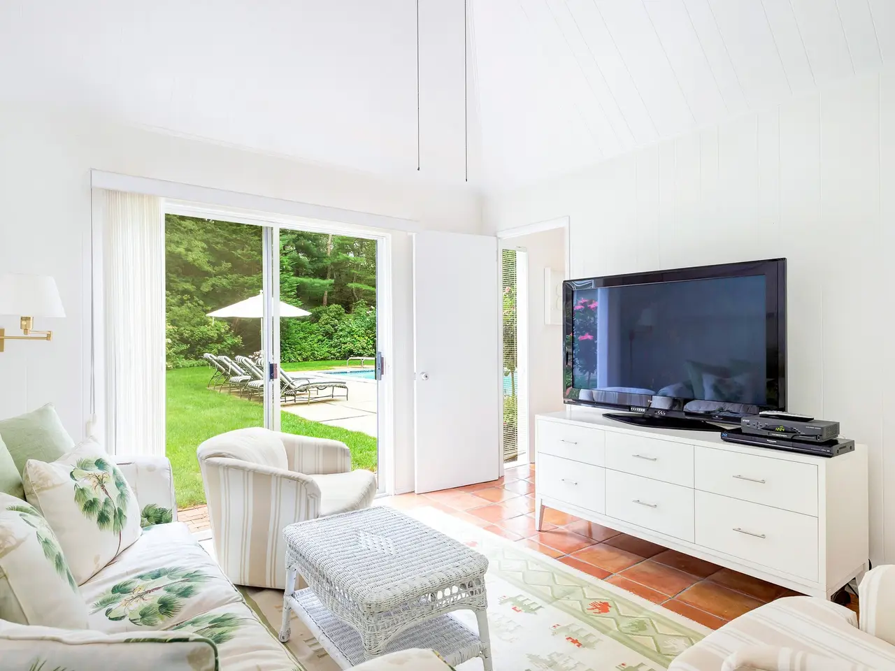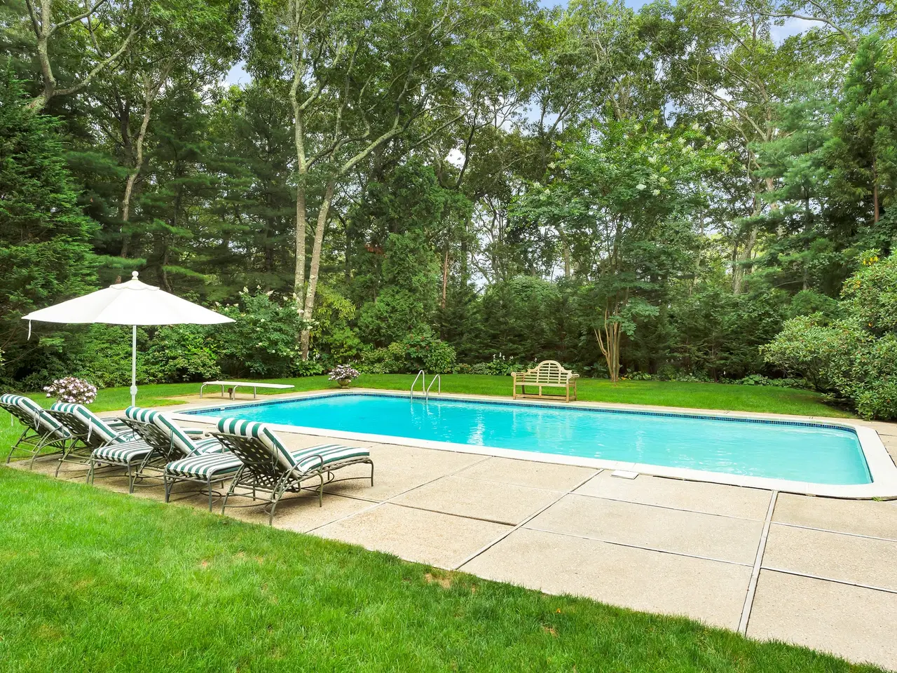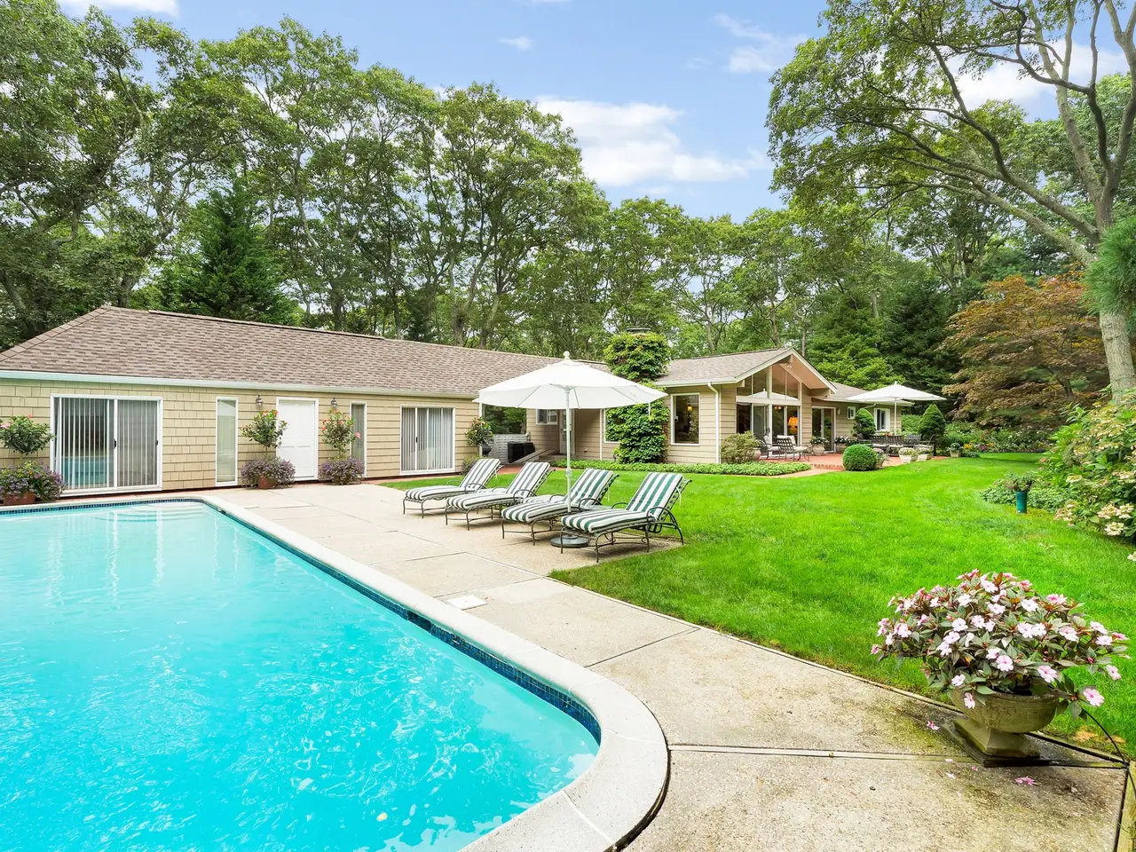 Furnished contemporary privately situated on a beautifully landscaped parcel with mature trees and flower gardens. Living room with fireplace; dining room, kitchen, five bedrooms and three bathrooms. Amenities include air-conditioning, cable television, patio, pool house (with recreation room, two bedrooms and bath), and a 20'x40' Gunite pool. Close to restaurants, Georgica and Main Beach. Listing ID: 735652