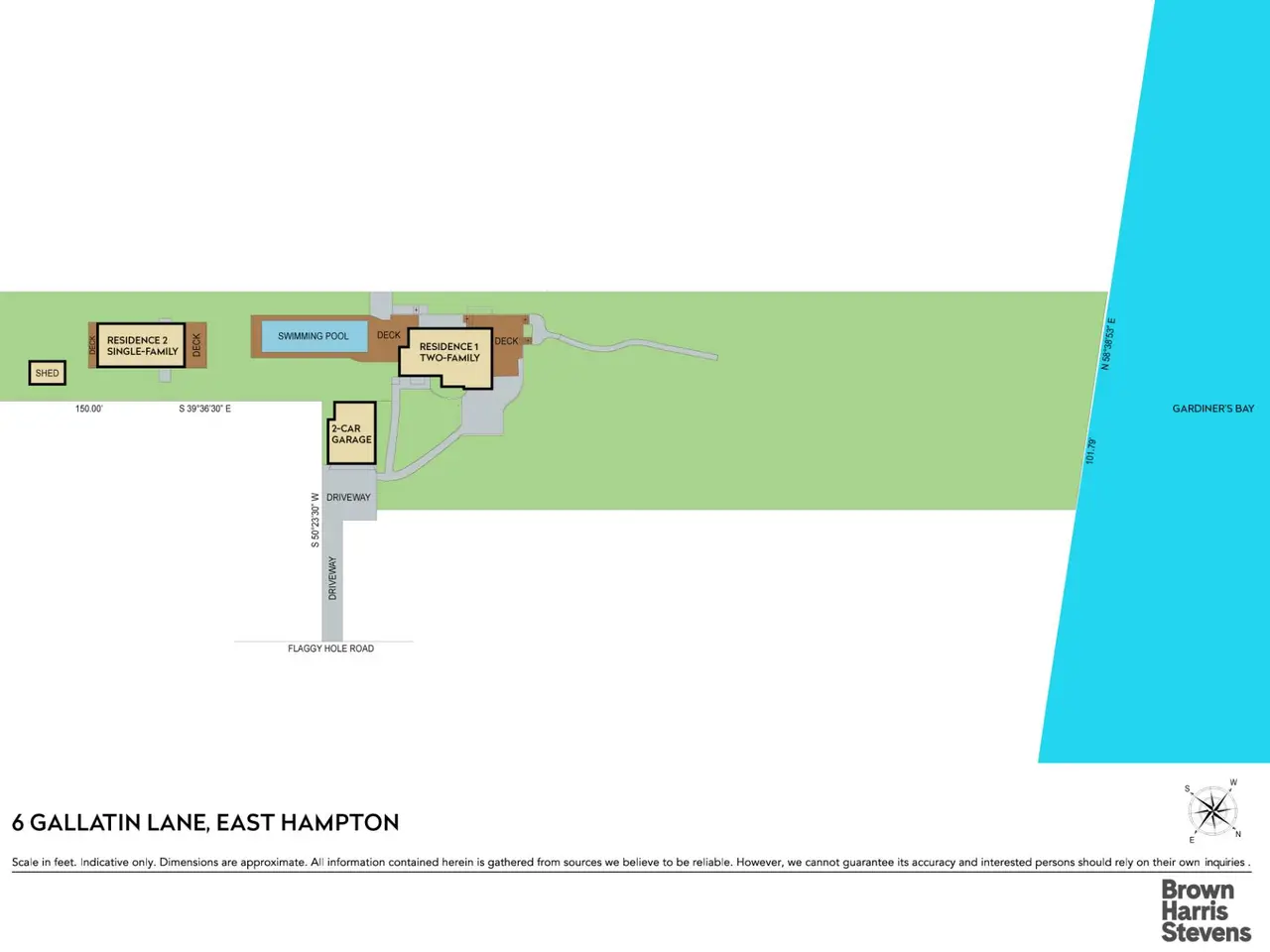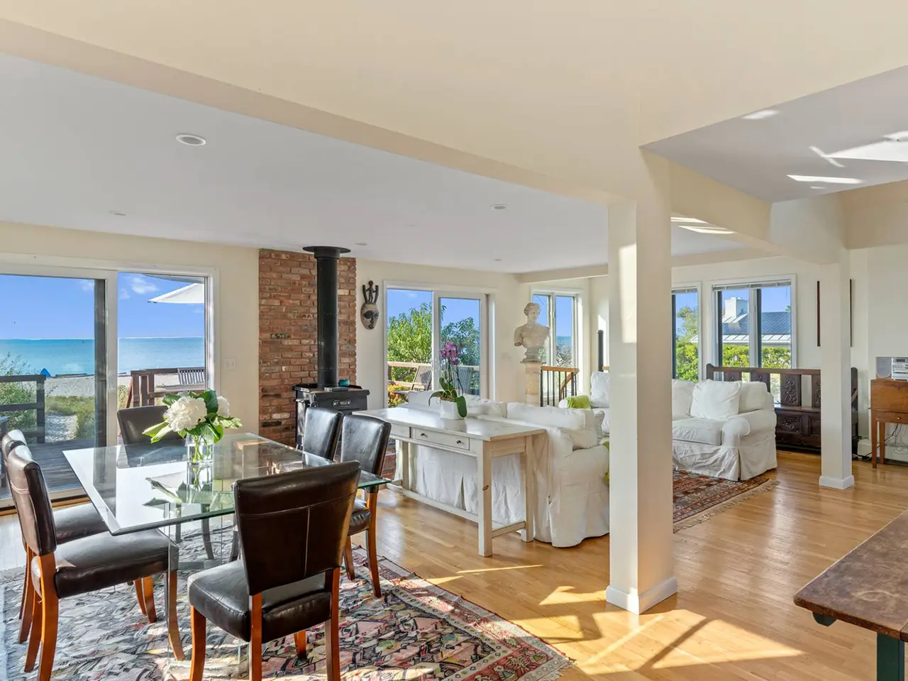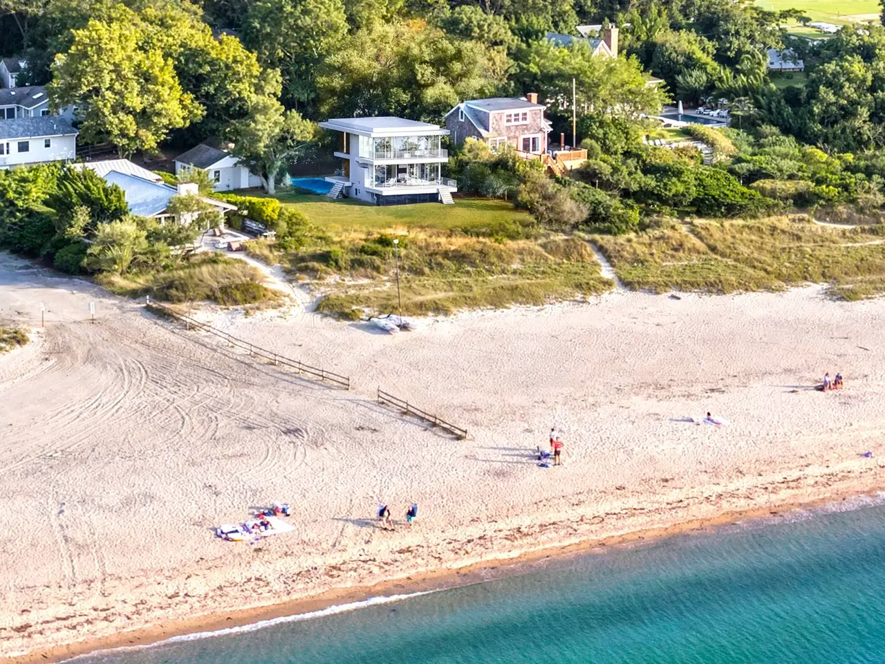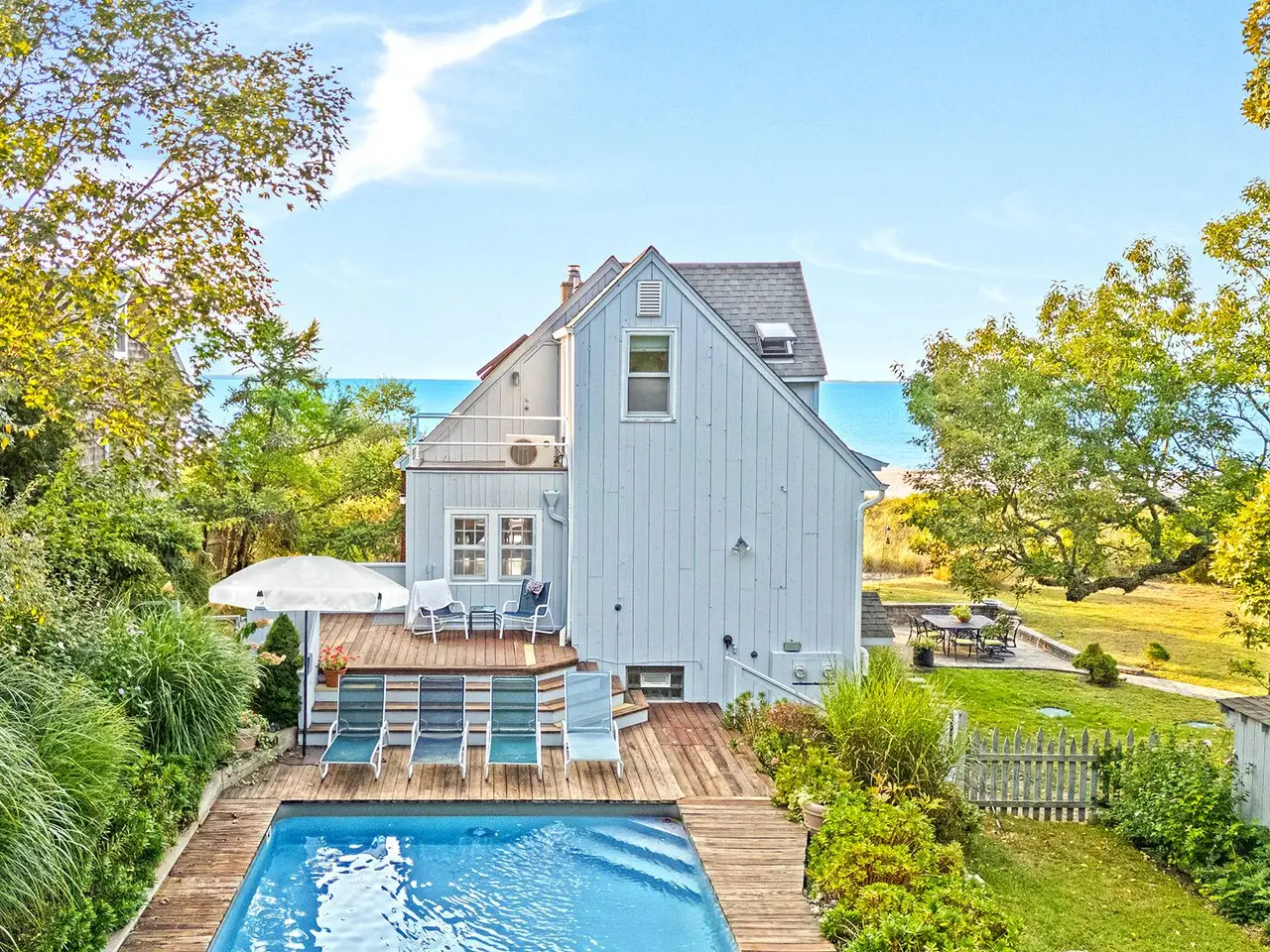 This extremely interesting multi-family compound on a one acre with 102' of sandy beach features the most magical sunsets. With panoramic views across Gardiner's Bay to the North Fork and Connecticut. The combination of dwellings has a total of 7 bedrooms, 4.5 bathrooms, a two-car garage with lean-to, separate shed, heated lap pool, and brand-new hydro action I/A septic system. The primary waterfront house begins mid-level and is dominated by a common living and dining space with large windows and sliding glass doors for dynamite views across the outdoor deck. The kitchen, 1 bedroom and 1 full bath complete this level. The upper level includes the primary suite with private balcony, 1 bedroom, office landing area and rear deck overlooking the pool. The ground level apartment has separate walk out access and includes a full kitchen, dining area, living room, 2 bedrooms and 1 full bathroom. Driveway access to the primary residence is found off Flaggy Hole Road where there is also a two-car garage. A completely separate legal dwelling with access from Gallatin Lane includes 2 bedrooms, 1.5 bathrooms and a full basement. The ground floor has an open living concept with fireplace and powder room. The second floor has a generous bedroom with balcony and views, second bedroom, full bath and laundry. Separate storage shed. This property offers a rare experience on Gardiner's Bay.