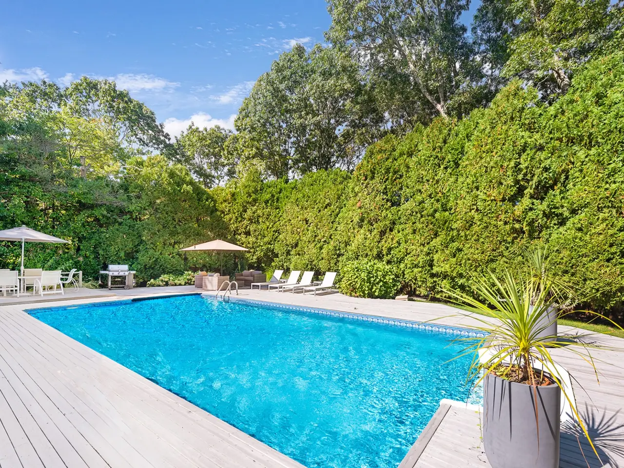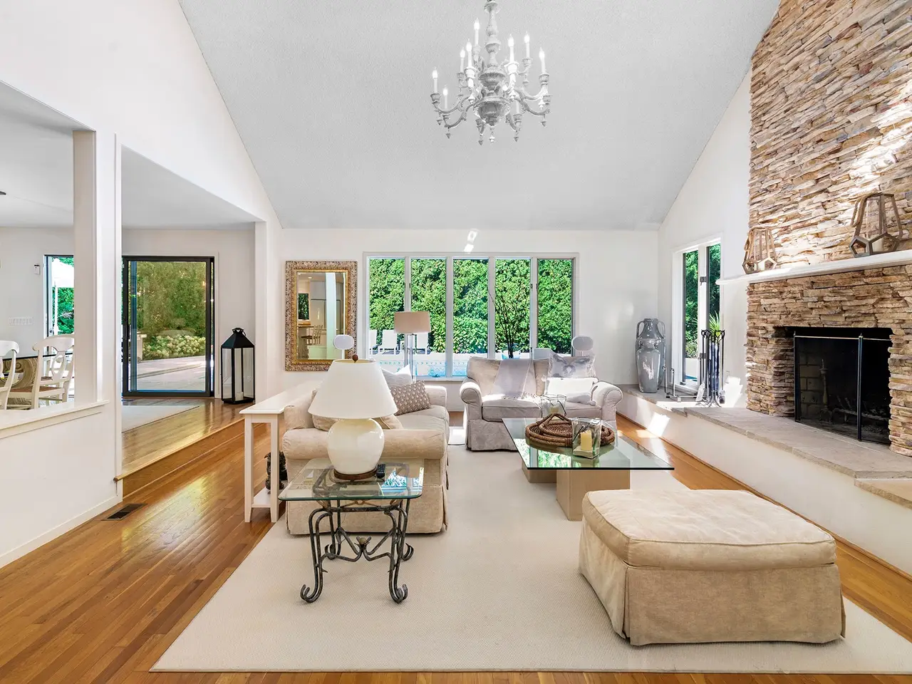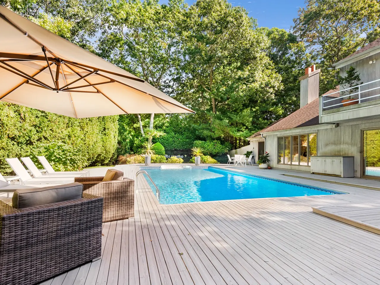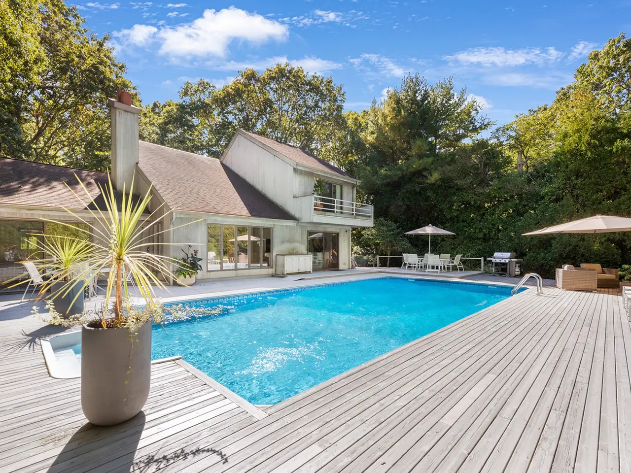 Located in East Hampton, less than three and a half (approximate) miles to the Atlantic Ocean at Main Beach, this three bedroom and two and a half bath Hamptons contemporary home embodies casual sophistication and a truly modern beach lifestyle. Situated in a convenient East Hampton village fringe location, the home features a vaulted living room and a breathtaking two-story stone fireplace, creating a warm and inviting atmosphere. The open-concept design seamlessly connects the living area to the dining room and kitchen, creating a perfect setting for entertaining. Lined with glass sliders, the great room offers panoramic views of the pool area and the ability to effortlessly transition between indoor and outdoor spaces. The first-floor primary en suite bedroom has a double height ceiling and a cozy fireplace, setting the tone for ultimate relaxation. Recently renovated, the new bath exudes modern opulence with a spa-like open shower. On the second level, two additional bedrooms along with a full bath provide ample space and privacy for guests. One of these bedrooms offers a terrace overlooking the pool area, offering a tranquil spot to unwind while enjoying the beautiful surroundings. The expansive deck provides the perfect space for outdoor dining, sunbathing, or simply enjoying the heated pool and unique blend of luxury, comfort, and privacy.