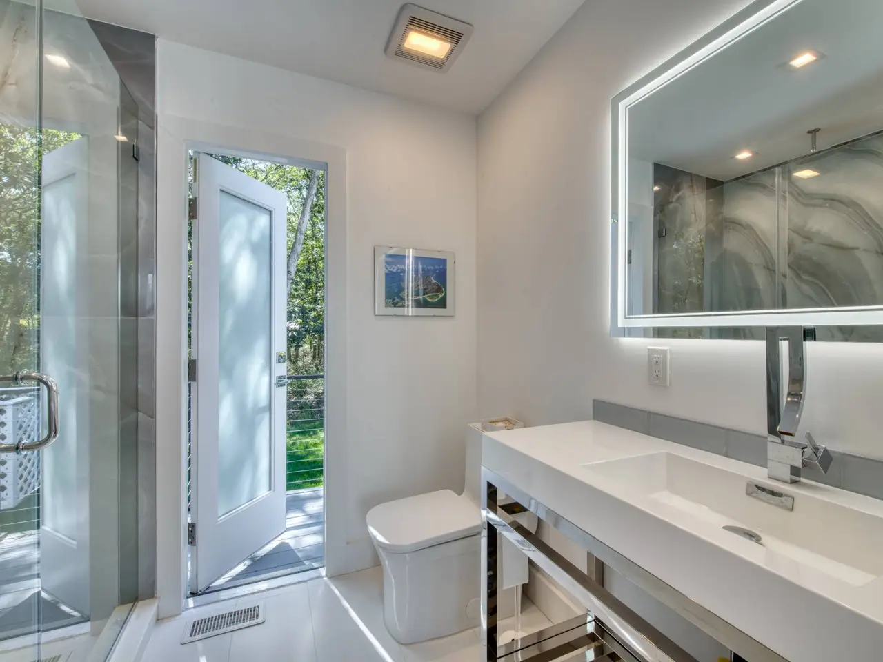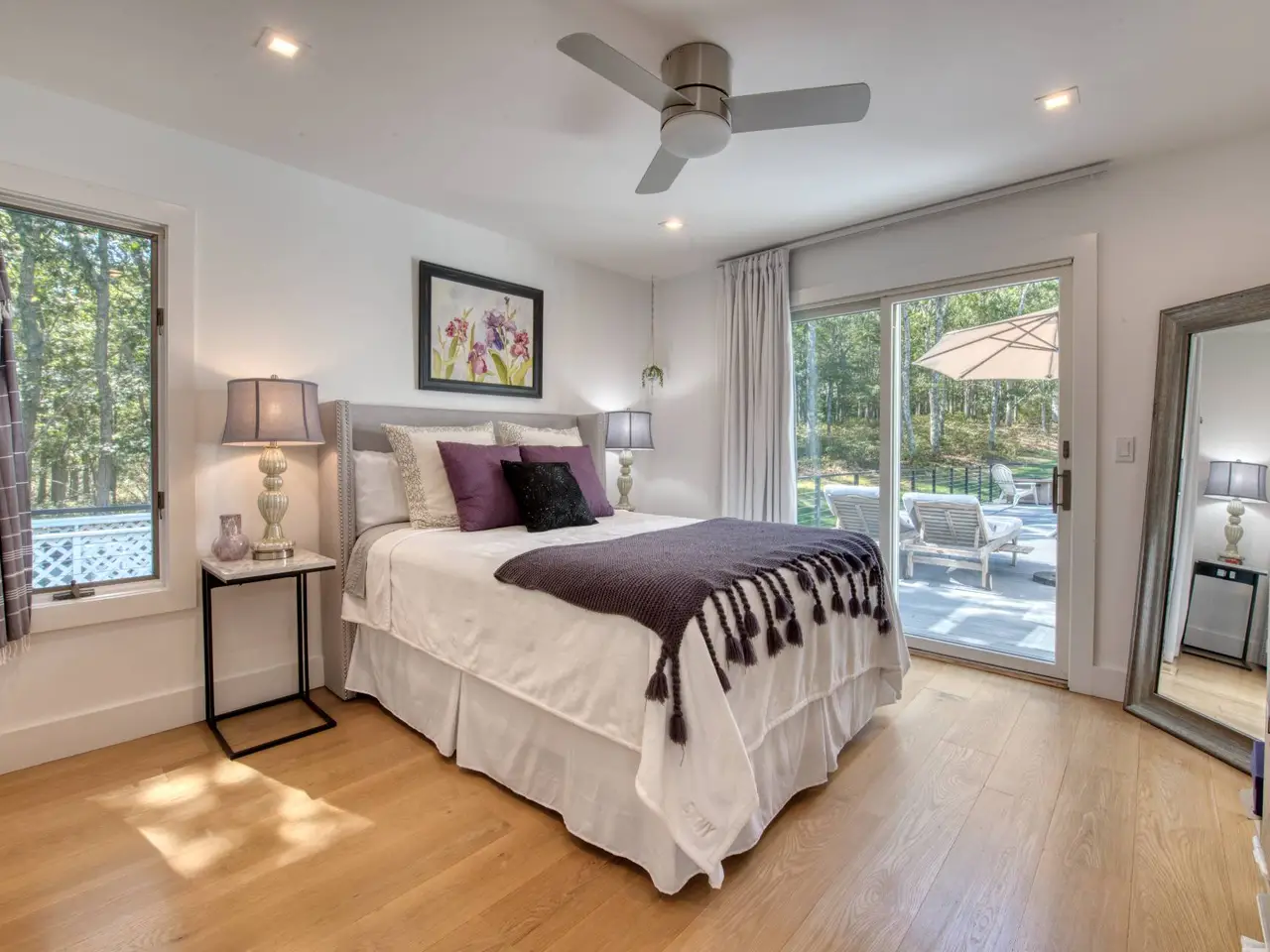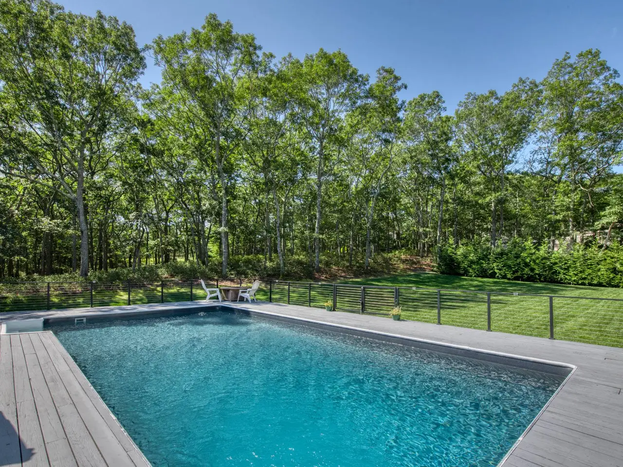 Step through double glass doors into a light filled living room with soaring 12' ceiling, a wood burning fireplace, and expansive views of the pool, yard and atrium. Designed to blur the line between indoors and out, this home offers nature-filled days and starlit nights-all from your living room. The open kitchen features top-tier appliances, including a 6-burner Wolf range, 4-door refrigerator/freezer, hidden coffee bar, and a stylish bar nook. a full guest bath also offers convenient pool access with an additional door to the pool deck. The primary suite boasts 10' ceiling, a walk-in closet, and spa-like bath with freestanding tub. Sliding doors open to a mahogany deck with a private outdoor rain shower. 8" white birch floors flow seamlessly throughout the main level. The lower level includes a laundry room, den, gym with an egress window (easily convertible to a 4th bedroom). Recent upgrades include all new utilities (AC/heat split ducted system, water heater, water pump electric upgrade), a new roof, new pool liner and mechanics. Total square feet of living space is 2,940 with the easy option of a 4th bedroom. The Belgian block lined circular driveway offers ample parking. Property backs an equestrian trail. Large 24'x24' garage with 11' ceiling. Close access to the Village, 1/2 mile to Round Swamp Farm and 1-1/2 miles to Nick and Toni's. This move-in-ready home perfectly blends modern comfort, thoughtful design, and prime location.