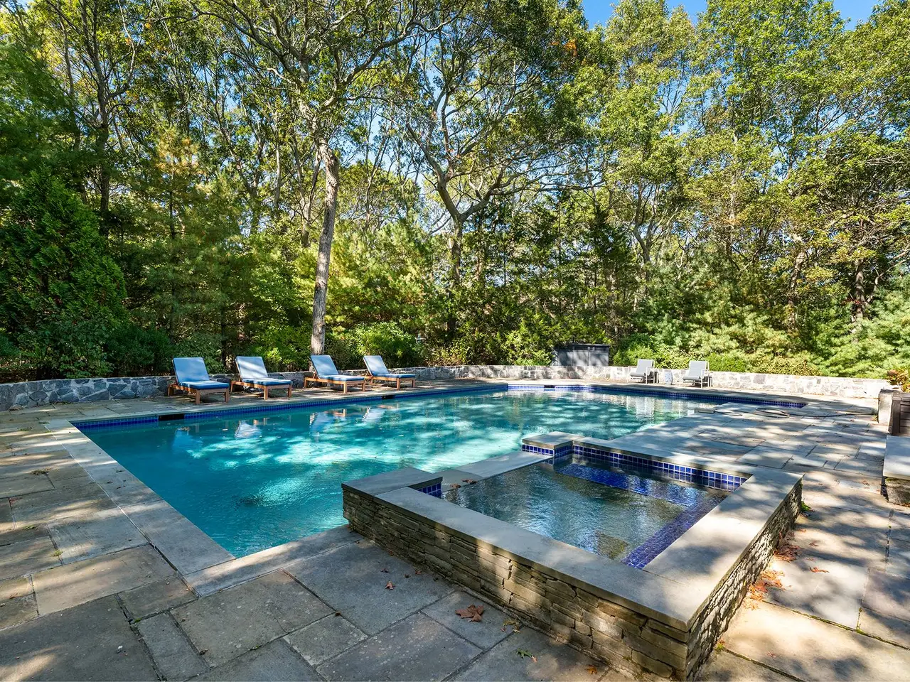 This gated modern contemporary residence, designed by renowned architect Myron Shulman, is a rare Hamptons offering that combines modern elegance with timeless sophistication. A sun-filled entryway opens to an expansive great room with soaring double-height ceilings and glass sliders, creating a seamless connection between indoor and outdoor living. Ideal for entertaining, the open layout flows effortlessly to the landscaped grounds and the 25' x 50' heated saltwater Gunite pool. The first-floor primary suite offers ample space with an ensuite bath and a private deck overlooking the lush, mature gardens. A versatile guest suite or office with a full bath also serves the main level. Upstairs, two well-appointed bedrooms-one with a private balcony-share a refined bathroom. The finished lower level provides additional living space and a private gym, completing this exceptional home. Located just moments from Sammy's Beach and several other private bay beaches, as well as East Hampton Village, this property encompasses the Hampton's lifestyle-private, tranquil, easily accessible to fun outdoor activities, high-end village shopping, and fine dining.