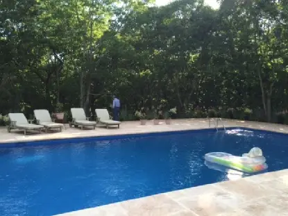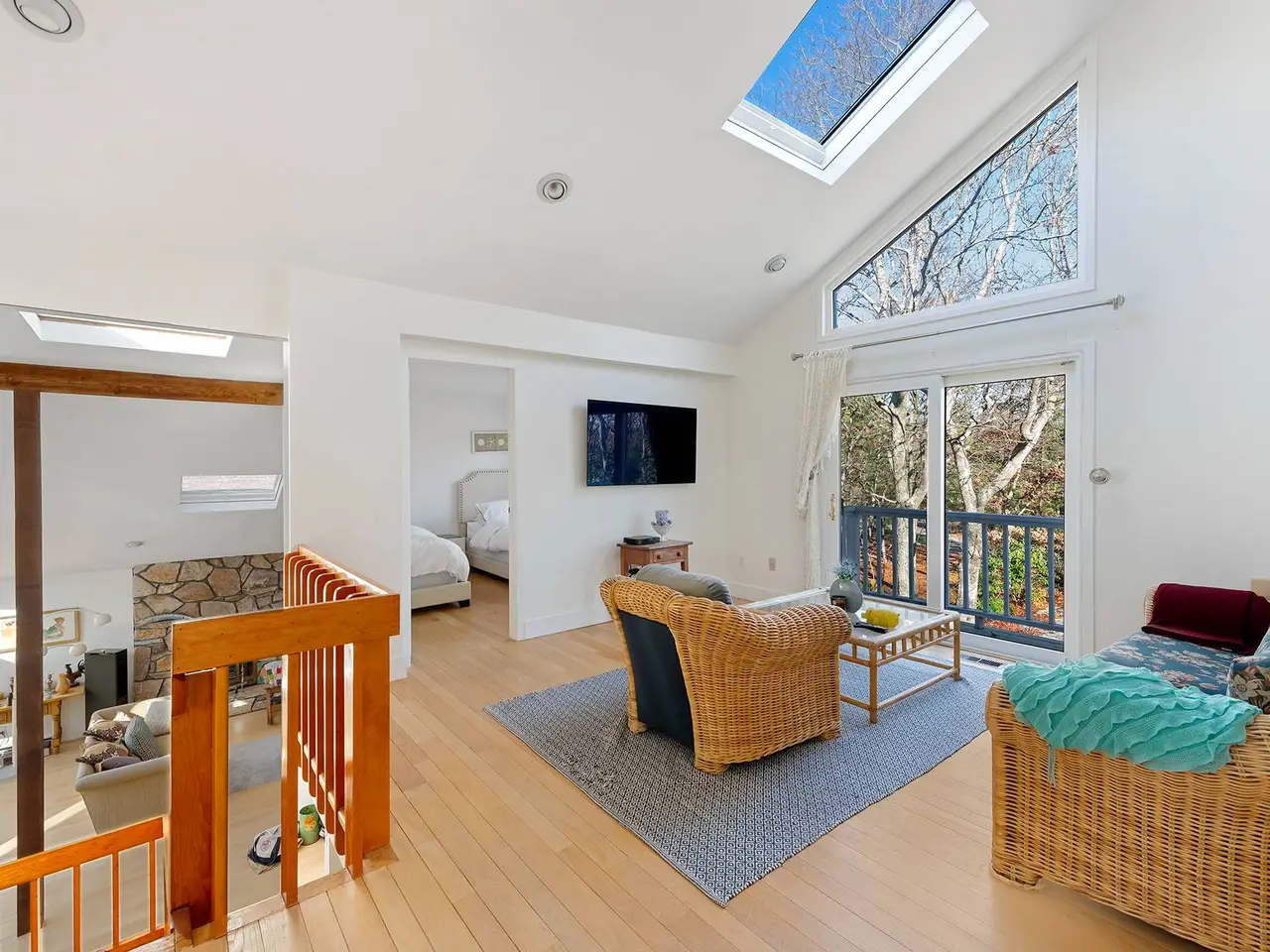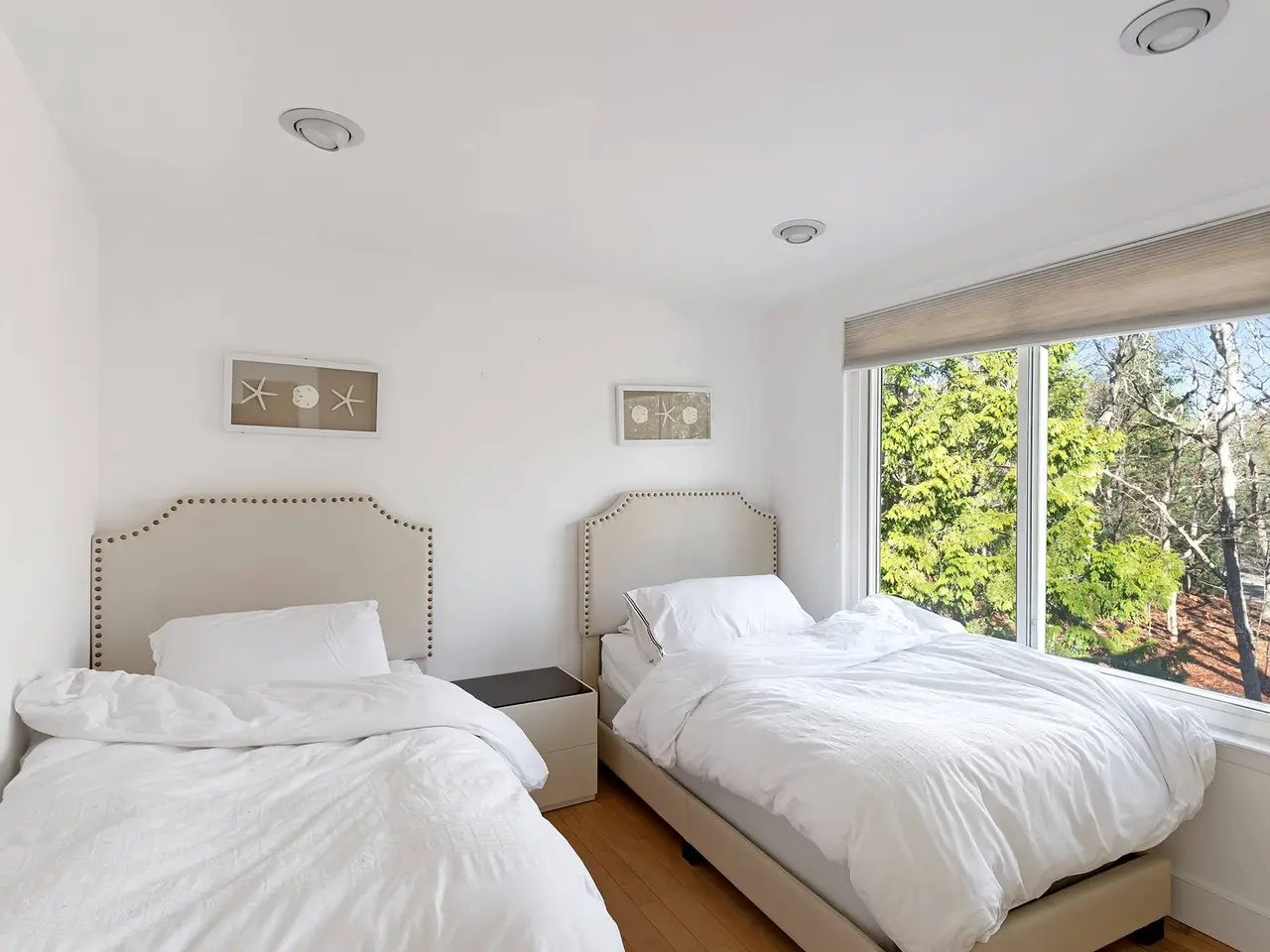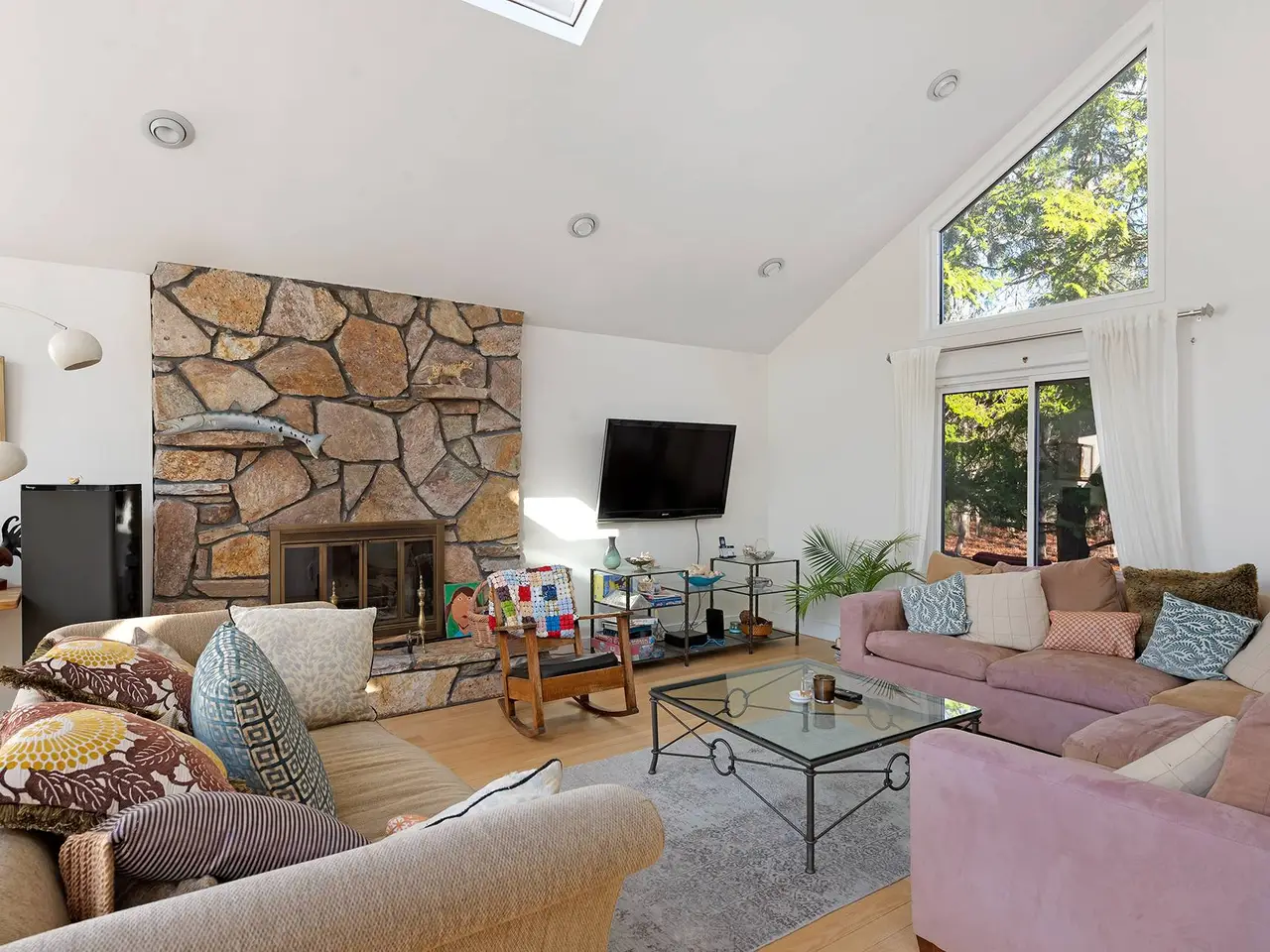 Rental Registration #: 23-18. Striking contemporary, privately situated on a beautifully landscaped approximately one-acre property. Features include a sun-drenched living room with fireplace, dining area, kitchen, four bedrooms, and two and a half baths. Additional amenities include central air-conditioning, outdoor shower, expansive decking, and a heated pool.