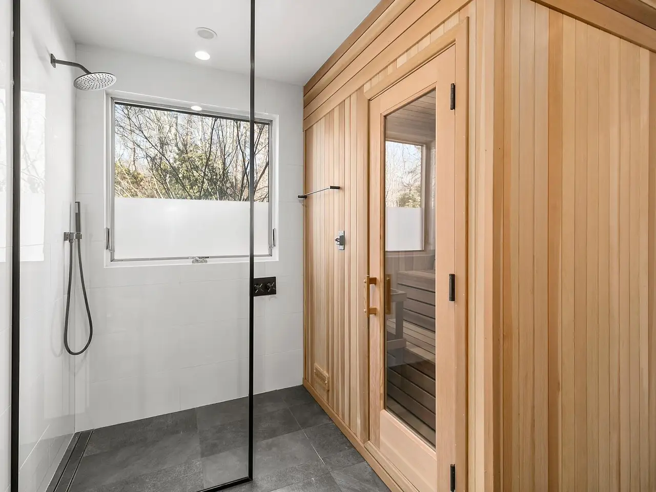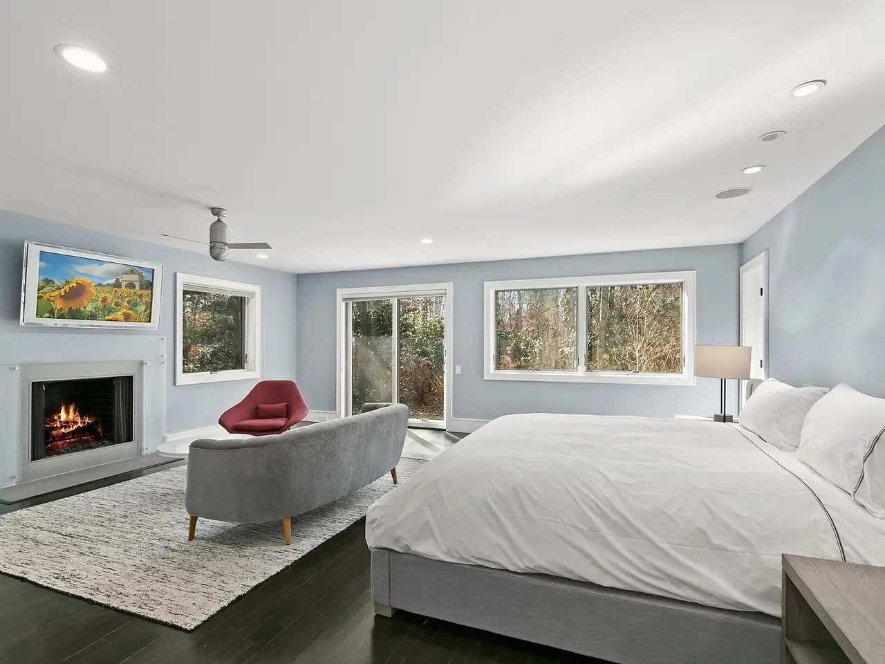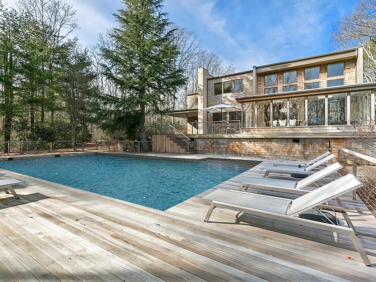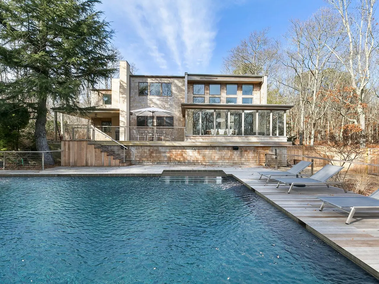 Rental Reg. # 22-54. Renovated in 2017, sublimely modern, but comfortable, this four bedroom, 4.5 bath house has a soaring double-height open living/ dining area leading to a comfy screened porch overlooking the heated pool. First floor primary suite has a gas fireplace and an adjacent sauna. Beautifully appointed and perfect for relaxing no matter what room you're in. A gourmet kitchen completes the picture. Equidistant between East Hampton and Sag Harbor.