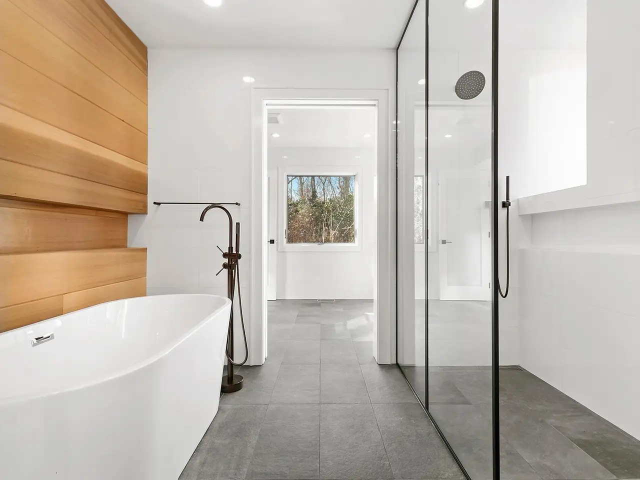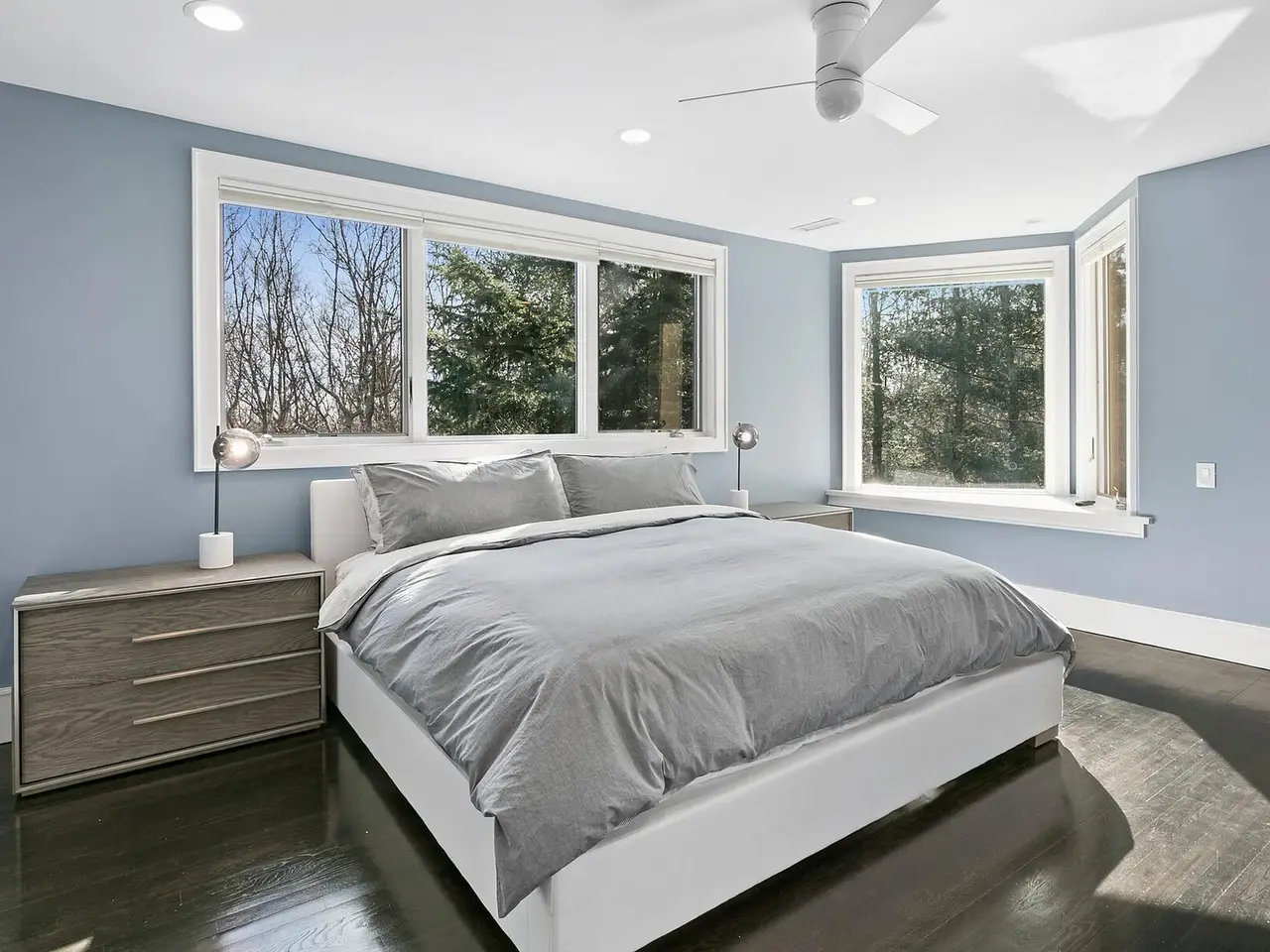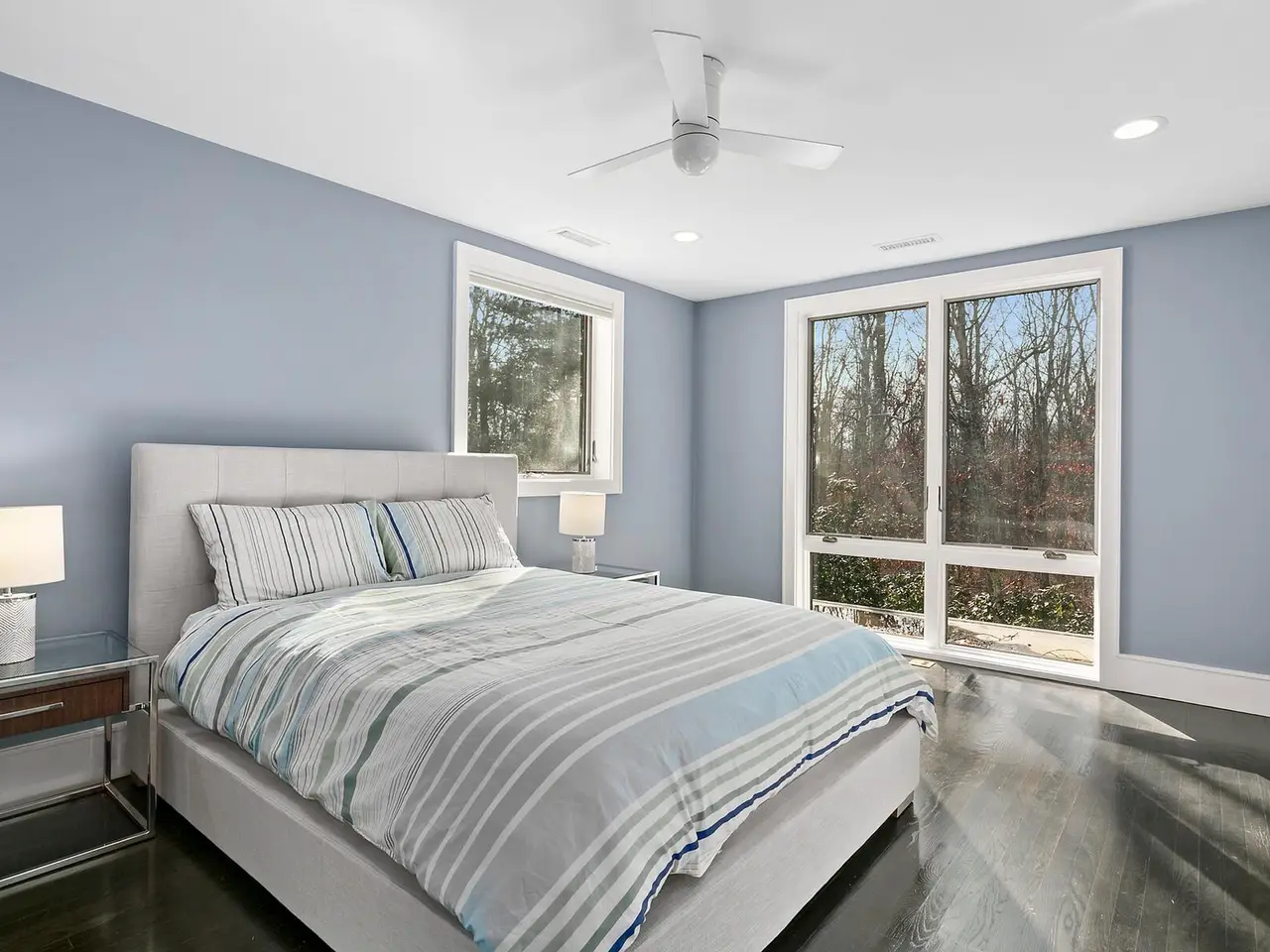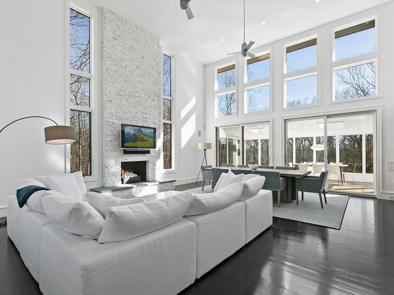 Rental Reg. # 22-54. Renovated in 2017, sublimely modern, but comfortable, this four bedroom, 4.5 bath house has a soaring double-height open living/ dining area leading to a comfy screened porch overlooking the heated pool. First floor primary suite has a gas fireplace and an adjacent sauna. Beautifully appointed and perfect for relaxing no matter what room you're in. A gourmet kitchen completes the picture. Equidistant between East Hampton and Sag Harbor.