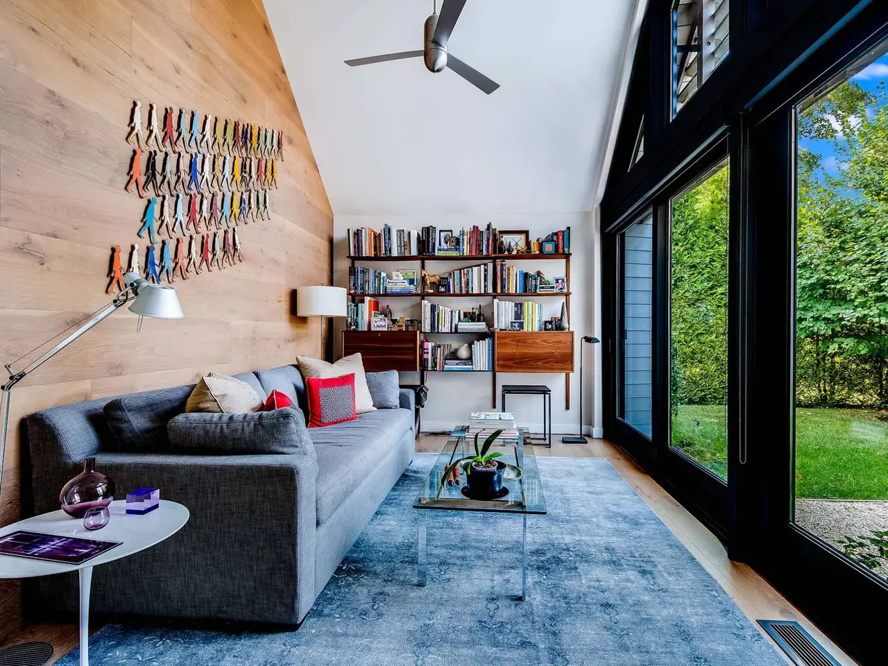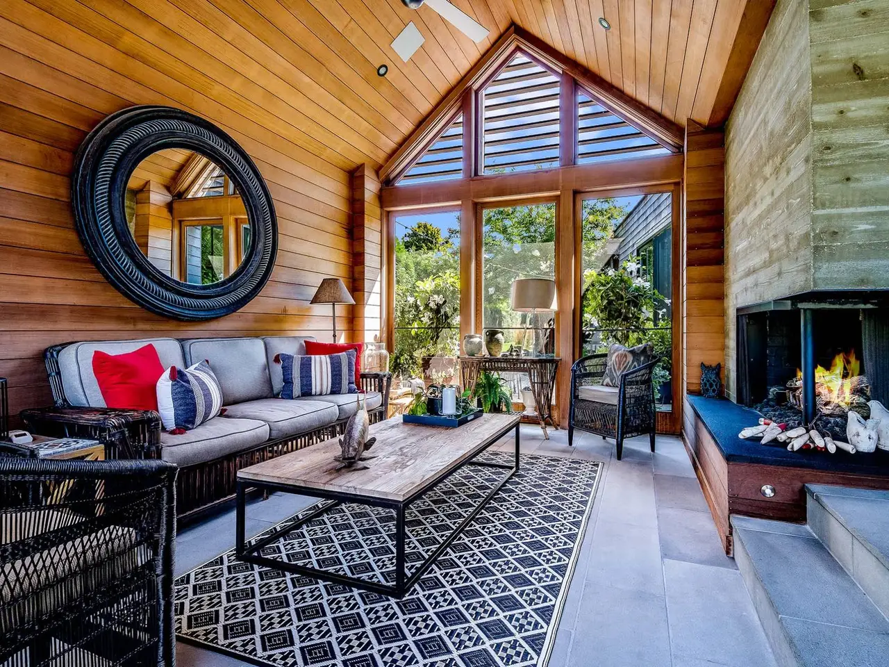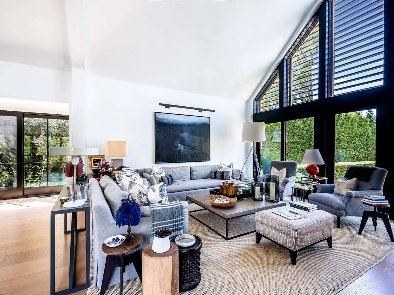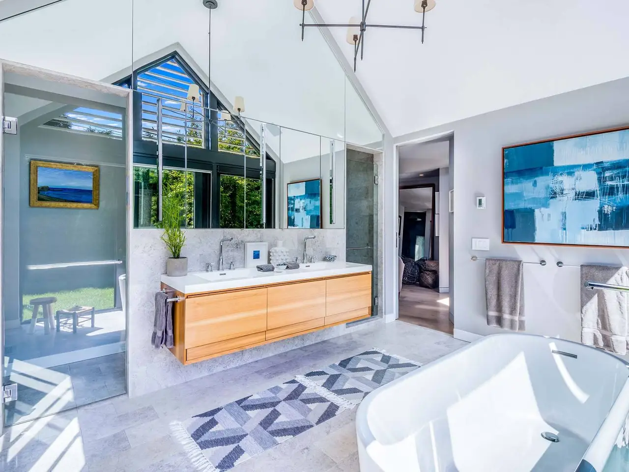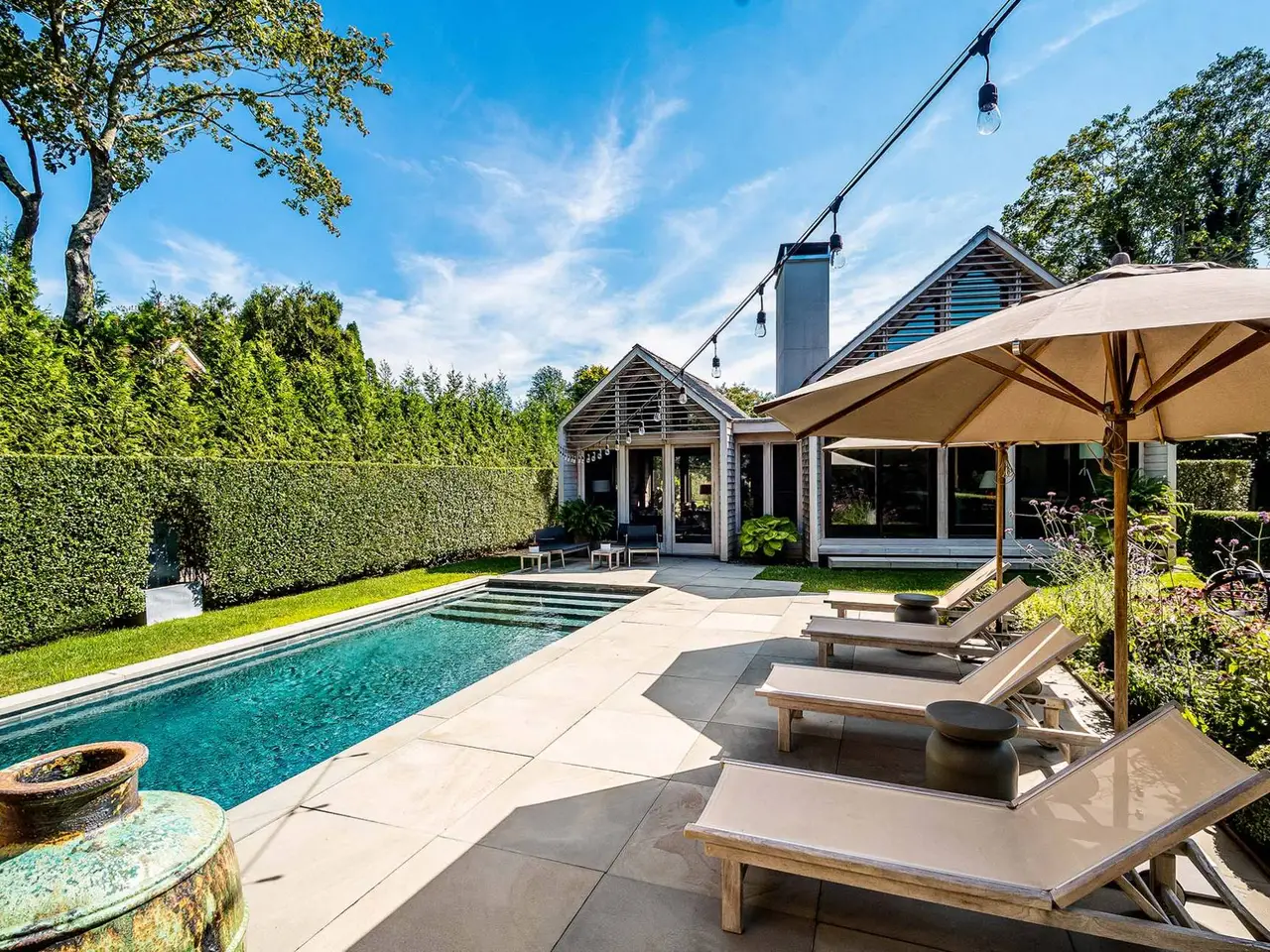 This ultra-chic new construction is pleasing from every angle. High-end finishes, sleek, top of the line everything, in this now 5 bedroom, 4.5 bathroom beach house. The oversized central living space is stunning, with high cathedral ceilings and walls of glass on three sides. Sparkling Sub Zero/Wolf kitchen with wine fridge, natural stone counters, and custom glass backsplash. Added amenities include a screened-in sunroom and a fully equipped gym. All bathrooms feature walk-in showers, Grohe fixtures and Toto toilets. Beautifully landscaped grounds host a large stone patio, a heated gunite pool, pool house, and two outdoor showers, one conveniently located next to the Primary Bedroom, the other closer to the pool. Nicely proportioned half-acre lot, with electronic gate and privacy hedges; convenient to all in the heart of East Hampton Village.