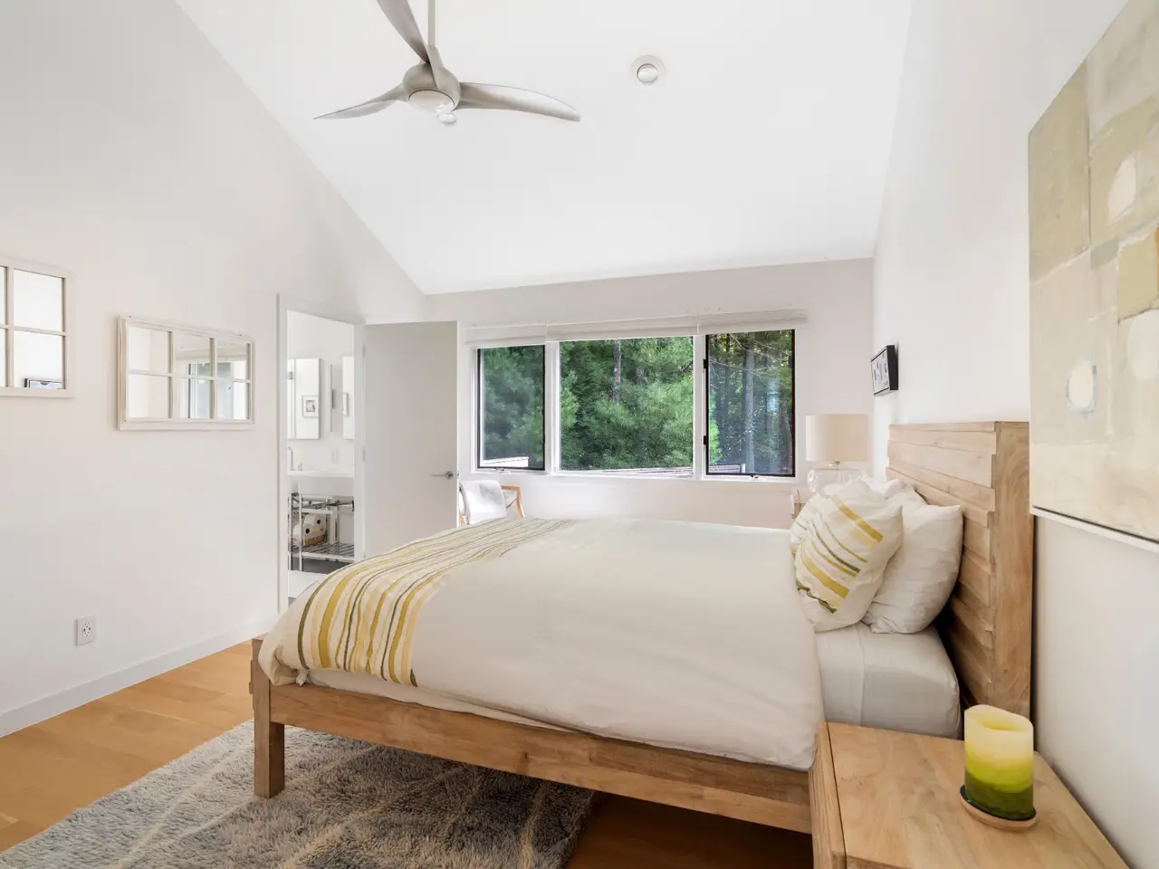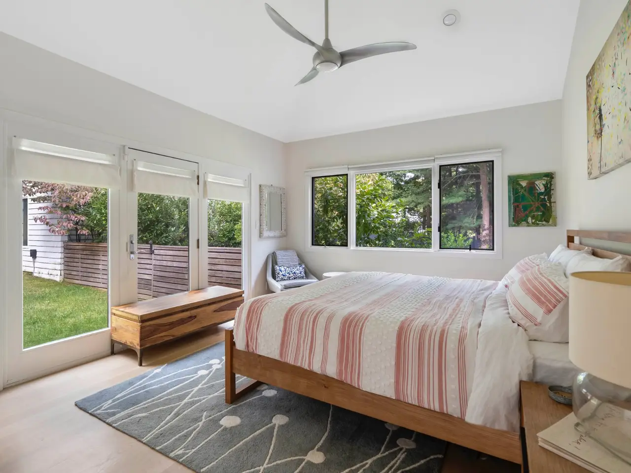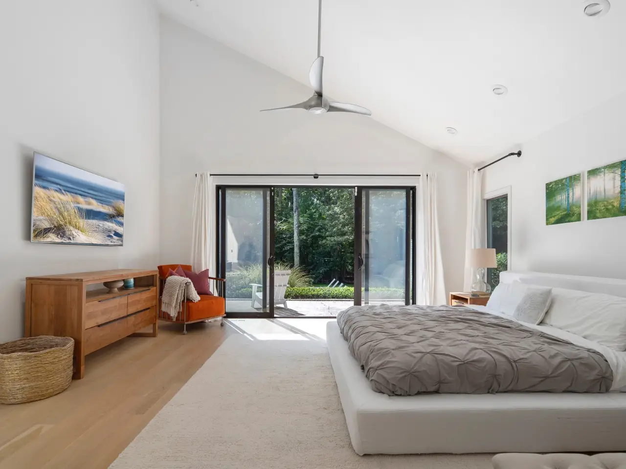 Open and bright, this wonderful contemporary home is just a short distance from East Hampton Village and ocean beaches. Located on a quiet street, the newly renovated 3,400 square-foot five bedroom, six bath residence features great windows and high ceilings in most rooms in addition to a large finished lower level with an additional 1,000 square feet of living space. A 20 x 40-foot heated pool and pool house are accessed by a dramatic grass stairway from the open living and dining area.