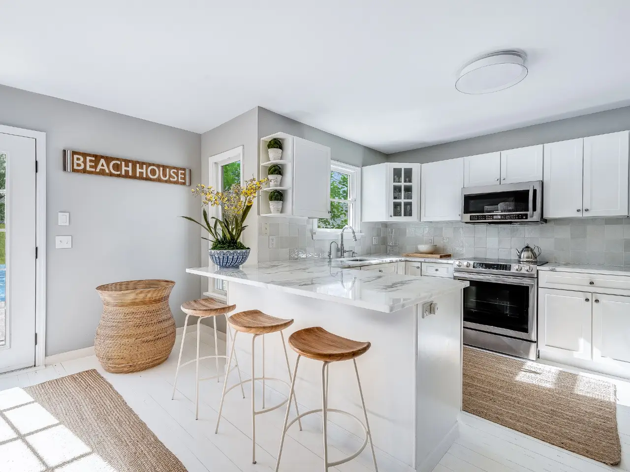 Wonderful designer farmhouse featuring approximately 2,200 square feet of stylishly renovated living space across two levels. The main floor includes a custom kitchen with island bar seating that opens to the dining area leading directly out to the back deck. A beautifully furnished living room with fireplace, full bath and a den/office complete the first floor. The second floor features an extra-large en suite primary with three additional guest bedrooms and a full bath. Outside, the heated pool is surrounded by a lush lawn and hedges providing the perfect place to relax. Moments away from Maidstone Beach, waterfront restaurants, marinas, art galleries and farm stands, 65 Lincoln Ave is the perfect summer getaway.