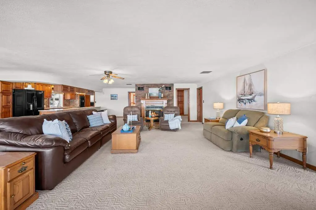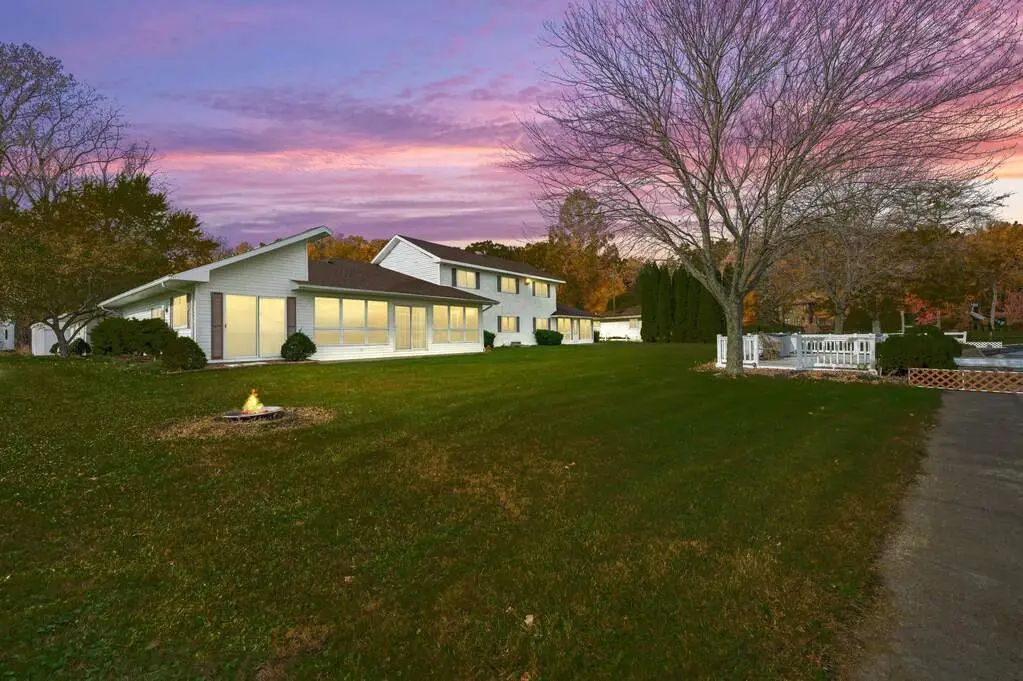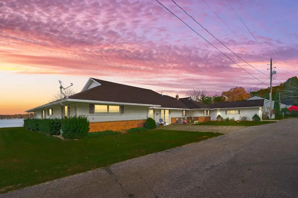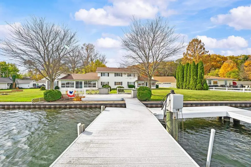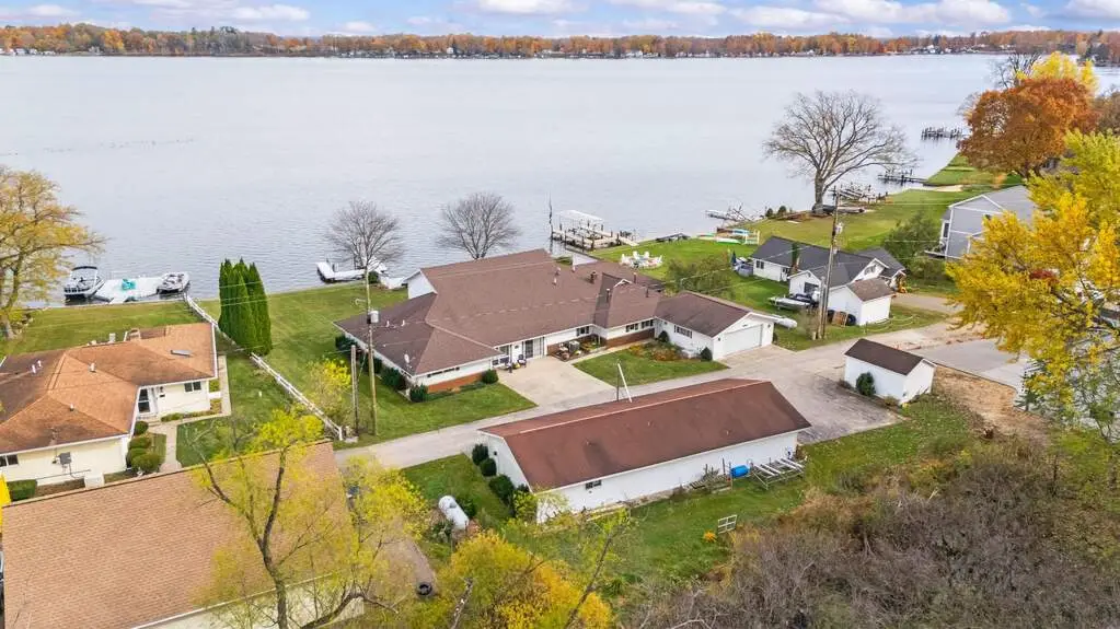 Welcome to Indian Lake in the Sister Lakes area of Southwest Michigan. This expansive property offers 140' of flat, sandy shoreline with peaceful sunrise views. The home lives like a ranch, with the primary bedroom suite located upstairs plus a second ensuite bedroom on the main level. Three additional main-level bedrooms and two more baths offer space for everyone. Enjoy a spacious game room with bar, three-season room, and hot-tub room. A connected 2BR/1.5BA apartment provides flexible space for guests, related living, or rental use. Outdoor living includes a large composite lakeside deck, permanent pier with lift, seawall, and sandy-bottom swimming. Storage is abundant with an attached 2-car garage, detached garage with workshop for boats, lake gear, and golf carts, plus an additional shed. Indian Lake is a 500-acre all-sport lake with a 27-hole golf course, clubhouse, and rare yacht club offering fuel service, social events, and a 4th of July boat parade. 2 hours from Chicago