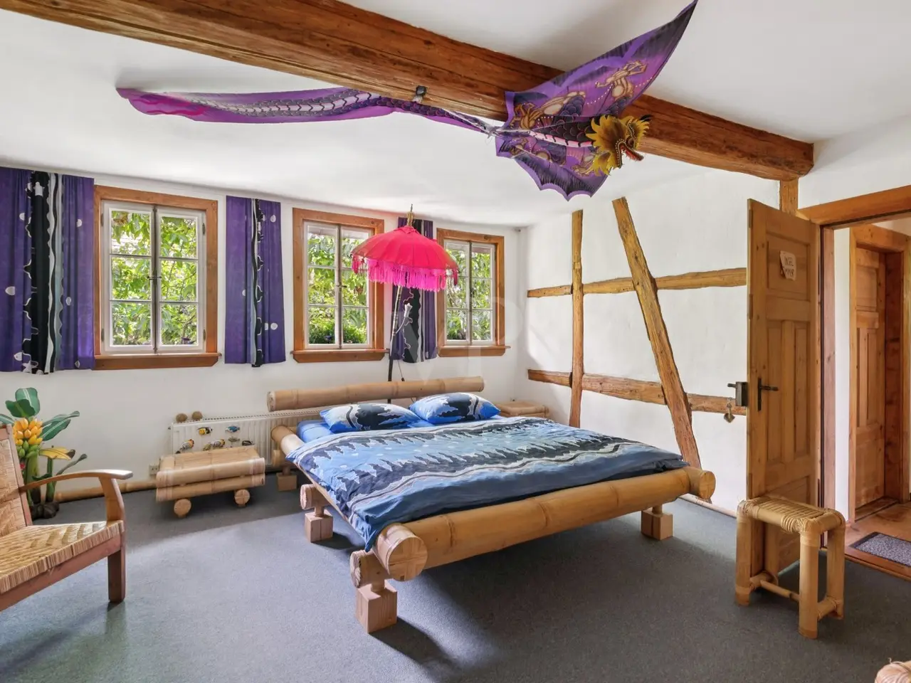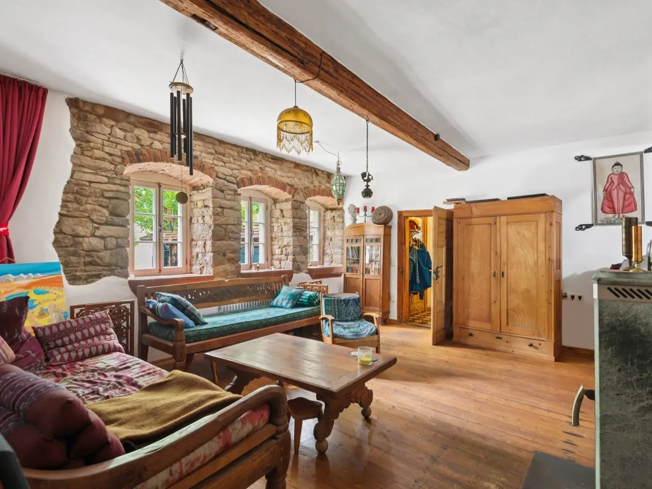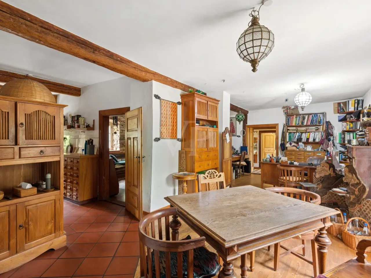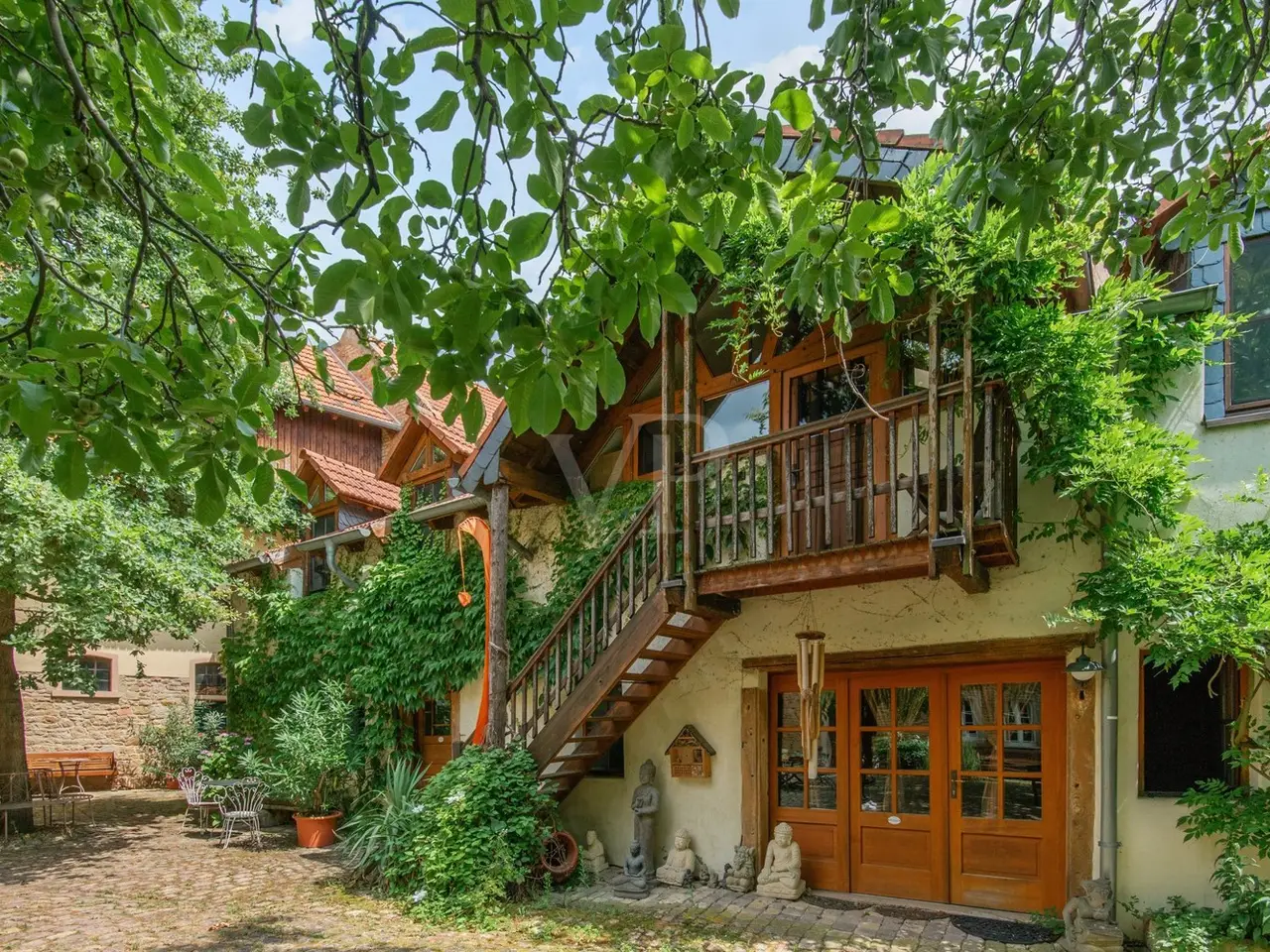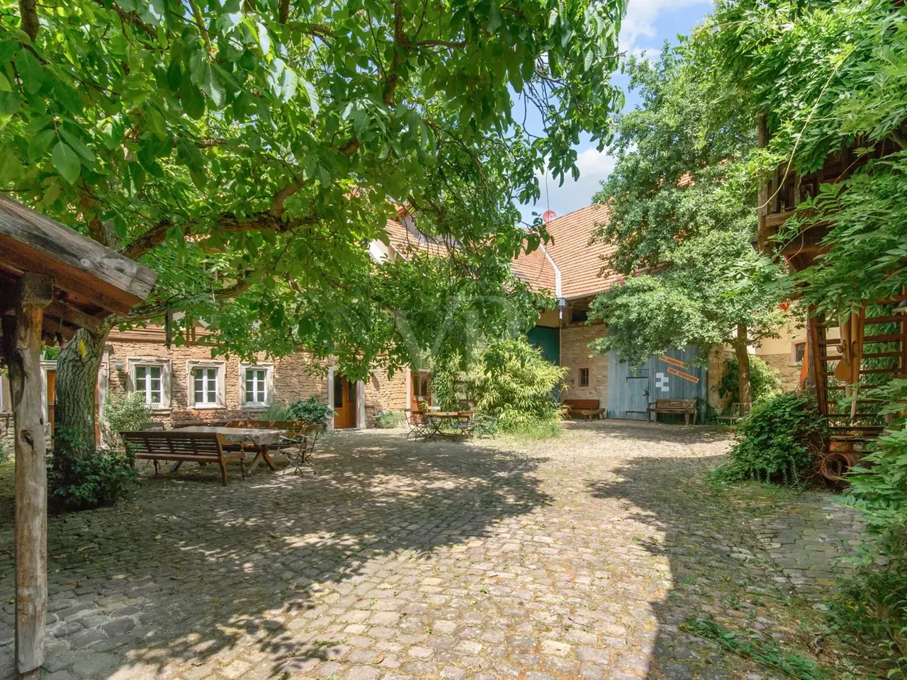 The property on offer here, in the form of a listed 3-sided farmhouse, combines Rhine-Hessian history with modernity as well as a high quality of living and working in a quiet yet very well connected location in an incomparable way. The property, which was first mentioned in the church records of the Eberbach monastery in 1591, consists of a main house with a first floor apartment with a private terrace for personal use, with individual guest and hotel rooms including bathrooms on the upper and top floors, as well as a hotel kitchen, a breakfast room and a training room on the top floor with a view over Eckelsheim. There is also an apartment building opposite in the courtyard with three apartments of different sizes, each equipped with a kitchenette, bathroom, dining and sleeping area. The top floor apartment also has a roof terrace. If this space is still not enough for you, the two adjoining barns offer plenty of scope for further expansion on the ground and top floors. This constellation offers future owners all kinds of living and usage options. Whether multi-generational, live and work, live and rent, commercial, Airbnb, bed and breakfast or as a complete investment, all of these can be combined and implemented here. The farmstead was completely renovated in 1990 and has been continuously expanded. Great importance was attached to the historical character and the building biology aspects using clay plaster, cellulose and wood fiber insulation. From an energy point of view, efficient condensing boilers powered by liquid gas with solar hot water support have been installed. The service water is supplied by a professional system from a 12 m³ cistern. After entering the property through the archway into the cobblestone courtyard with its old trees, you immediately feel at ease, unseen and at home. It immediately slows you down from a stressful everyday life. Once you have found your way around, you will be surprised that such a courtyard and building ensemble, which has been renovated with so much attention to detail, refurbished and well maintained, is so inconspicuous in the middle of an old village center. The individual guest rooms and apartments are all individually designed and have an Asian touch and cultural elements. An equally important aspect for future owners is the fact that no fundamental renovations are pending. Exceptions to this are the further expansion areas in the barns. You will find a detailed breakdown of all other conversions of the individual buildings over time, as well as the floor plans, under "Features, details" and "Layout". You are welcome to view this exclusive property on site and let the details speak for themselves.