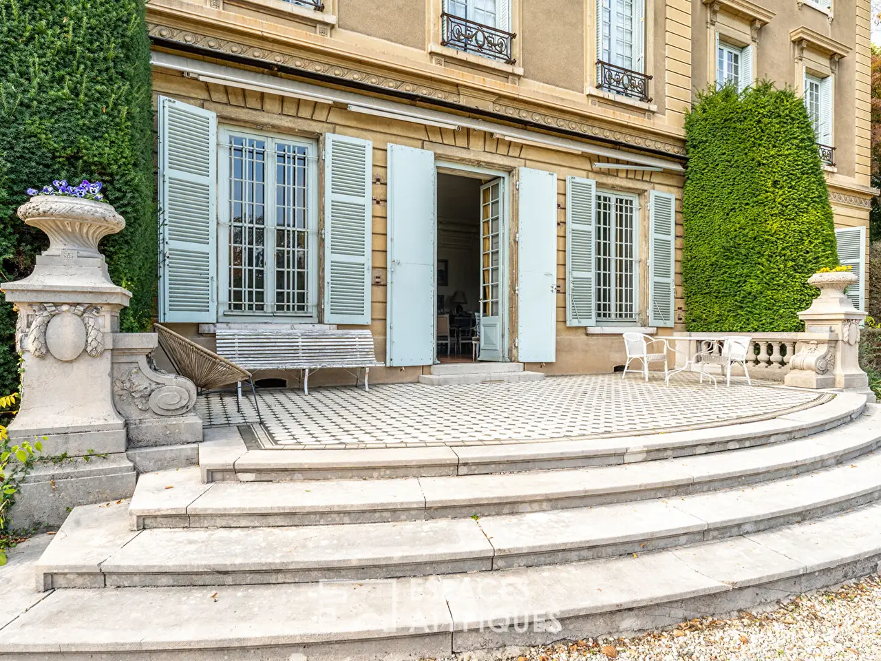 Located in the heart of Écully, within a private mansion converted into an intimate condominium, this exceptional single-level apartment offers over 310 square meters of living space nestled within a wooded park of more than one hectare. From the moment you enter, the tone is set: majestic volumes, abundant natural light, and breathtaking views of the garden, a true haven of greenery in the city. The charm is immediate thanks to period architectural features such as ornamental fireplaces, French parquet flooring, refined moldings, and remarkable ceiling heights, which lend the apartment a rare elegance. The reception rooms flow seamlessly together, offering unobstructed views of the park.The apartment currently comprises four bedrooms, ranging from 20 to 40 square meters, all with beautiful windows; an office; and two bathrooms, providing a living environment that is both warm and functional.The separate kitchen includes a dining room for everyday meals. Renovation work will modernize and adapt this exceptional property to individual tastes. A light-filled veranda naturally extends the living space into the garden, creating a relaxing winter garden.Several private terraces and exclusive use of a portion of the park allow you to fully enjoy this exceptional setting.A garage and cellars complete this exceptional property, rarely available for sale.A unique living space, combining the charm of period features with the tranquility of a private park, just steps from the shops, schools, and public transport in the center of Écully.ENERGY RATING: G / CLIMATE RATING: GEstimated average annual energy costs for standard use, based on January 2021 prices: between EUR12,970 and EUR17,590.Contact: Amandine - 33 6 50 86 46 08REF. 13077Additional information* 8 rooms* 5 bedrooms* 2 bathrooms* 2 floors in the buildingEnergy Performance CertificatePrimary energy consumptiong : 349 kWh/m2.yearHigh performance housing*A*B*C*D*E*F*349kWh/m2.year102*kg CO2/m2.yearGExtremely poor housing performance* Of which greenhouse gas emissionsg : 102 kg CO2/m2.yearLow CO2 emissions*A*B*C*D*E*F*102kg CO2/m2.yearGVery high CO2 emissionsAgency fees* Fees charged to the purchaser : 59 000 €MediatorMediation Franchise-Consommateurswww.mediation-franchise.com29 Boulevard de Courcelles 75008 ParisInformation on the risks to which this property is exposed is available on the Geohazards website : www.georisques.gouv.fr