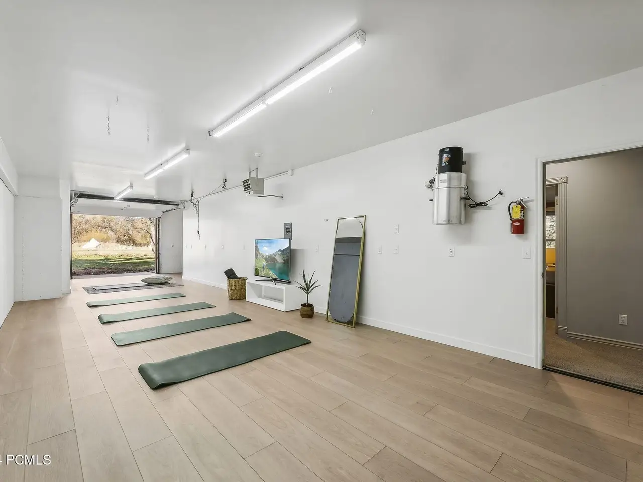 Gym with garage door access Outdoor hot tub
