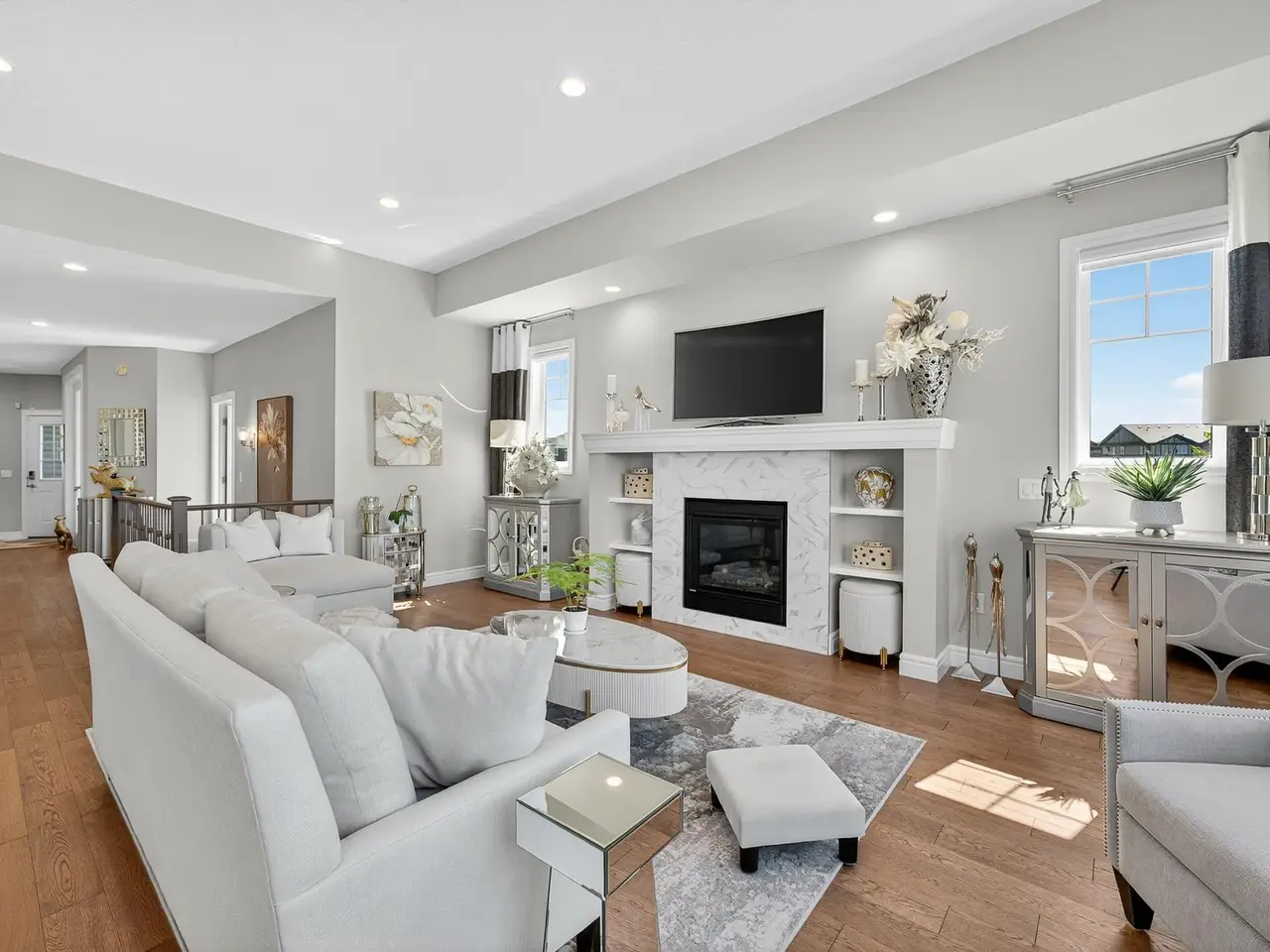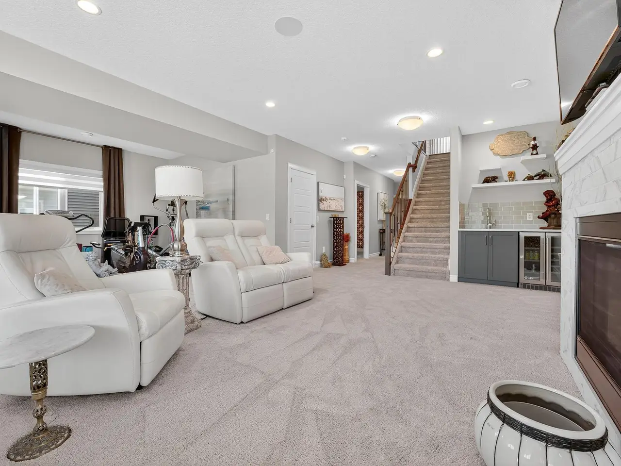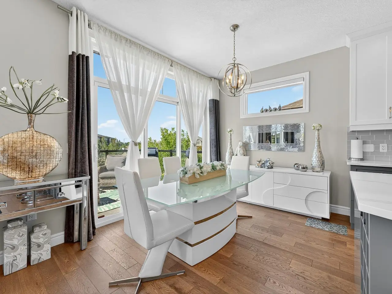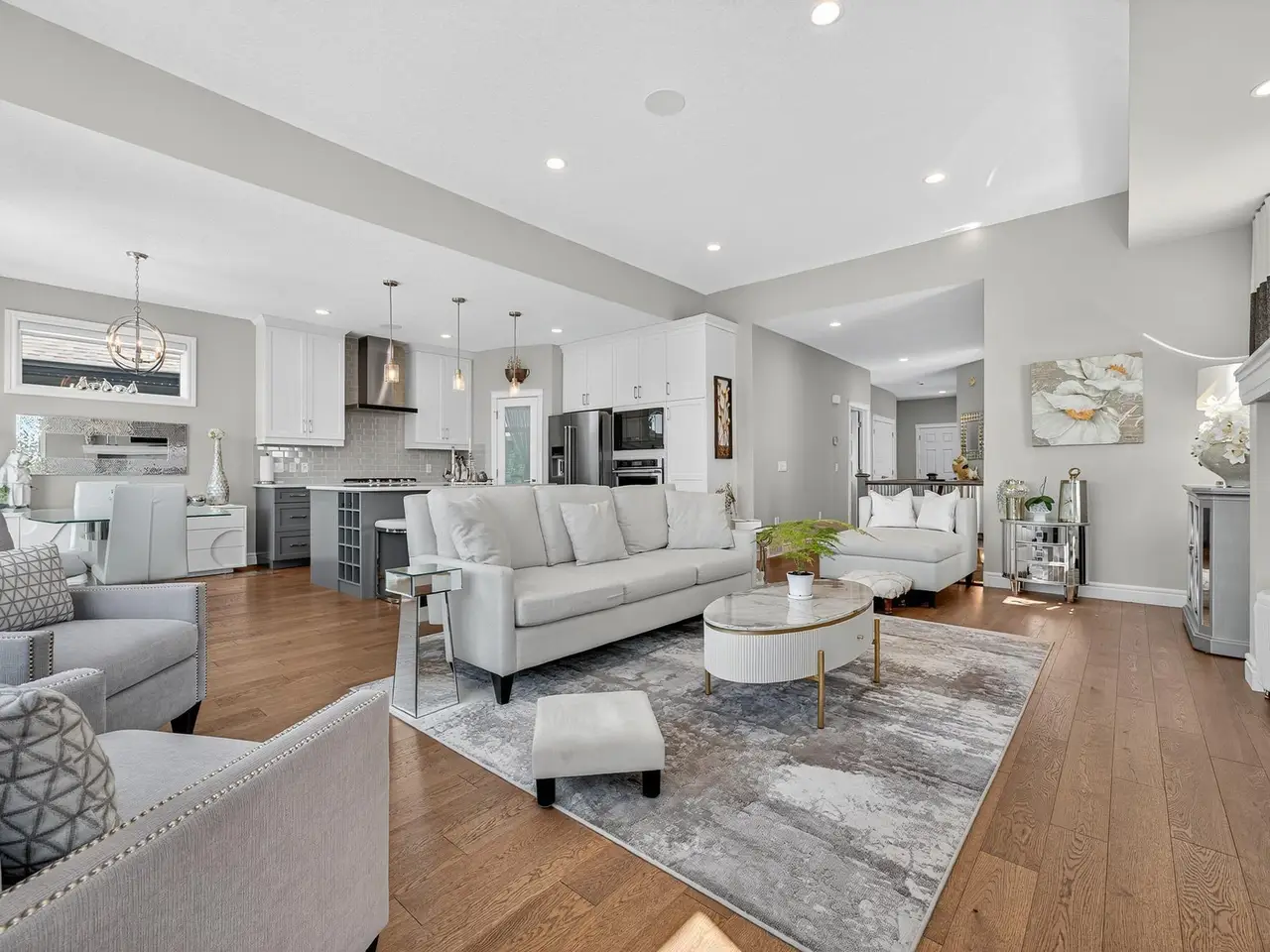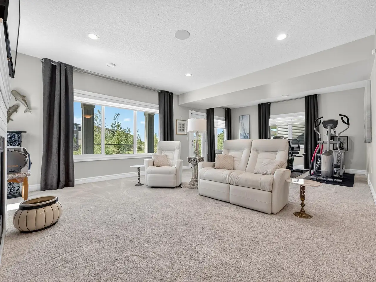 Experience elevated living in this exquisite former showhome in the Vistas at Orchards—a rare walkout bungalow offering 2,600+sqft of designer-crafted space with private southwest exposure backing a scenic walking path. From the soaring entry to the rich engineered hardwood flooring, iron railings, and expansive triple-pane windows, every detail exudes sophistication. The chef-inspired kitchen features floor-to-ceiling cabinetry, quartz counters, and high-end built-in appliances. Relax by one of 2 elegant fireplaces or step onto the sun-drenched deck with glass railings. The luxurious primary suite offers a spa-like 5-pc ensuite and walk-in closet. The finished walkout basement includes 2 bedrooms, second den, rec room, bar area, and a full-width concrete patio. Complete w/Bose built-in speakers, air conditioning, custom drapes, heated double garage, and maintenance-free living. Enjoy exclusive access to trails, schools, parks & easy connectivity to shops and major routes to the city.