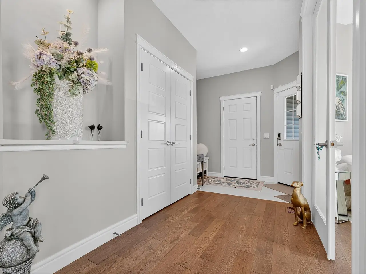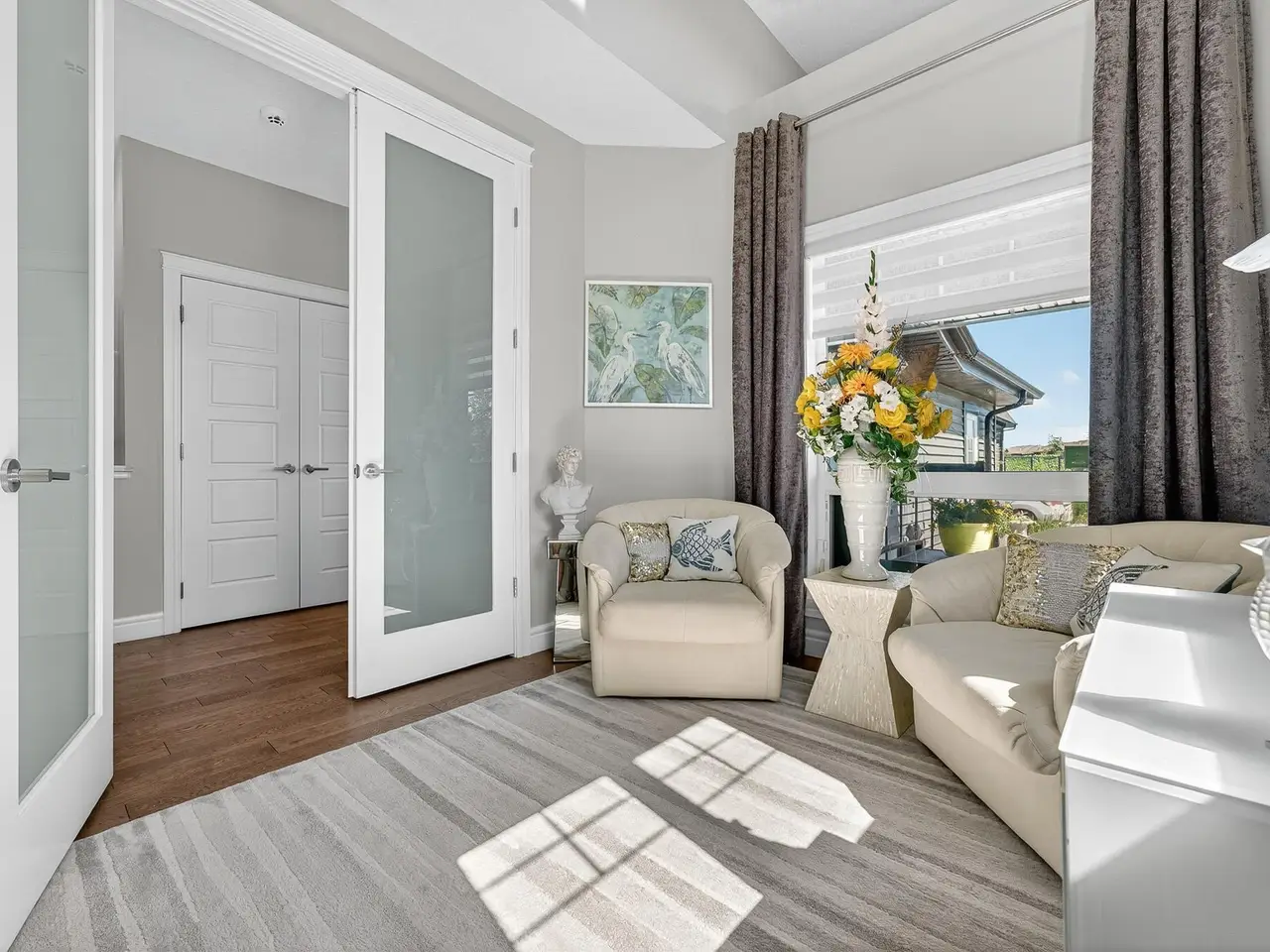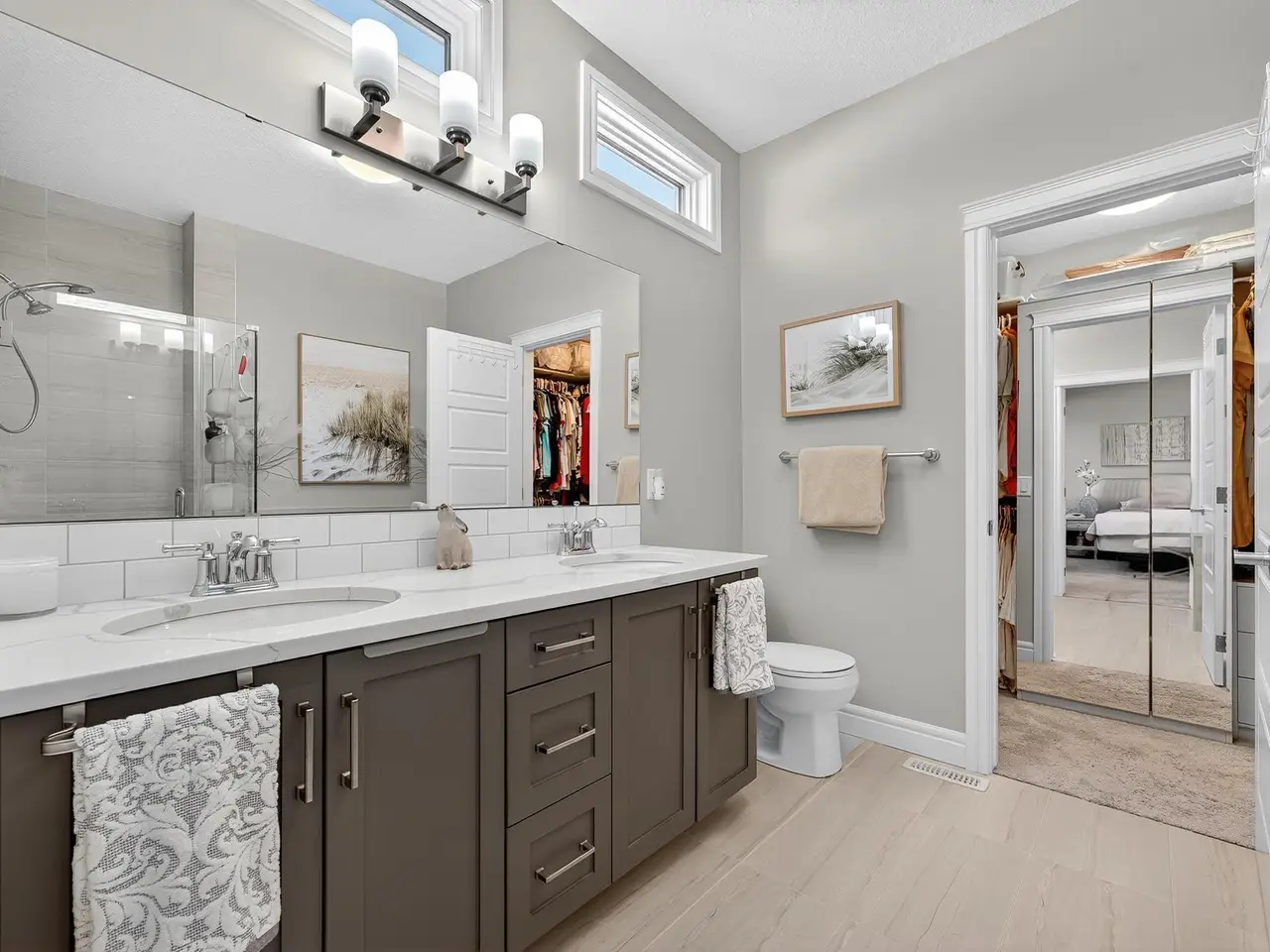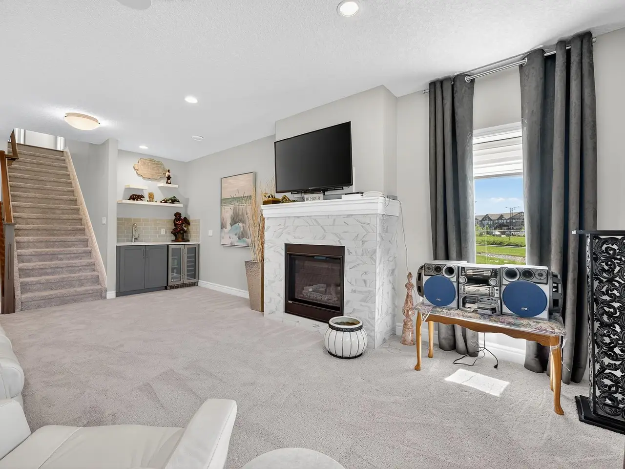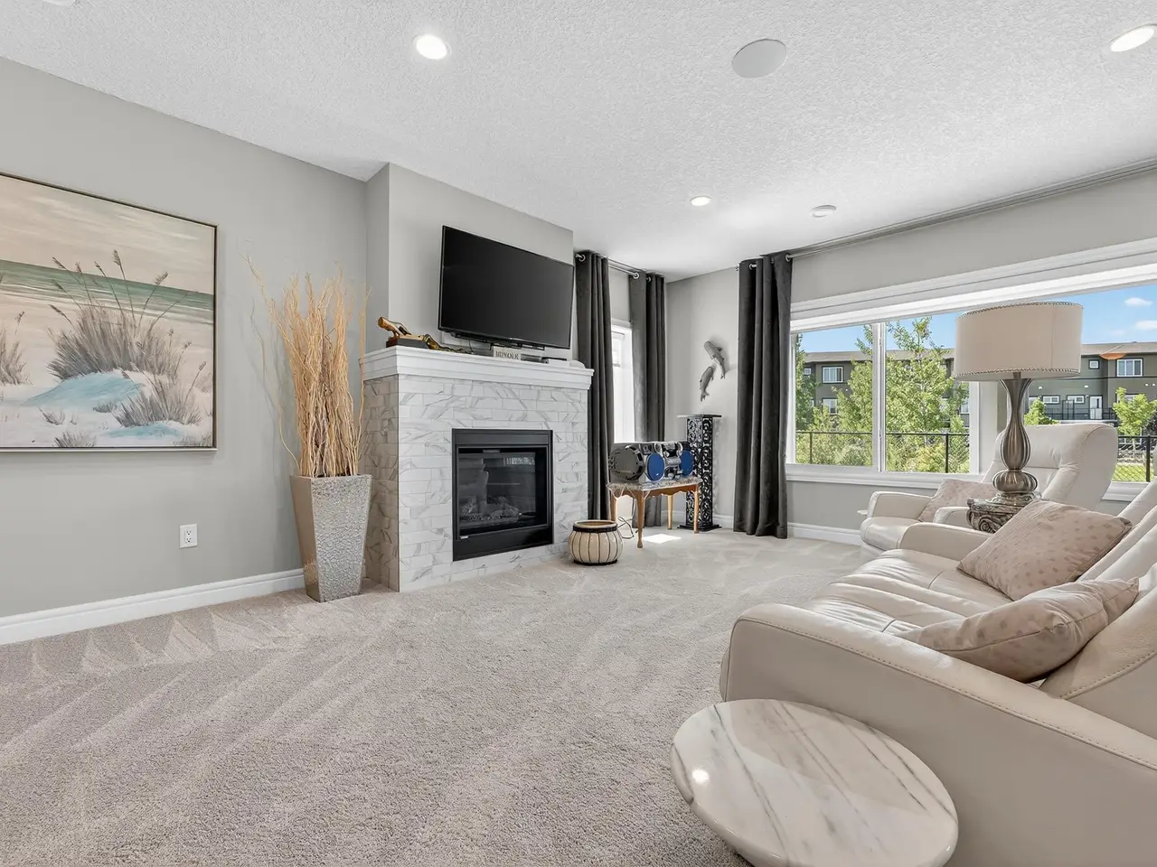 Experience elevated living in this exquisite former showhome in the Vistas at Orchards—a rare walkout bungalow offering 2,600+sqft of designer-crafted space with private southwest exposure backing a scenic walking path. From the soaring entry to the rich engineered hardwood flooring, iron railings, and expansive triple-pane windows, every detail exudes sophistication. The chef-inspired kitchen features floor-to-ceiling cabinetry, quartz counters, and high-end built-in appliances. Relax by one of 2 elegant fireplaces or step onto the sun-drenched deck with glass railings. The luxurious primary suite offers a spa-like 5-pc ensuite and walk-in closet. The finished walkout basement includes 2 bedrooms, second den, rec room, bar area, and a full-width concrete patio. Complete w/Bose built-in speakers, air conditioning, custom drapes, heated double garage, and maintenance-free living. Enjoy exclusive access to trails, schools, parks & easy connectivity to shops and major routes to the city.