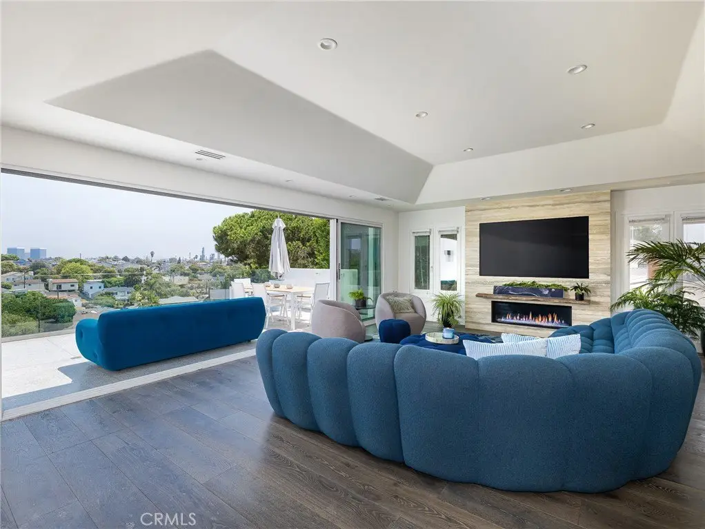 Perched on one of El Segundo’s most elevated and sought-after streets, this fully updated Mediterranean luxury estate sits at the end of a quiet cul-de-sac, offering unobstructed, breathtaking views of the city skyline. With over 4,500 square feet of refined living space, this home was thoughtfully designed for both elegant living and effortless entertaining. Upon entry, you're greeted by a seamless blend of indoor and outdoor living. Both levels feature 16-foot stacking glass multi-slide doors, creating a smooth connection between the sunlit interiors and expansive outdoor terraces. The result is a true entertainer’s dream, where panoramic views and sophisticated finishes set the tone. The first floor offers a media and entertainment space unlike any other, complete with a 97” Samsung TV, embedded Bowers & Wilkins speakers, a handcrafted terrazzo glass bar, sleek fireplace, wet bar, and custom feature wall. Slide open the aforementioned doors to reveal a beautifully remodeled backyard perfect for entertaining. This level also includes a large primary suite with a fully updated bath, a second spa-like bathroom with sauna situated between two spacious bedrooms, and a conveniently located laundry room. Upstairs, the gourmet kitchen—crafted by Euroconcepts of Beverly Hills—features Italian Arclinea custom cabinetry, Sub-Zero refrigeration, Wolf appliances, an espresso bar, floating hood, and sweeping neighborhood and park views. The open-concept layout flows into the stylish living room, anchored by a modern fireplace and opening to an expansive deck—ideal for indoor-outdoor gatherings. The second-floor primary suite is a sanctuary of its own, boasting high-end finishes, a huge walk-in closet, a dedicated laundry area, and an updated bathroom with separate tub and shower. Two additional office spaces and another upgraded full bath complete the upper level. Additional highlights include: central air conditioning throughout, a private elevator, an oversized driveway fitting multiple cars, and two separate garages offering a total of three garage spaces A rare offering with commanding views, cutting-edge design, and exceptional functionality—this estate is a must-see for buyers seeking luxury living in El Segundo.