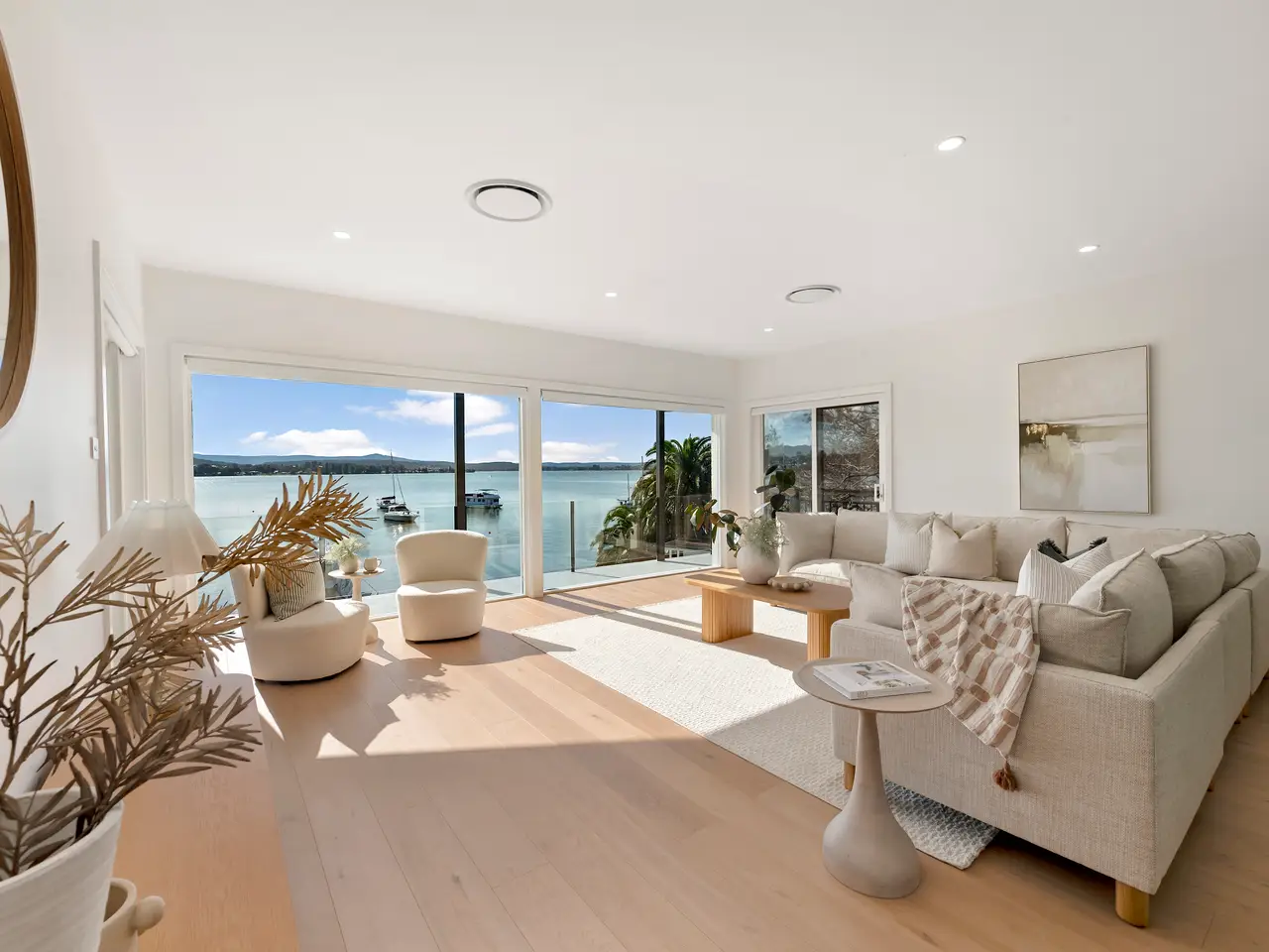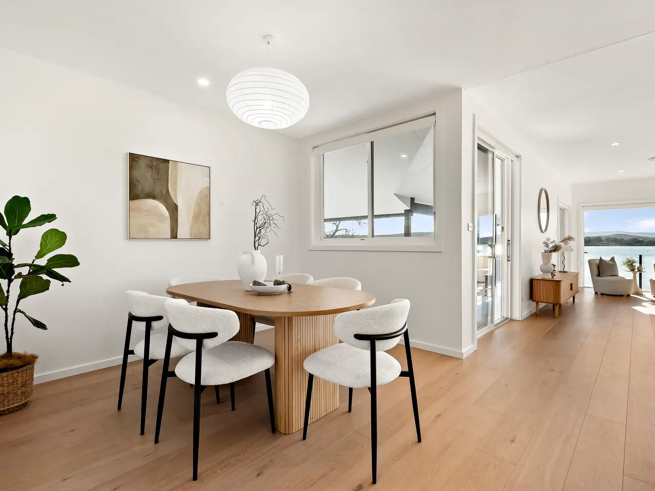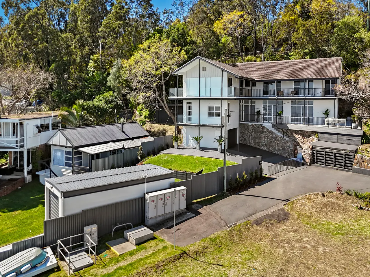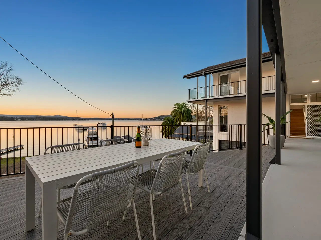 Capturing breathtaking lake views on absolute waterfront, this spectacular residence offers elegant lakeside living in one of Lake Macquarie's most sought-after addresses. Immaculate throughout, the property has been extensively renovated to create a light-filled sanctuary that impresses with its refined sense of style, luxury finishes and expansive layout. Perfectly suited to families seeking space, the home expands over two enchanting levels, where inviting everyday living is accentuated by sensational water views and an effortless indoor-outdoor flow from both living and sleep spaces. Brimming with beautiful alfresco areas you will long to linger in, it is a delight to come home to and a joy to entertain in. Alongside a stunning kitchen and two airy living spaces, there is superb versatility to be found in the studio with kitchenette, sizeable office and fifth bedroom, all positioned on ground level. With Lake Macquarie's sparkling shores lapping at the edges of the backyard, it is the complete package for anyone who loves getting out on the water, whether fishing, boating, kayaking or paddleboarding. In addition to the boathouse, the property boasts a private deep-water jetty, offering one of the select few moorings protected from the southerly wind on the eastern side of the lake. - Next-door property 45 Bareki Road, Eleebana also for sale, offering potential to purchase both residences and maximise lakefront presence - Impeccably renovated split-level home on an absoulte waterfront block set back from street at end of quiet cul-de-sac - Effortless coastal chic elevated by high ceilings, refined neutrals, pale timber floors and plush carpet - Expansive windows and glorious alfresco spaces provide sweeping, unobstructed views over the water - Bright and airy living through reconfigured open-plan on upper level, spilling out onto alfresco space enjoying lake breezes - Fabulous new kitchen flaunts huge walk-in pantry, sleek stone counters, premium Smeg appliances, inc. new dishwasher, and a breakfast bar bench with waterfall ends - Wraparound balcony connects open-plan and three large bedrooms, including master with new ensuite - New main bathroom features luxe bathtub, walk-in shower, dual vanity and separate WC - Lower level made up of family room, office, fifth bedroom with ensuite, and studio with kitchenette - Lower level also connected by sweeping alfresco space and sparkling lake views - Lakeside boathouse provides storage for all the toys, complete with slipway, WC, outdoor hot and cold shower, access to private deep-water jetty - Additional features inc. freshly painted and new floors and window coverings throughout, new laundry, two new Eco-deck balconies, ducted AC - Plentiful parking provided on driveway, double garage with epoxy floors, and single carport - Situated within a friendly and social local community, with Santa at Rocky Point a standout - Short drive or boat ride to Warners Bay and Belmont for lakeside cafes, supermarkets and conveniences - Zoned for Eleebana Public and Warners Bay High, access to Newcastle Grammar bus We have obtained all information used in the preparation of this document from third party sources however, we cannot guarantee the accuracy or currency of this information. Prospective purchasers and their advisors are advised to carry out and rely on their own enquiries and investigations in relation to the information in this document and the property it concerns.