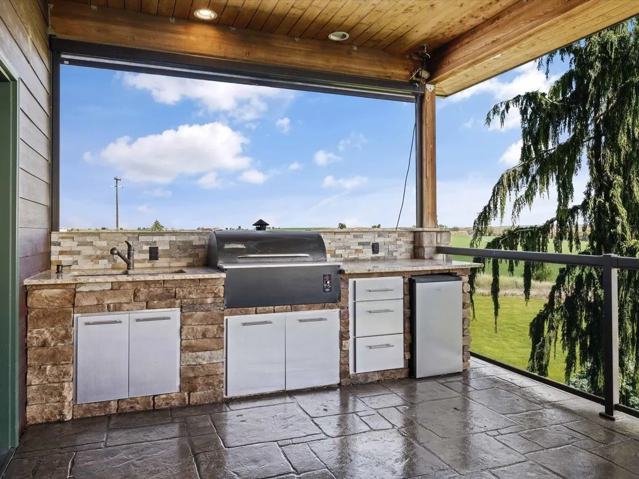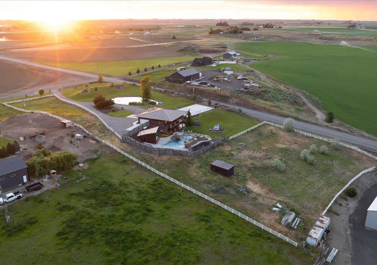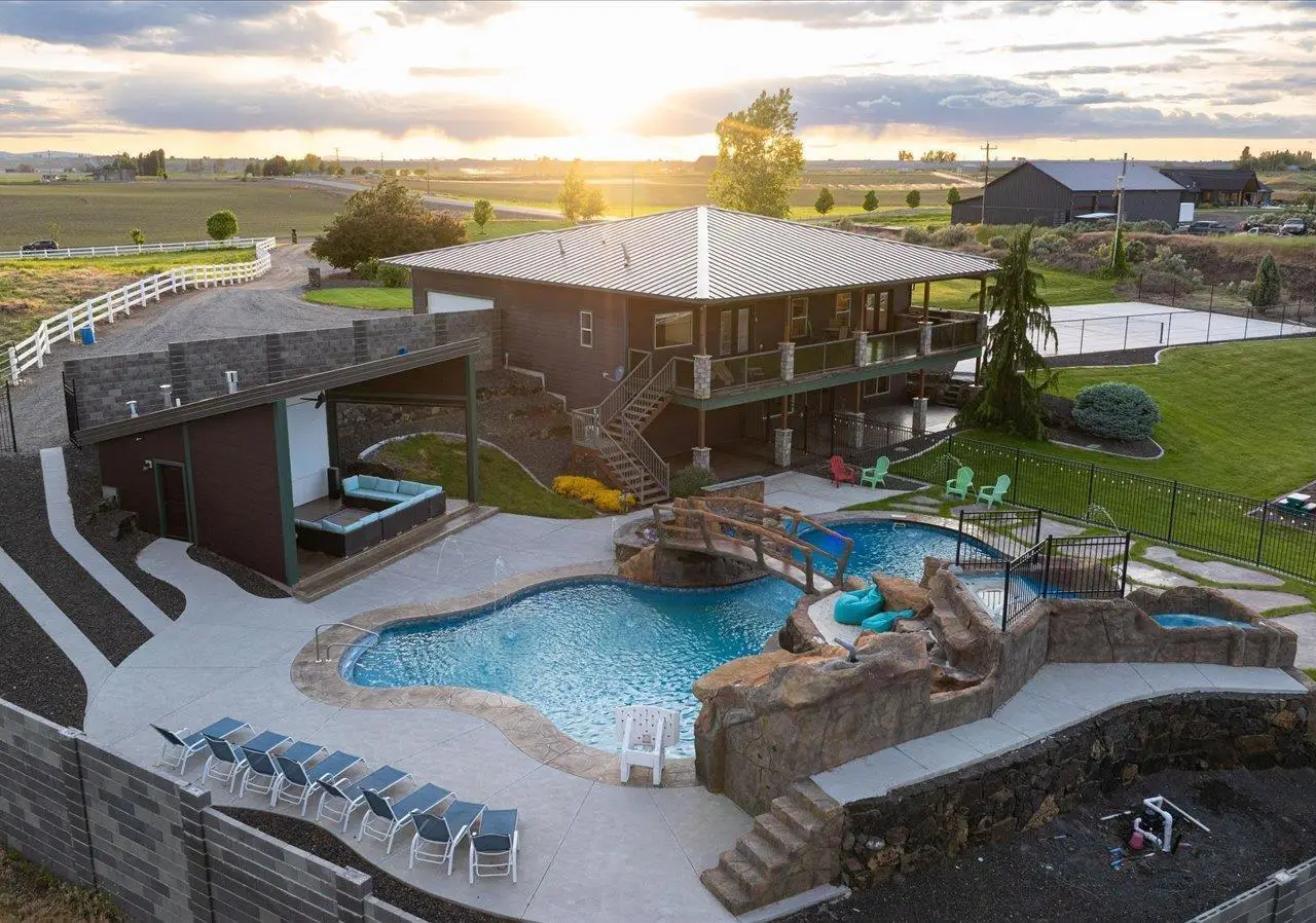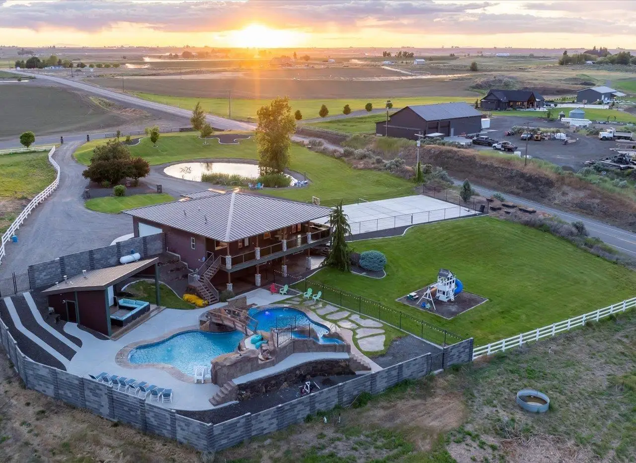 Presenting this exclusive premier listing – Discover unparalleled privacy and resort-style living just 12 minutes north of Pasco, Washington. Nestled on 4.34 acres, this extraordinary 4-bedroom, 5-bath estate offers 3,356 sq ft of luxury and functionality, thoughtfully designed for upscale entertaining and everyday comfort. The open-concept kitchen and living area exude modern elegance with an oversized granite island, brand new built-in fridge/freezer, large pantry, Venetian plaster ceiling, custom millwork, and ambient LED up-lighting. The main level features a versatile bedroom or office, full bath, and spacious laundry/mudroom with oversized sink. The massive primary suite is a private retreat with French doors opening to the outdoor oasis and covered patio, a large walk-in closet, and a spa-like en-suite with self-heated two-person Jacuzzi tub, dual showerheads with rain feature, dual vanities, heated towel rack, and smart TV. The daylight basement continues the luxury experience with stamped and stained wood-look concrete floors, two additional bedrooms (one with walk-in closet), full bath, game room with pool table, and a custom wet bar with sink and luxury cabinetry. The professionally designed theater room includes a half bath, no-touch urinal, climate control, and 8” steel-reinforced safe room. Outdoor living is truly unmatched, featuring a 43,000-gallon lagoon-style pool with swim-up bar, grotto rock waterfall, waterslide, two white sand beaches, bridge, 20+ person hot tub with waterfalls, and a gas fire pit. Additional highlights include a miniature lake with sand beach and firepit, an outdoor amphitheater with 200”+ drop-down screen and built-in bar, and an outdoor bathroom with shower for pool guests. The upper stamped concrete deck offers panoramic territorial views of the Basin and Blue Mountains and includes a custom built-in Traeger grill, outdoor kitchen, sink, and refrigerator. The lower covered patio features outdoor speakers and more stamped concrete for seamless entertainment. A newly added sport court with pickleball and a fully fenced, irrigated pasture for horses or livestock make this property both luxurious and functional. With a private drive, low-maintenance pre-stained concrete siding, standing seam metal roof, and proximity to schools, highway access, and Country Mercantile nearby, this one-of-a-kind estate is a rare opportunity in the Tri-Cities.