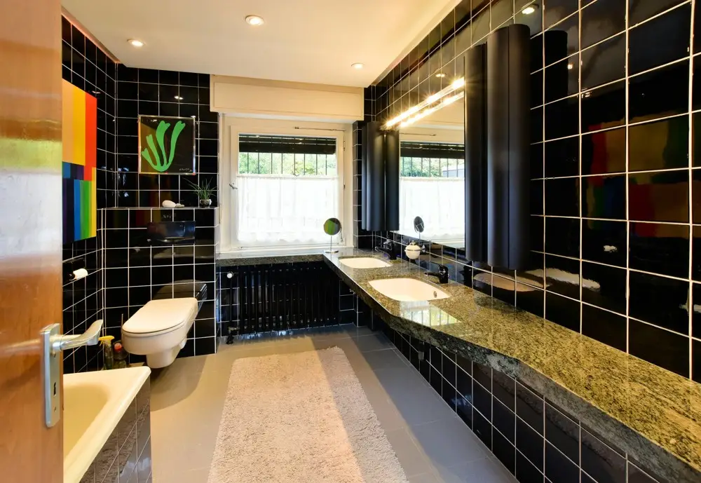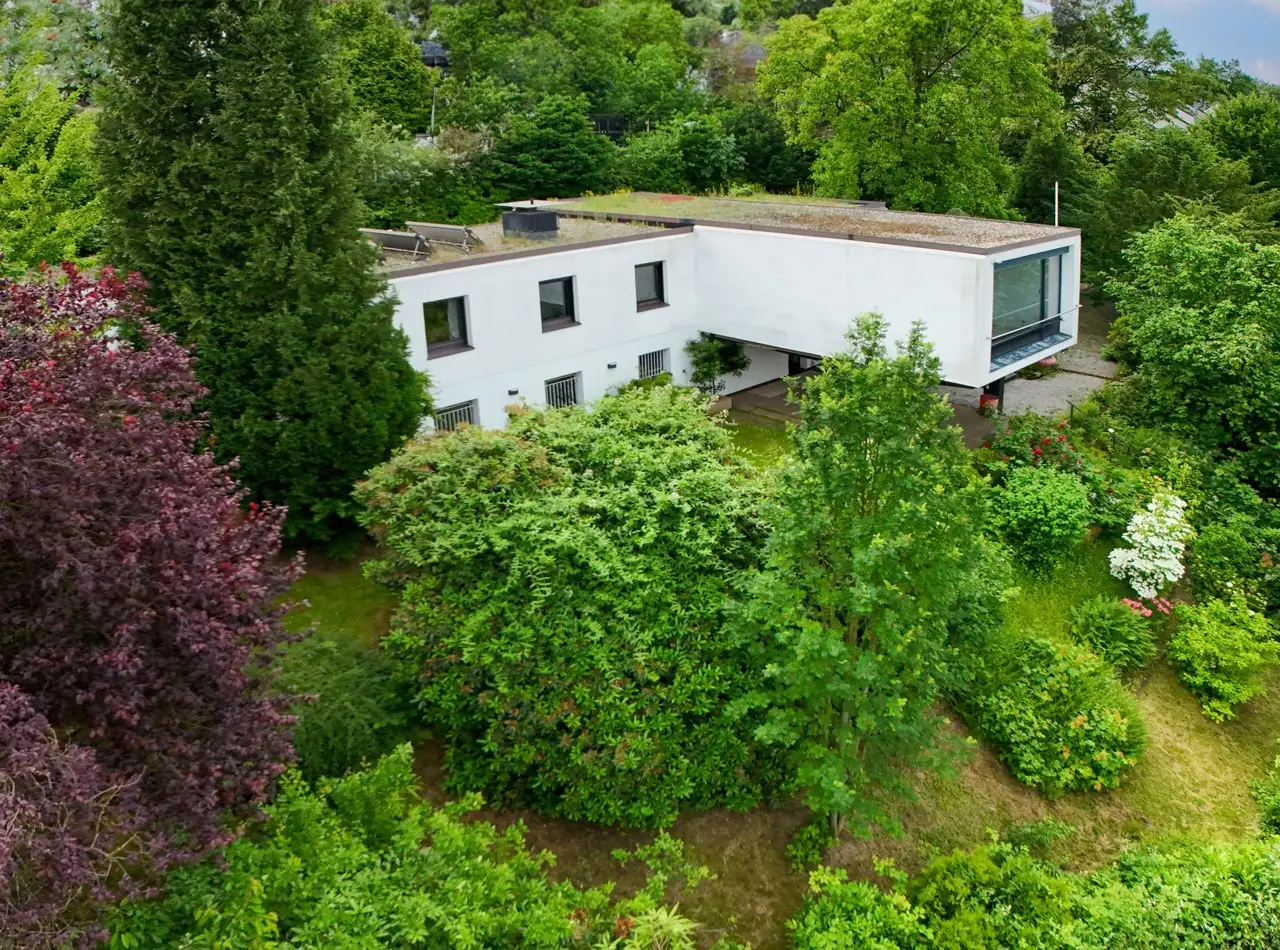This impressive property in Essen Kupferdreh was built in 1956 in a cubic architectural style and will delight you with its individuality and phenomenal views over the Ruhr Valley. The property, known in Kupferdreh as the “TV House”, is located in a quiet residential area on a slight slope, is surrounded by greenery and offers you a lot of privacy. On two floors with a total living space of approx. 188m², the unusual architectural style and the resulting special room layout give you many options to design your home absolutely individually. A beautifully overgrown access path from the main street takes you to the forecourt of the house where there is a large double garage. The entrance to the house with its wide glass front is very inviting and lets a lot of light into the large hallway, which you can use in a variety of ways as a central room. Design your dining area here or expand the room into the living room with very little effort. On the left there is a guest toilet, cloakroom and kitchen with an attached pantry, straight ahead it takes you to the highlight of the house. Here, in a building that protrudes far to the front, is the “free-floating” living room with a window front across the entire width. From here you can enjoy an unobstructed panoramic view and can create your feel-good area on approx. 35 m² of space. You can find a visualization suggestion for setting up in this exposé. You can also enjoy the sun on this level of the house, because from the living room you can access a small balcony with an awning and stairs to the garden, which you can of course also reach via other entrances. In the right wing of the approx. 124 m² upper floor there is also a bedroom, a bathroom and a study. The basement has around 64 m² of living space and offers four rooms, one of which has access to the garden and patio, a shower room, two storage rooms and a boiler room with laundry room. The rooms can be used flexibly as a study or bedroom as well as a guest or hobby room. A solar system on the roof supplies you with hot water and an alarm system reliably ensures your safety. The property is in good condition, but requires extensive modernization (e.g. bathrooms, heating, floors) and thus offers you the opportunity to implement your individual wishes. Design this extraordinary house according to your ideas and make it your feel-good home. Architectural style, location, view and the beautiful garden with its special trees and plants, a covered terrace and a lawn with plenty of space to relax and play will delight your family. Would you like more space? An expansion of the living space could be created by building another floor and a roof terrace with a spectacular view. If we have aroused your interest, we will be happy to provide you with further information and to arrange a viewing appointment.