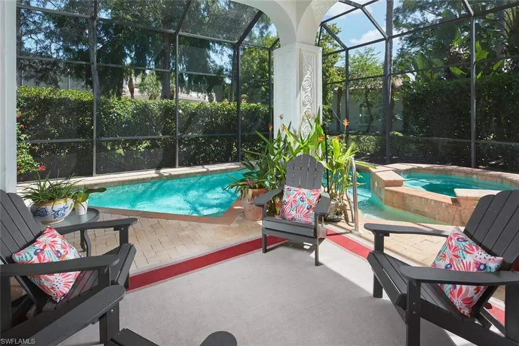 Exceptional Villa in Las Palmas at The Colony - A Private Oasis of Luxury Tucked away in the exclusive and romantic enclave of Las Palmas at The Colony, this charming villa offers the perfect blend of elegance, privacy, and resort-style living. Featuring three spacious bedrooms, each with ensuite bath, plus a convenient guest bathroom, this villa is thoughtfully designed with soaring 14-foot volume ceilings. Every detail speaks of quality and care-from the crown moldings and 12" baseboards to the classic tile flooring and wood plantation shutters. The gourmet kitchen is boasting a gas range, stainless steel appliances, custom banquette seating, and a breakfast bar-ideal for casual meals and entertaining. Step outside to your own private tropical oasis featuring a sparkling plunge pool-perfect for relaxing or hosting guests. This home has been meticulously maintained, with recent upgrades including a new roof, fresh interior and exterior paint, and a whole-house generator for peace of mind. A whole house generator, new roof installed in 2020. As a resident of The Colony, enjoy exclusive access to The Bay Club, offering both fine waterfront dining and relaxed sunset entertainment. The community also features world-class amenities such as a private beach park accessible by water taxi, tennis, pickleball, bocce, kayaking, canoeing, and sailing. All this, just minutes from upscale shopping, dining, and only 15 minutes to the airport. Don't miss this rare opportunity to own a true gem in one of Southwest Florida's most sought-after communities.