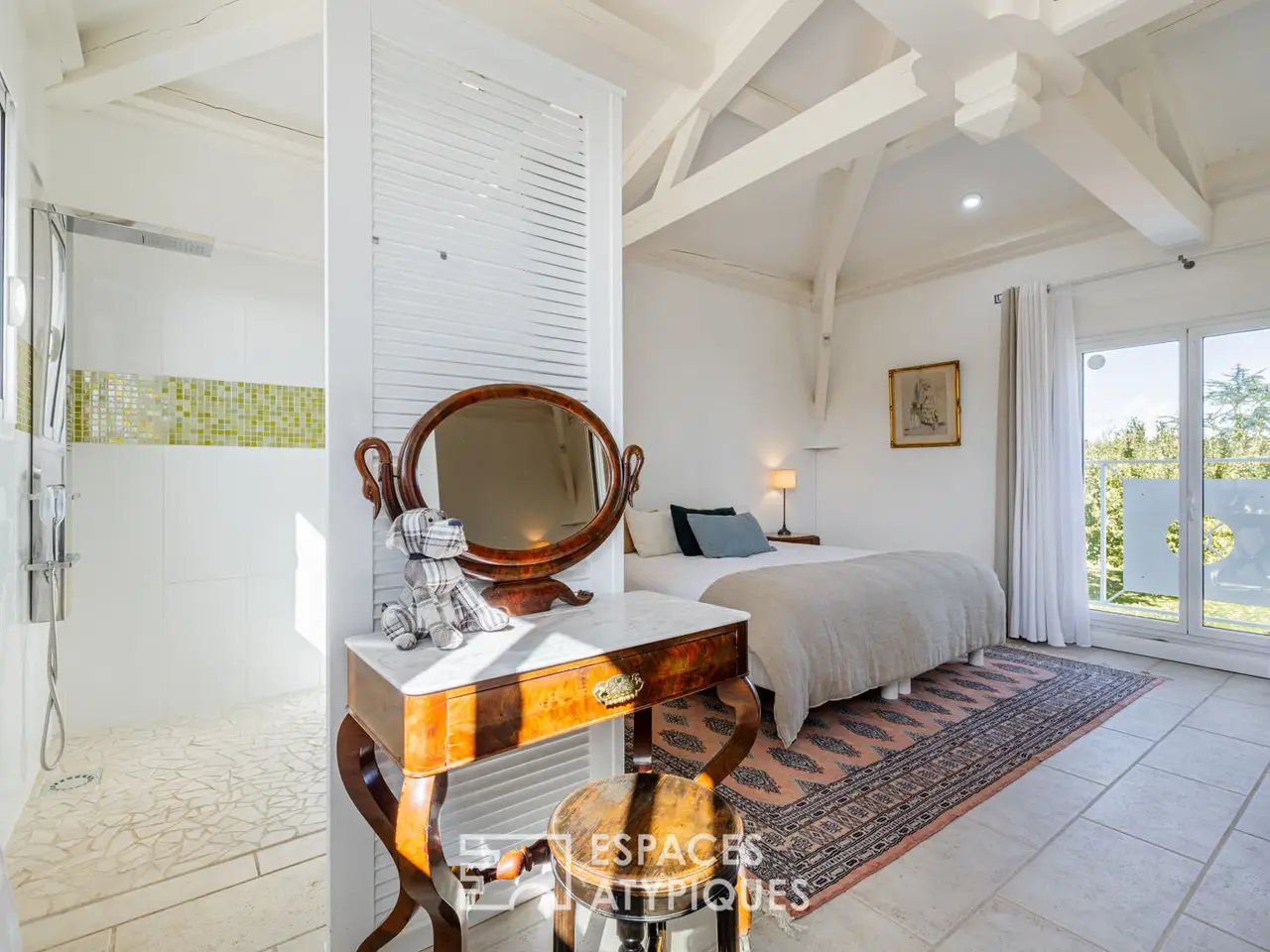Located in the town of Etaules, in the heart of the Arvert peninsula, not far from the Marennes Oleron oyster basin and the majestic Courbre forest, this 2001 property, in the heart of a residential area, seduces with its exceptional architecture. Inspired by Californian villas with taut and contemporary lines, in the heart of a park of more than 6500 m2, it exudes with its approximately 303 m2, a unique elegance, worthy of the bold creations of LAUTNER and SAARINEN. From the majestic entrance of the villa, with its glass patio and dressing room reserved for guests, the spectacular living room of approximately 103m2 captivates and subtly plays with the differences in levels. The plunging view of the park, a real palm grove, offers a unique perspective on this green setting. The semi-buried living room, perfectly aligned with the waterline of a 20x8m infinity pool, opens to the outside thanks to XXL bay windows, allowing abundant light. The high ceilings, combined with a south-facing exposure, bathe the space in exceptional clarity. Three steps higher, the kitchen, custom-made with a central island is completed by a veranda converted into a back kitchen-laundry room facing a vegetable garden and a 2,500 sqm orchard completing the 360 ° view. This space constitutes a friendly workshop for the mistress of the house, where family and friendly receptions are easily organized in all seasons. An exceptional living environment designed to enhance every moment. With its five bedrooms, four of which are located on the ground floor, this villa offers incomparable comfort. The right wing accommodates the first guest bedroom, with direct access to the terrace, a private bathroom and separate toilet. In the right wing, the master suite has a wardrobe area, a private bathroom and access to another part of the terrace, where a dining area allows you to enjoy summer evenings in complete privacy. Accessible from the kitchen, two other bedrooms, one of which has a private bathroom, are located near the technical room, bringing a practical touch to this part of the house. A mezzanine, converted into an office, overlooks the vast reception room, creating a cozy and warm space, a true intimate observatory of the entire place. Finally, an elegant staircase starting from the living room leads to the fifth bedroom which also benefits from its own bathroom and toilet, offering each member of the family or guests a comfortable and independent living space. The palm grove brings a touch of exoticism and serenity to the whole, making this place an ideal haven of peace to recharge your batteries. This green oasis lends itself to moments of relaxation with its swimming pool and jacuzzi surrounded by majestic palm trees, as well as various shaded terraces, perfect for summer evenings outdoors. This inspiring architect-designed villa, already captivating with its bold design, is enriched with high-end services for absolute comfort. Resolutely turned towards the future, it is equipped with solar panels that contribute to efficient and environmentally friendly energy management. Advanced home automation ensures smooth and intuitive management of the living space. A secure closed garage and a carport complete the premises. This villa is much more than a simple residence, it is a place of inspiration, where architecture sublimates the art of living. ENERGY CLASS: A / CLIMATE CLASS: C. Estimated average amount of annual energy expenditure for standard use, established from 2015 energy prices: EUR2,146. REF. EALR1732 Additional information * 6 rooms * 5 bedrooms * 1 bathroom * 3 shower rooms * 1 floor in the building * Outdoor space : 6570 SQM * Property tax : 3 600 €