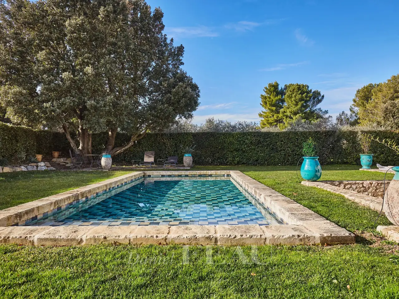 This property built in 2012 with old materials is located in a peaceful residential neighbourhood near the centre of Eygalières. Set in over 1000 sqm of landscaped grounds, it offers 212 sqm of living space including a spacious living/reception room with a fireplace, a bright conservatory with wide patio windows enjoying an open view of the garden, a dining room, an equipped kitchen, a pantry, a utility room, and a master suite with a bathroom and dressing room. Upstairs are three bedrooms sharing a shower room. With a 9x4 metre swimming pool, a fully equipped summer kitchen with a barbeque, a plancha and a fridge, a boules pitch, a wine cellar, and an over 40 sqm garage.