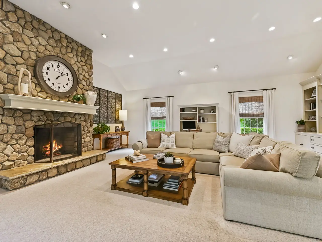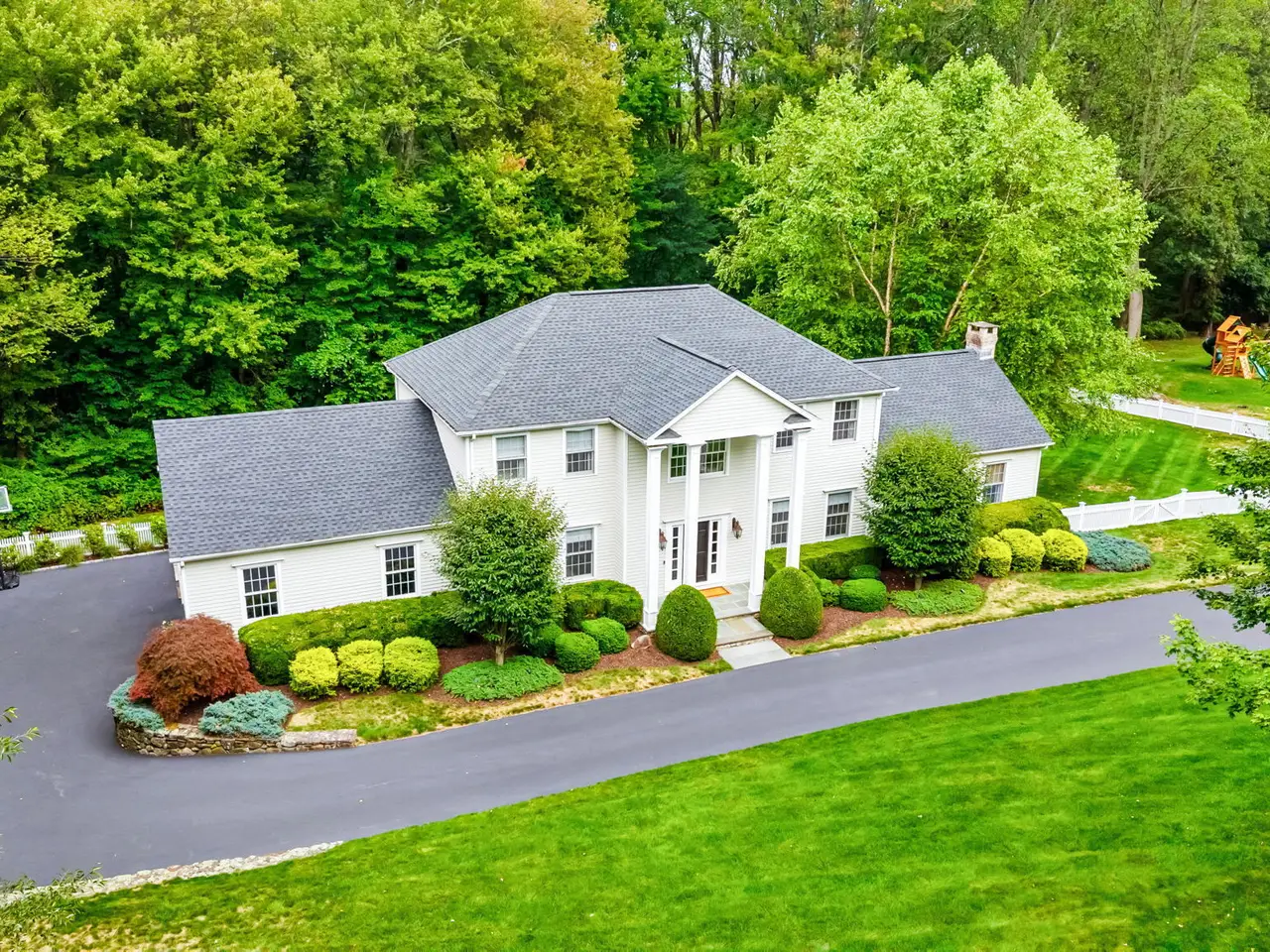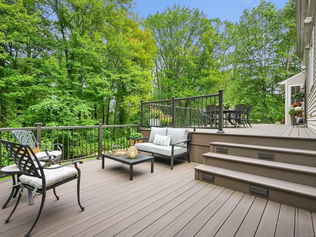 Welcome to this beautifully updated 4+ bedroom Colonial in a sought-after Greenfield Hill neighborhood, surrounded by rolling lawns and tree-lined streets. Offering over 3,000 sq. ft. of elegant living space plus 1,000+ sq. ft. in the spacious finished walk-out lower level, this home provides exceptional versatility and comfort. The grand entryway opens to a formal living and dining room with custom built-ins. The inviting family room, with vaulted ceilings and a natural stone fireplace, flows seamlessly into the impeccably updated eat-in kitchen. From here, sliding doors lead to an expansive Trex deck with a built-in gas grill, perfect for indoor/outdoor entertaining against the backdrop of a serene, private wooded yard. A mudroom, laundry area, and powder room complete the first floor. Upstairs, the tranquil primary suite features a walk-in closet and a spa-like bath with soaking tub, stall shower, and double vanity. Three additional bedrooms and a full bath complete the second level. The finished lower level includes a bedroom/office/potential au pair suite with full bath, ample storage, and walk-out access. Notable upgrades include fresh interior and exterior paint (2025), new roof (2024), remodeled kitchen and primary bath (2023), refinished hardwood floors (2023), and driveway sealing (2023). Meticulously maintained mechanicals and thoughtful updates make this home truly move-in ready.