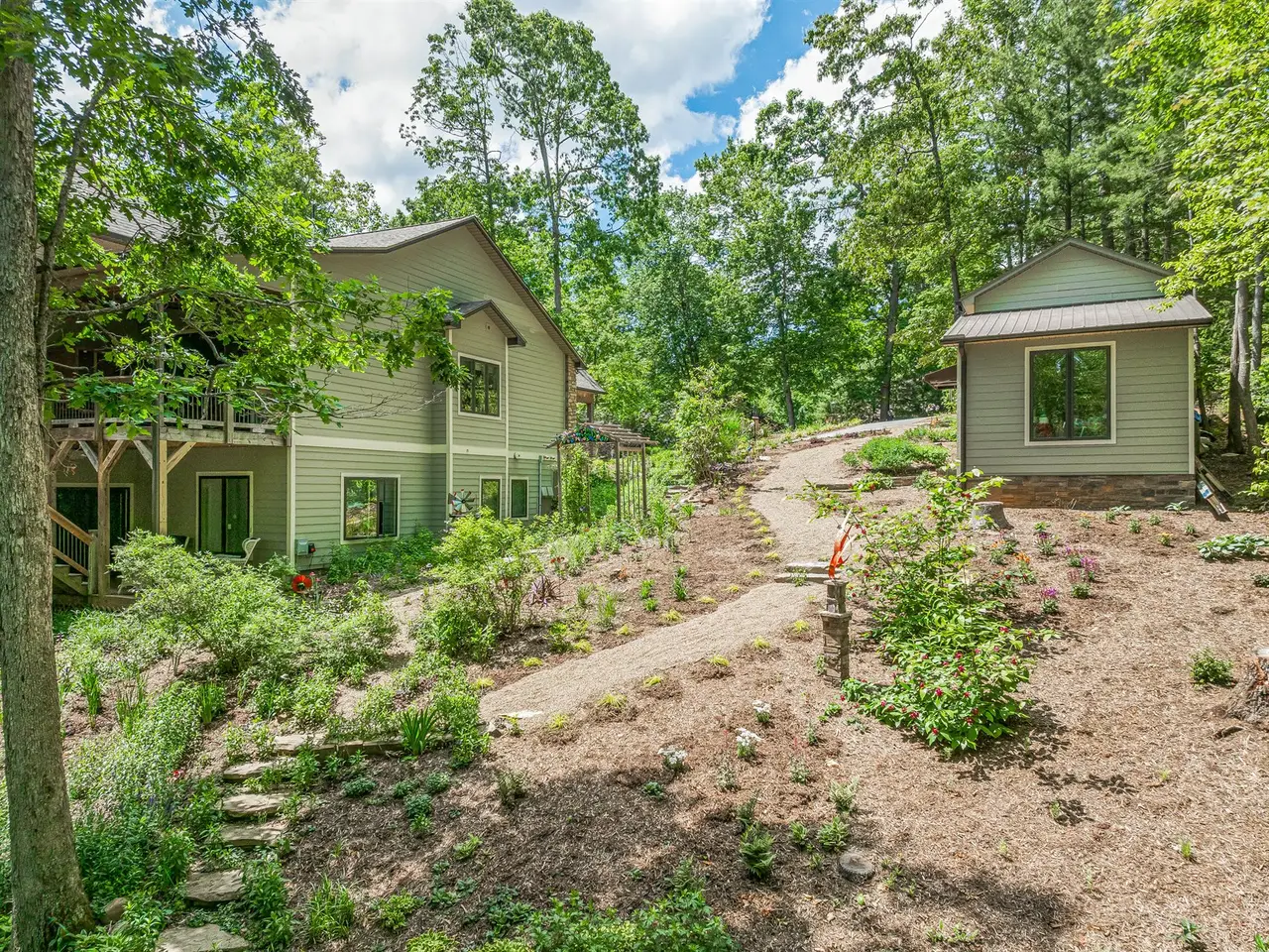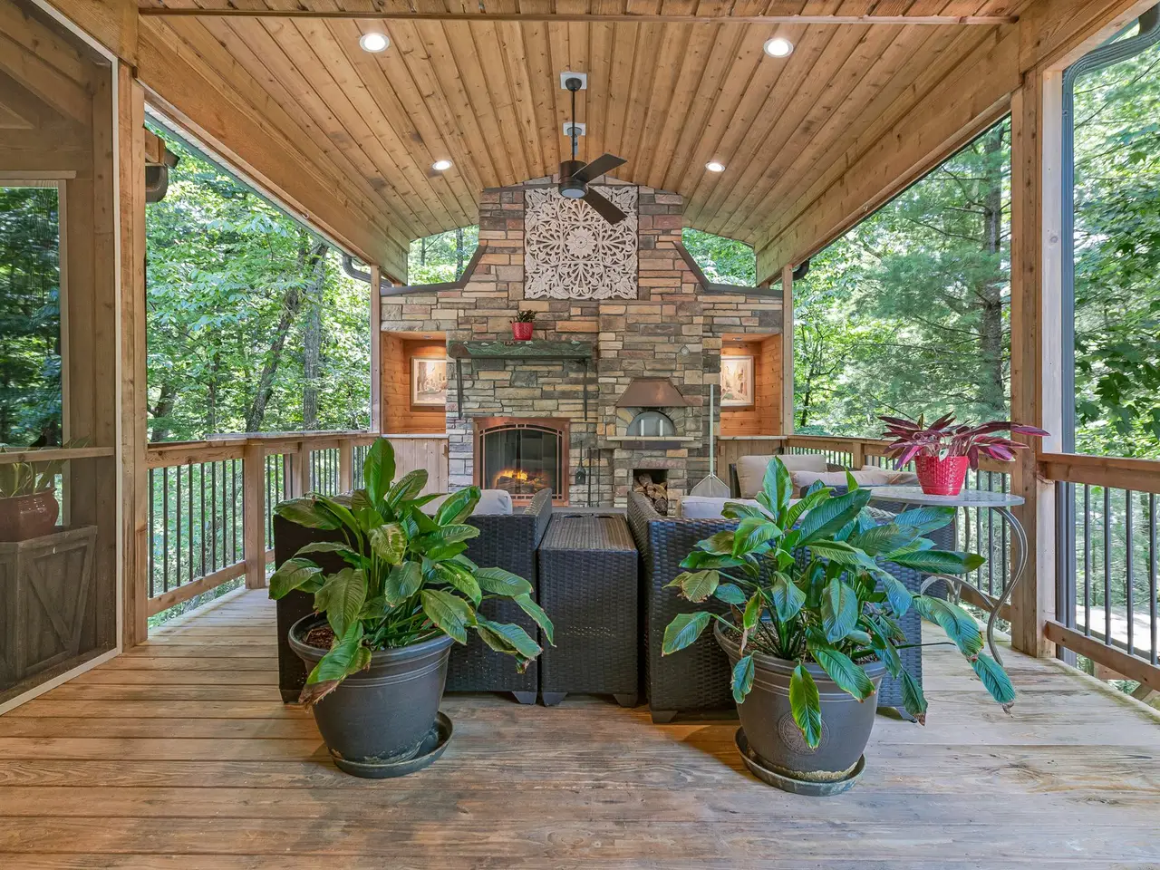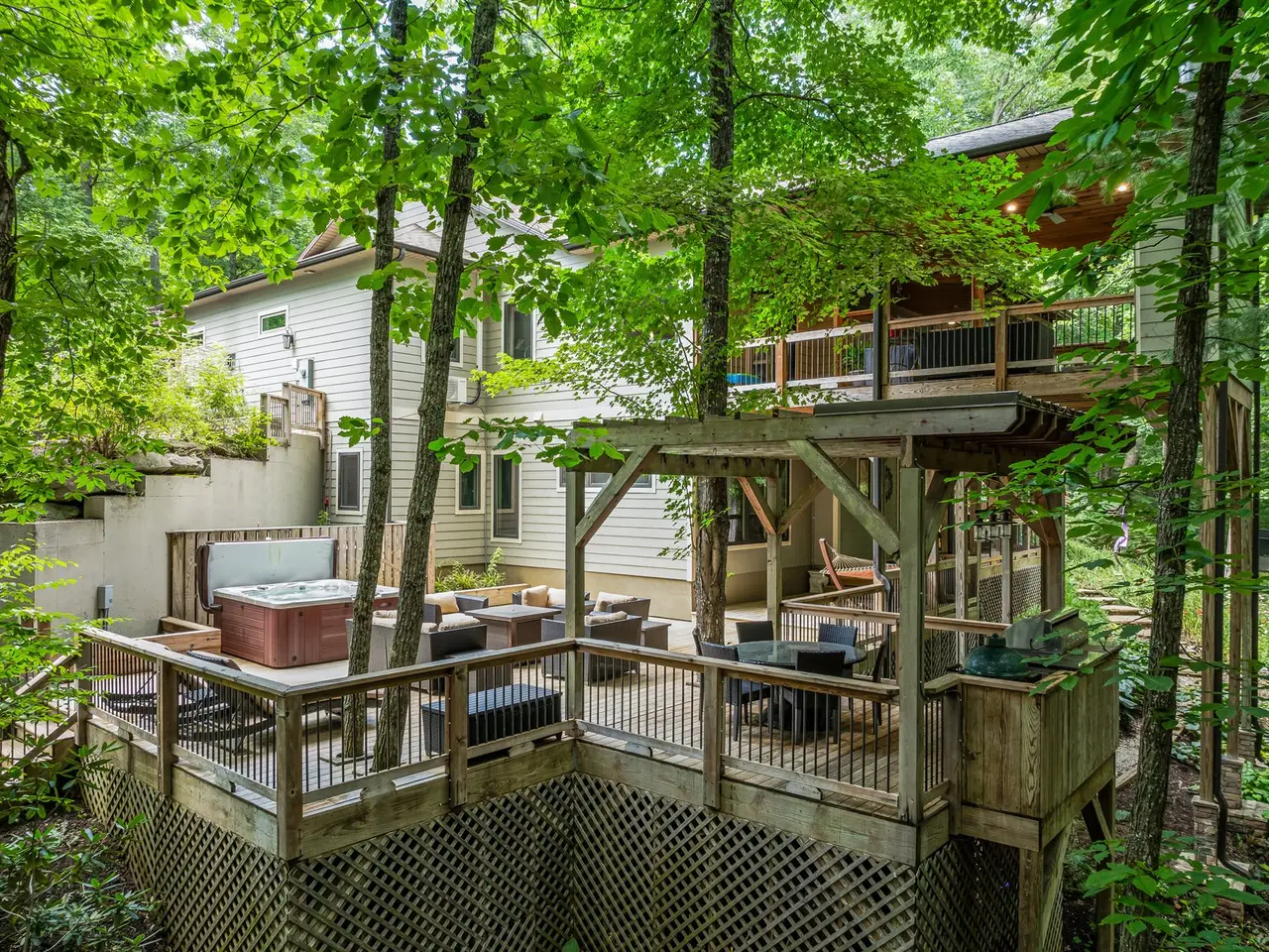 Discover elevated mountain luxury at 105 Blackberry Lane a private retreat where sophistication meets serenity. Enter through a custom arched Italian door into a gallery-style foyer with soaring ceilings and custom lighting. Entertain effortlessly in the chef's kitchen, great room, and music nook and large second living area, or host memorable evenings on the tree-top covered deck with an Earth stone pizza oven and artisan wood-burning fireplace. Enjoy 2,400+ SF of outdoor living with a spa-grade hot tub, pergola grilling area, and forest view firepit deck. The primary suite offers a spa-inspired bath, private balcony, and infrared sauna. Most of the home was updated in 2016, and the separate storage building was also added in 2016. Curated gardens, stone paths, water features, and seamless indoor-outdoor living enhance the experience of this beautiful property. It's not just a home, it's a mountain sanctuary.
