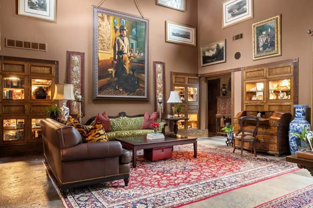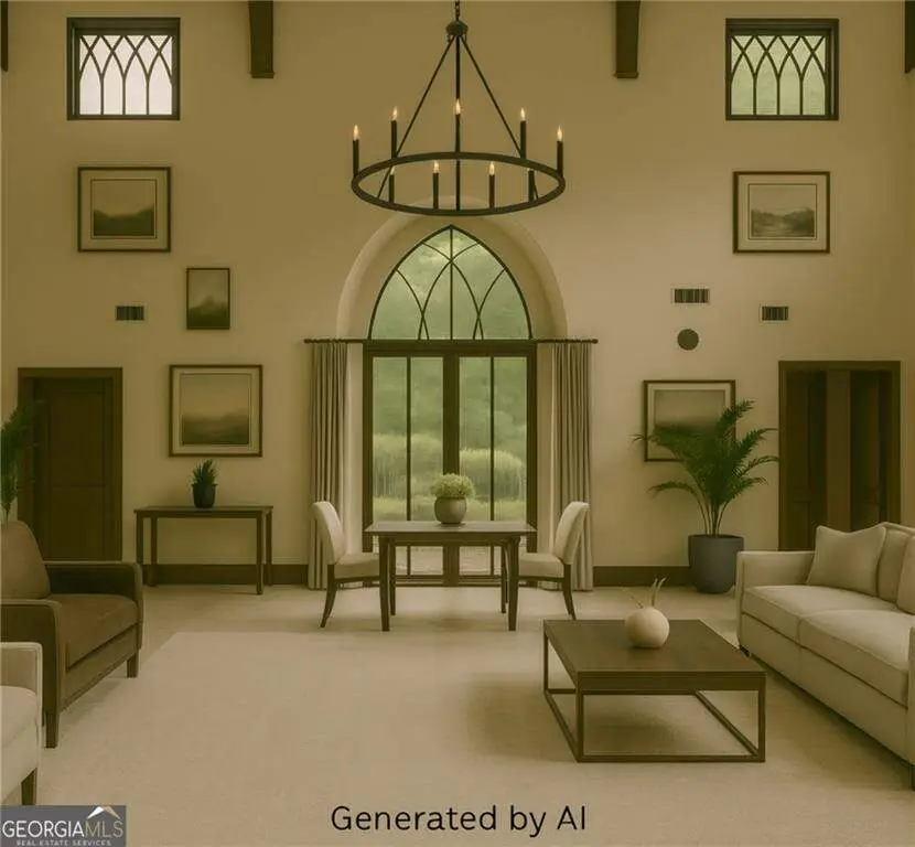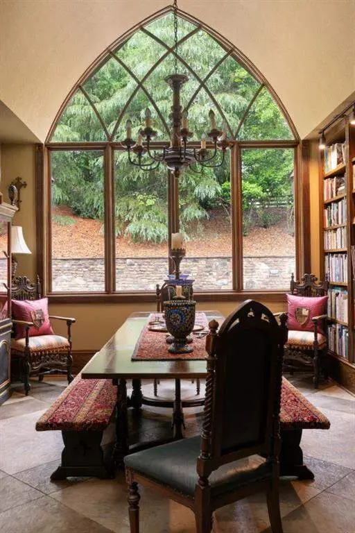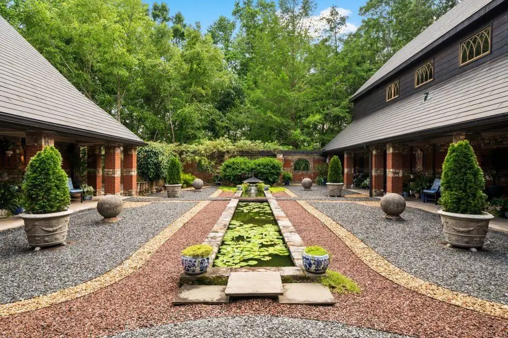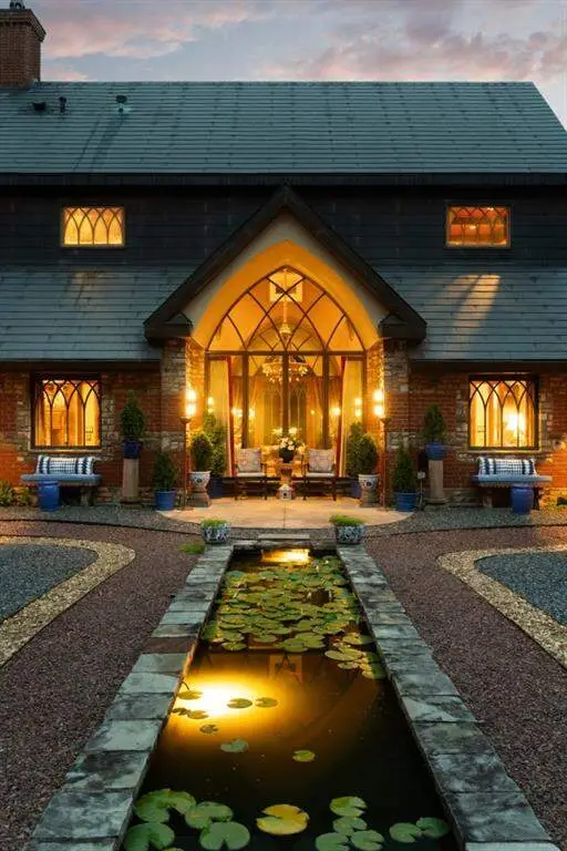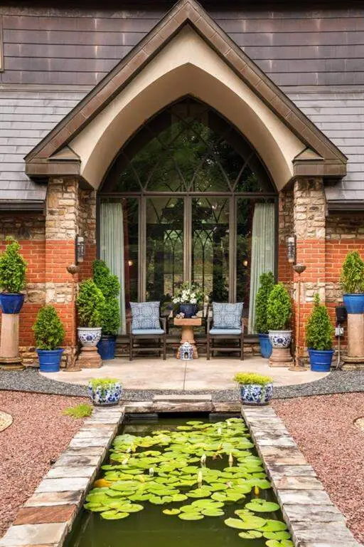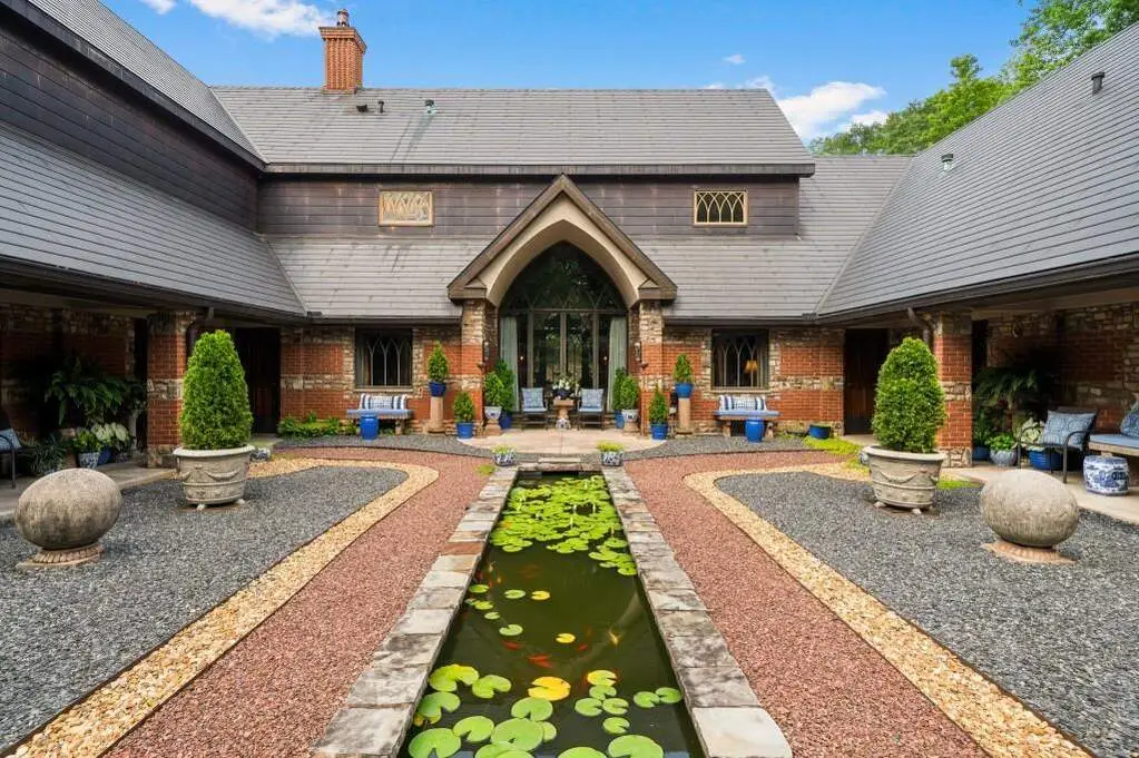 Nestled on approximately 8 private, gated acres, this extraordinary architectural masterpiece blends timeless elegance with luxurious, modern amenities. With 4 bedrooms, 4 full baths, and 2 half baths, the estate is a sanctuary of bespoke design and enduring craftsmanship at every turn. From the moment you arrive, you're greeted by a showstopping copper roof, fascia, and gutters - a stunning and enduring feature that sets the tone for the home's unmatched quality. The maintenance-free exterior offers beauty and peace of mind. Step inside to heated concrete floors on the main level and gleaming hardwoods upstairs, complemented by solid oak doors, hand-cut oak trim, and custom woodwork throughout. The heart of the home is a gourmet kitchen designed for both everyday luxury and effortless entertaining. A Wolf range framed by stone and brick is paired with a striking copper backsplash that echoes the home's distinctive exterior. High-end appliances include a Sub-Zero refrigerator, a separate Sub-Zero freezer, and a Thermador warming drawer. The adjacent scullery and butler's pantry - a caterer's dream - offer custom built-in cabinetry, a wine rack, and generous prep space. The scullery opens directly to the private courtyard, allowing for seamless indoor-outdoor entertaining centered around the stunning 35-foot reflecting pond. The primary suite is an indulgent retreat, offering his and hers separate bathrooms - one with a steam shower - and a show-stopping two-story custom closet complete with a rolling library ladder. A private office with a built-in safe room provides both function and security. Every feature in this home was thoughtfully designed - from the commercial-grade drainage system beneath the surface to the custom cabinetry, antique lighting, and artisan details throughout. Antique European chandeliers, including a grand entryway piece imported from France, add dramatic charm, while locally painted stained-glass windows bring a distinctive artistic touch.
