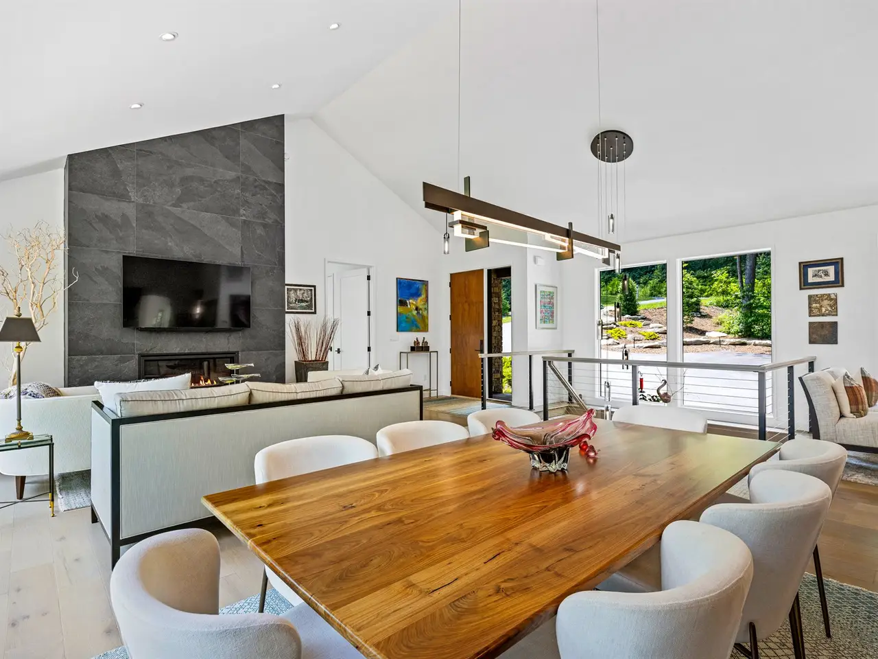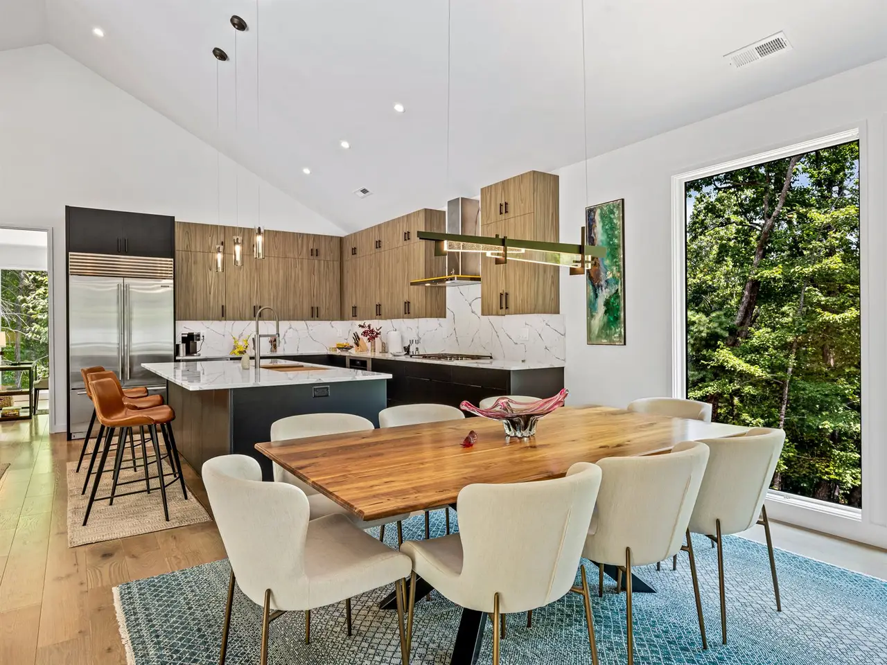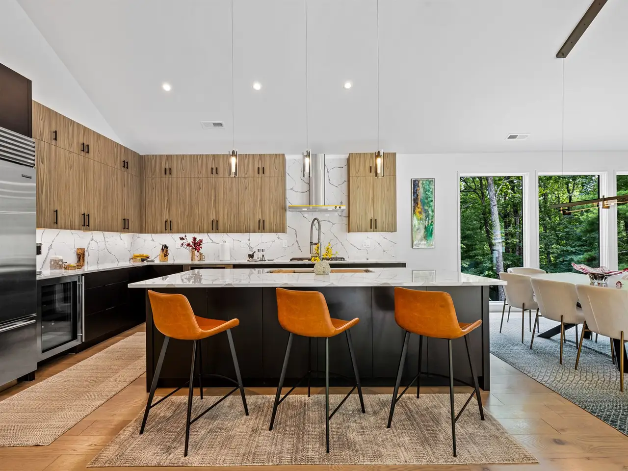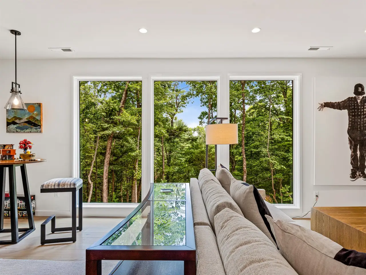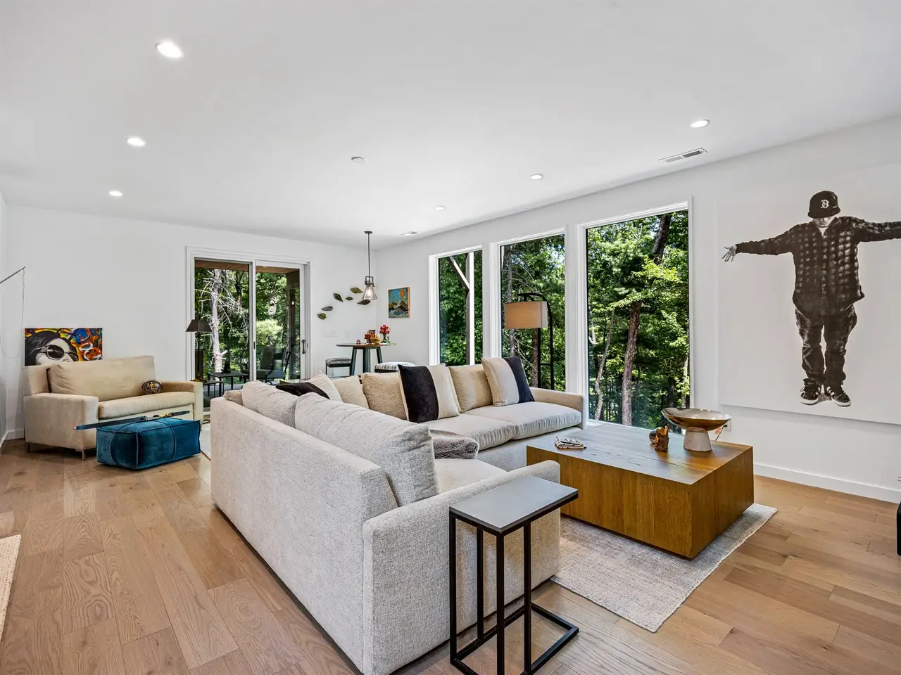 Step into this stunning modern home a true life-size treehouse with unparalleled privacy. The open-concept great room features soaring 18' ceilings and a striking fireplace wall that anchors the space. Walls of floor-to-ceiling picture windows flood the home with natural light while immersing you in nature's serene surroundings. At the heart of the home is a chef's kitchen designed for entertaining, showcasing custom Cabico cabinetry, quartz countertops and dramatic island, and premium SubZero, Wolf, and Cove appliances. Retreat to the home office a serene space for creating or peaceful reflection. The terrace level offers well appointed guest spaces with premium tile and designer finishes. Enjoy comfort year-round with three zoned HVAC one per level and one dedicated to the primary suite and a whole-house Generac generator. Designer lighting enhances each space, adding warmth and ambiance throughout. Blending sleek design with warmth and comfort, this home inspires at every turn.