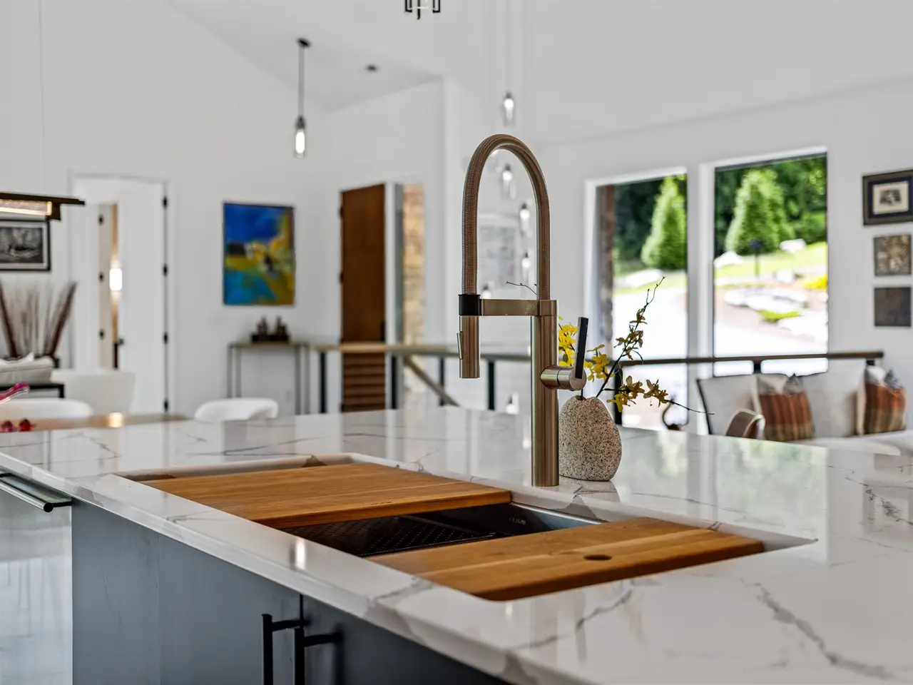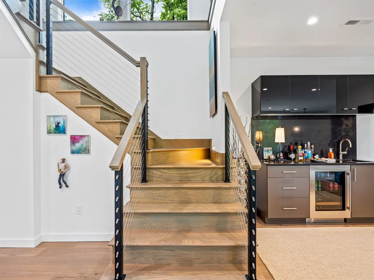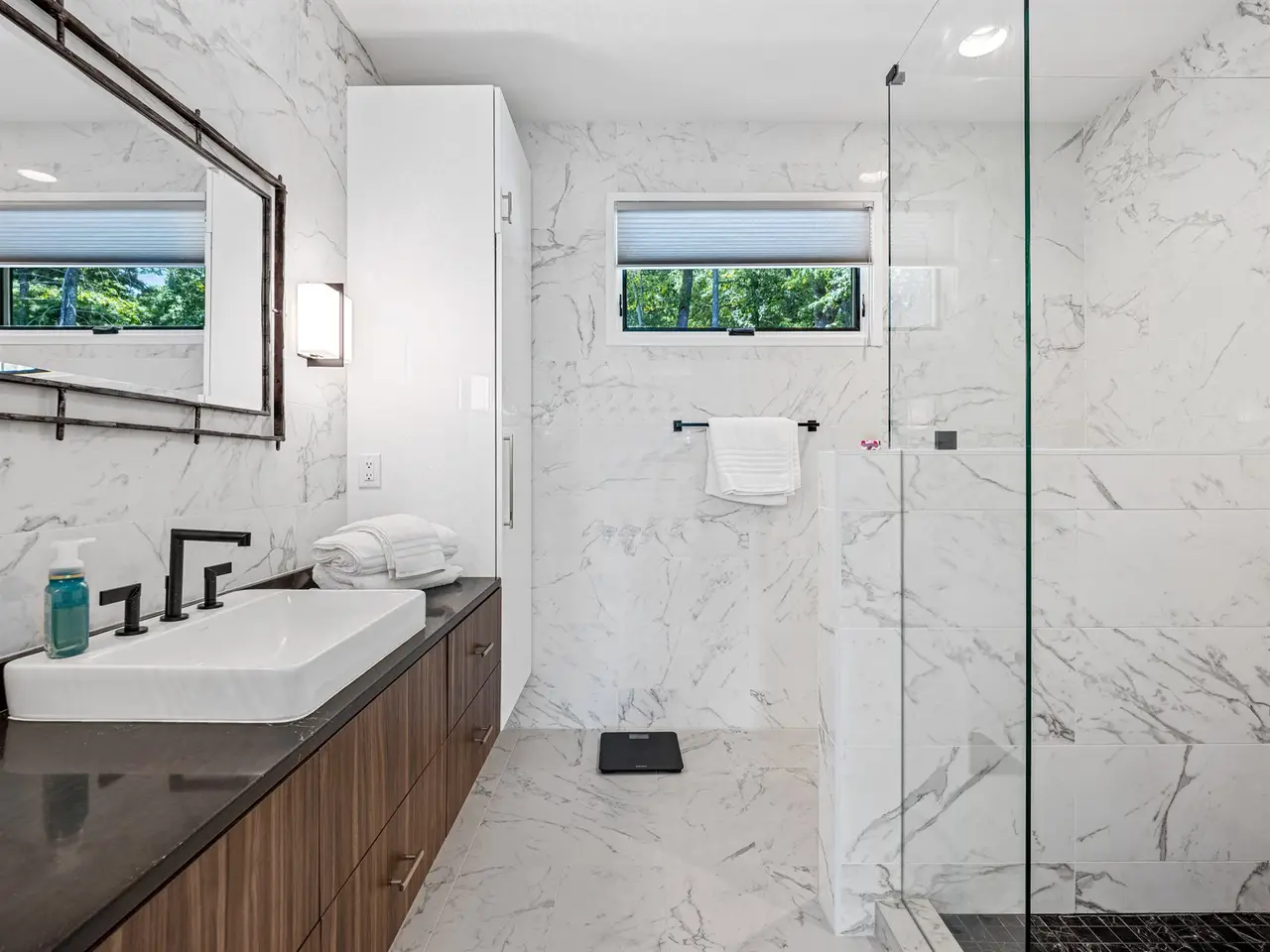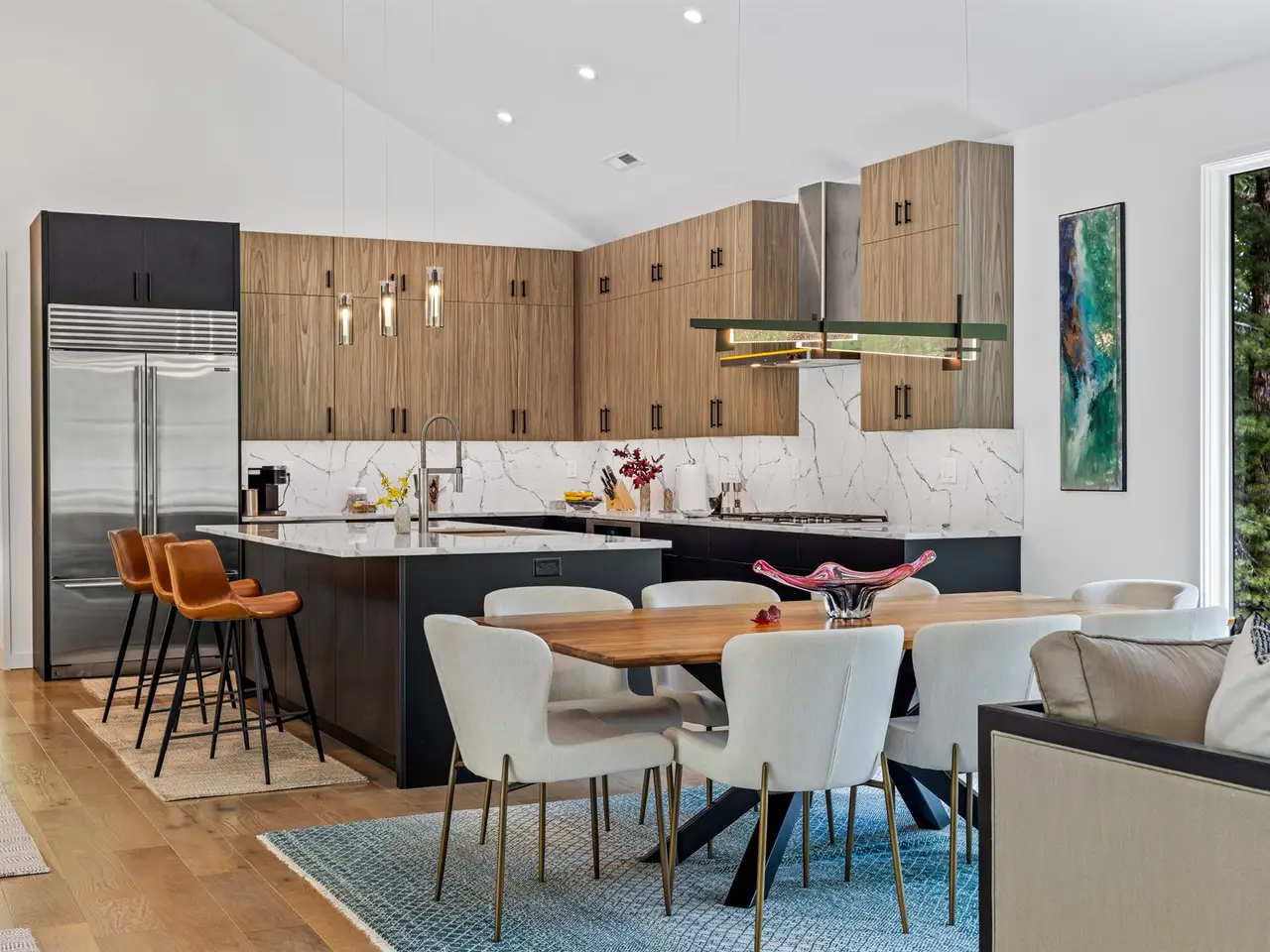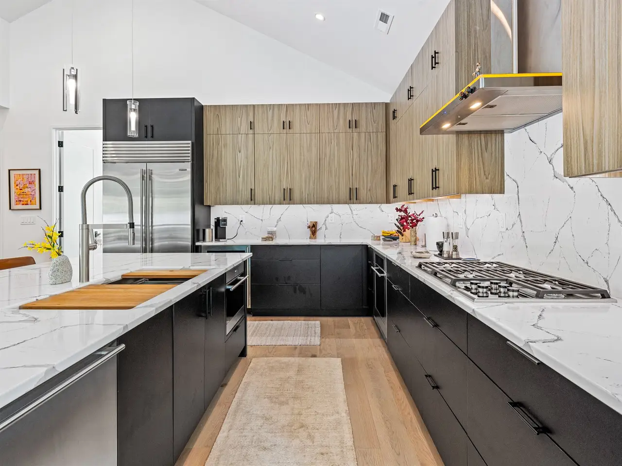 Step into this stunning modern home a true life-size treehouse with unparalleled privacy. The open-concept great room features soaring 18' ceilings and a striking fireplace wall that anchors the space. Walls of floor-to-ceiling picture windows flood the home with natural light while immersing you in nature's serene surroundings. At the heart of the home is a chef's kitchen designed for entertaining, showcasing custom Cabico cabinetry, quartz countertops and dramatic island, and premium SubZero, Wolf, and Cove appliances. Retreat to the home office a serene space for creating or peaceful reflection. The terrace level offers well appointed guest spaces with premium tile and designer finishes. Enjoy comfort year-round with three zoned HVAC one per level and one dedicated to the primary suite and a whole-house Generac generator. Designer lighting enhances each space, adding warmth and ambiance throughout. Blending sleek design with warmth and comfort, this home inspires at every turn.