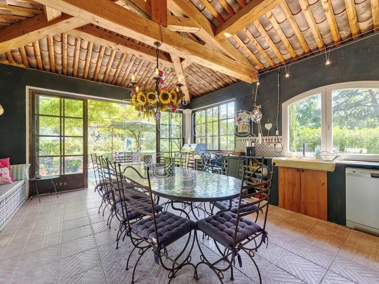 This magnificent 6 bedroom property, located minutes from picturesque Flayosc, offers serene countryside living on 3.21 Acres of land. The elegant house, built in 2000, features high ceilings and interior design of high standards throughout the property. The ground floor includes an inviting entrance, a cozy dining room with adjacent kitchen and 2 spacious living rooms with fireplaces. Upstairs there is a master suite with a dressing room and luxurious bathroom, plus 2 additional bedrooms with a shared shower room.An independent apartment with 2 bedrooms and a bathroom opens up to a patio with Jacuzzi. Connected to the summer kitchen is a guest house with one bedroom that opens up to the garden. The garage/ box offers potential for an additional bedroom.In the garden you enjoy a large terrace with panoramic views of Flayosc, a beautifully landscaped pool area with a pool house and a fully equipped summer kitchen, a fireplace and a large dining table. Meadows are perfect for horses with stables and paddock already on site. There is also a large kennel for dogs. An olive grove with stone-walled terraces completes this enchanting setting, offering endless potential for a small vineyard or other pursuits. The charming village of Flayosc offers everything you need for daily life all year around, and the area has attracted international inhabitants for many years.