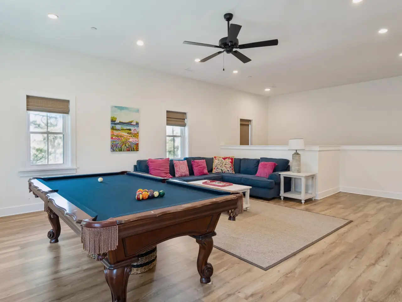 Mimosa Manor is an expansive seven-bedroom, six-and-a-half-bathroom home in the sought-after Sea Breeze Collection on Folly Beach. Designed for comfort, entertainment, and coastal luxury, this newly constructed property offers the perfect combination of space, style, and location. Just a short walk to the beach and Center Street's restaurants and shops, it is ideal as a primary residence, second home, or long-term investment.The first floor features an open-concept living, dining, and kitchen area with high ceilings, abundant natural light, and designer coastal finishes. The gourmet kitchen includes premium appliances, a large island, and a dining table that seats fourteen or more--perfect for hosting gatherings with family and friends.Five king suites feature en-suite bathrooms and private decks, offering privacy and comfort for guests. A spacious game room on the second floor includes a pool table, Smart TV, and cozy lounge area, creating a fun retreat for all ages. The remaining bedrooms include a bunk room with two twin-over-full bunks and an additional guest room with double beds, ensuring plenty of space for large groups. Outdoors, a private heated plunge pool provides year-round enjoyment and is complemented by a screened-in deck overlooking the poolan ideal setting for relaxing in the shade or entertaining. The home also offers private parking for up to seven vehicles, smart-home features, and modern security for convenience and peace of mind. Located just steps from Center Street and a short walk to the beach, Mimosa Manor allows easy access to the best of Folly Beach living. Downtown Charleston is only a short drive away, providing world-class dining, culture, and entertainment within easy reach. Fully furnished and move-in ready, Mimosa Manor combines modern design, energy efficiency, and coastal charm in one exceptional homeperfect for those seeking a luxurious, low-maintenance lifestyle by the beach.