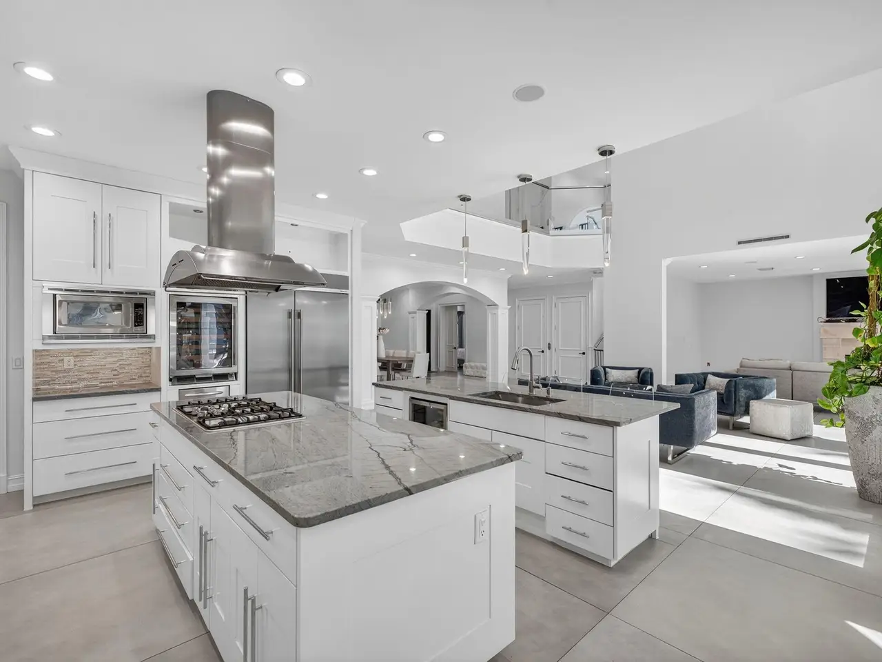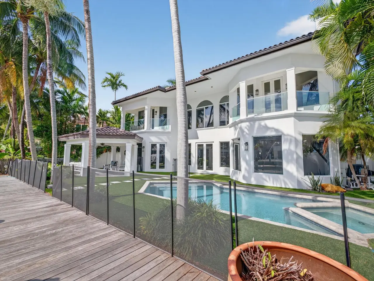 Experience premier waterfront living in Seven Isles! Just 3 lots from the Intracoastal, this meticulously maintained estate features 6 beds/ 7 baths, soaring floor-to-ceiling windows, large porcelain tile floors & a private elevator. The elegant living area includes a fireplace & a newly remodeled gourmet kitchen with double islands, quartzite countertops, SS appliances & a gas cooktop. Perfect for indoor-outdoor living the backyard offers turf, a sparkling pool, outdoor bathroom, sauna, & a private deeded dock. Upstairs, rich wood flooring leads to the primary suite, private balcony, spa-style bath & a second oversized ensuite bedroom. With lush landscaping, a laundry room & numerous upgrades, this home offers resort-style living in one of Ft. Lauderdale's most desirable WF communities!