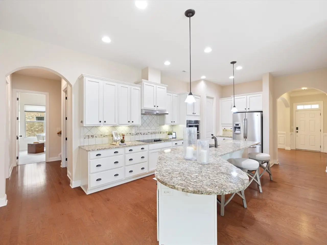 Gorgeous brick & stone home sits on a .3-acre lot w/a 3-car garage & tons of curb appeal. You're greeted by stylish arches, volume ceilings & a welcoming feel thru-out. Designed mostly for easy one-level living, the layout is open & airy w/ plenty of natural light. The kitchen is a true gathering spot?w/ a huge island, custom cabinets, granite, stainless appliances & walk-in pantry. It is open to the family room & dining area, making it easy to cook & entertain. Off the living area is a peaceful screened-in porch that backs up to the trees?perfect for relaxing. Two patios for soaking up the sun or grilling. Main level offers flex space at the entry, two good-sized bedrms & a spacious primary suite w/ double-door entry, a garden tub, dual sinks, tiled shower, soaking tub & a big walk-in closet. Working from home? You'll love the private office tucked in the back for quiet & focus. Right by the garage entry, the mudroom helps keep things neat organized. Upstairs, you'll find a large bonus rm w/a closet, a 4th bedroom & full bath?perfect for guests, hobbies, or movie nights. Walk-in attic storage as well. Location - you got it! Sought after Barber Rock w/ fabulous amenities, SC low taxes yet the conveniences of Ballantyne!